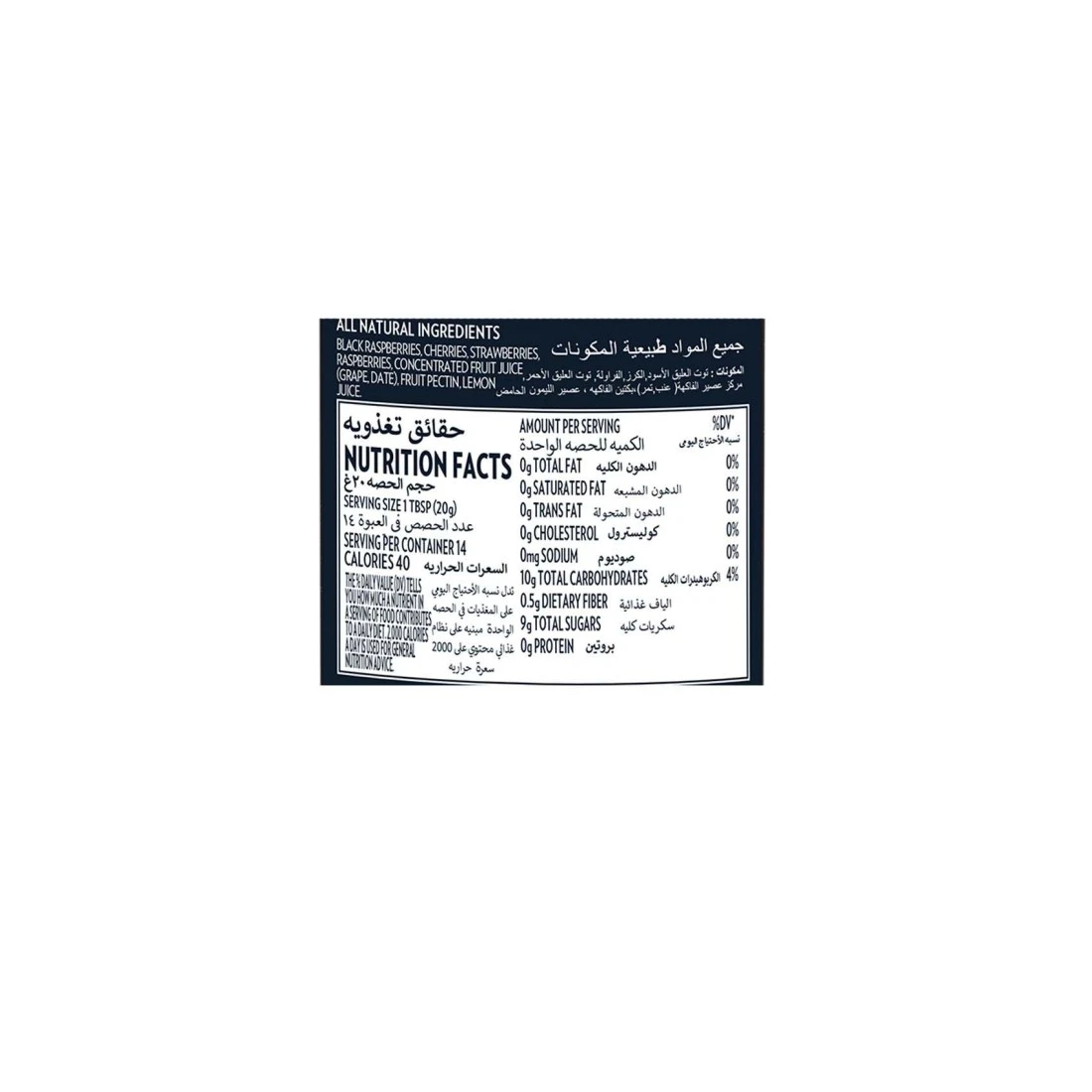 ingredients : Raspberries, Cherries, Strawberries, Blackberries, Unsweetened Grape Juice Concentrate, Fruit Pectin (Gelling Agent).