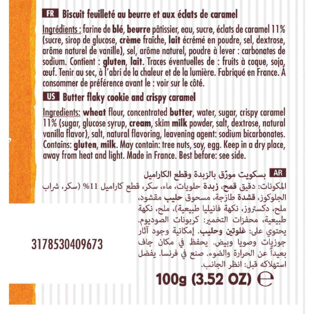 ingredients : Puff Biscuit With Caramel Pieces Ingredients: Wheat Flour 43%, Concentrated Butter 28%, Sugar, Caramel Pieces 13%(Sugar, Glucose Syrup, Fresh Cream, Skimmed Milk Powder, Salt, Dextrose, Natural Vanilla Flavouring With Other Natural Flavourings), Salt, Natural Flavouring, Baking Powder: Sodium Carbonates