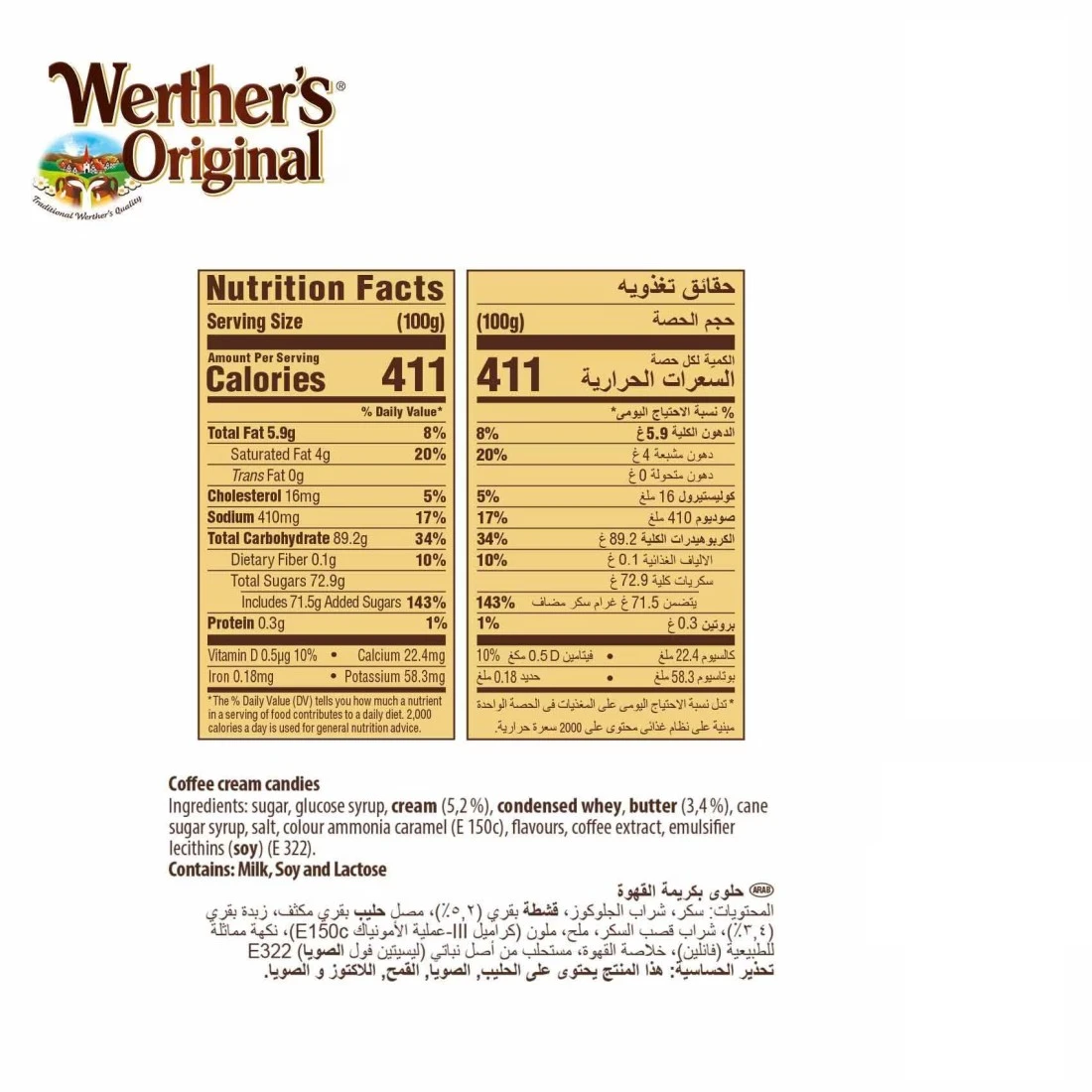 ingredients : Sugar, Glucose Syrup, Cream (5.2%), Condensed Whey, Butter (3.4%), Cane Sugar Syrup, Salt, Colour Ammonia Caramel (e 150 C), Flavours, Coffee Extract, Emulsifier Lecithins (soy) (e 322), Flavour