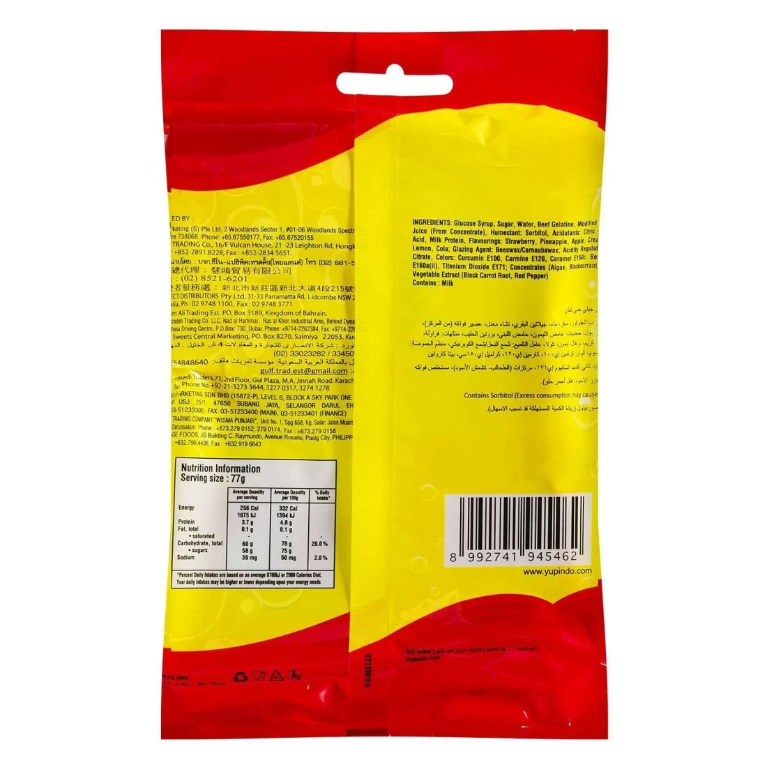 ingredients : Glucose Syrup, Sugar, Water, Real Fruit Juice, Beef Gelatine, Modified Starch, Acidulants: Citric Acid, Lactic Acid, Humectant: Sorbitol, Milk Protein, Glazing Agent: Beewax/Carnauba Wax, Flavourings, Ascorbic Acid (Vitamin C), Colour: Curcumin E100, Tartrazine E102, Sunset Yellow E150c, Titanium Dioxide E171.