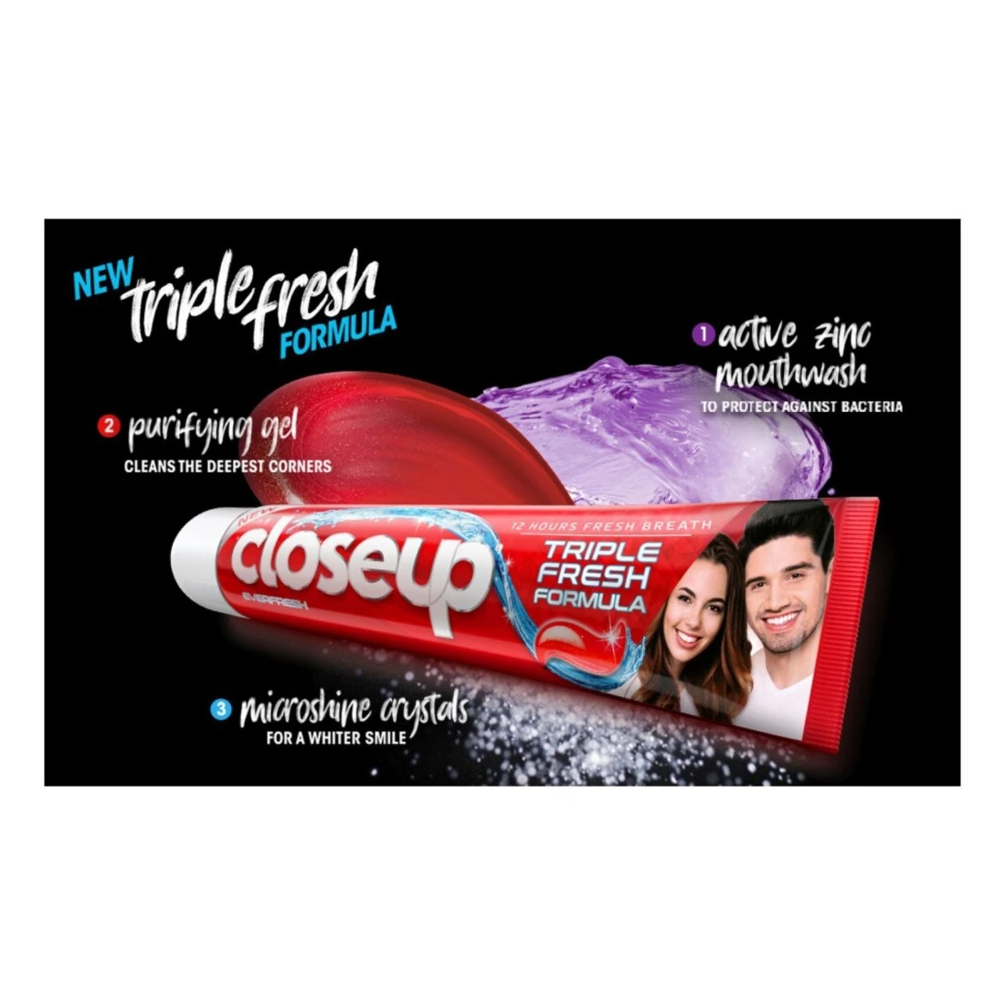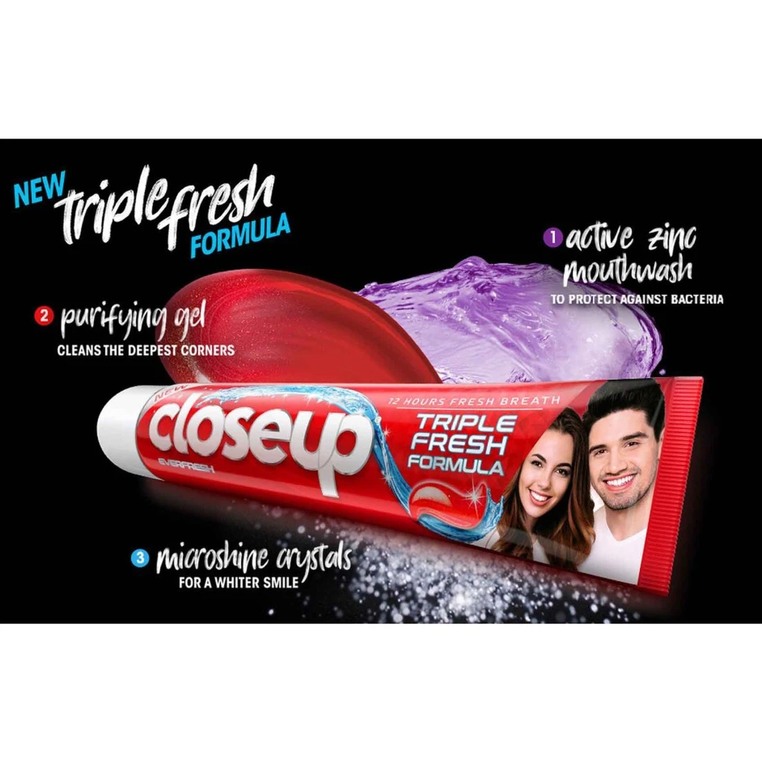Closeup Triple Fresh Formula Toothpaste Cool Breeze 120ml is a refreshing toothpaste that provides triple fresh breath protection. Its unique formula fights bacteria removes plaque and keeps your breath fresh for up to 12 hours. With a cool breeze flavour, this toothpaste leaves your mouth feeling clean and invigorated. It also helps strengthen your teeth and prevent cavities making it an essential part of your daily oral care routine.