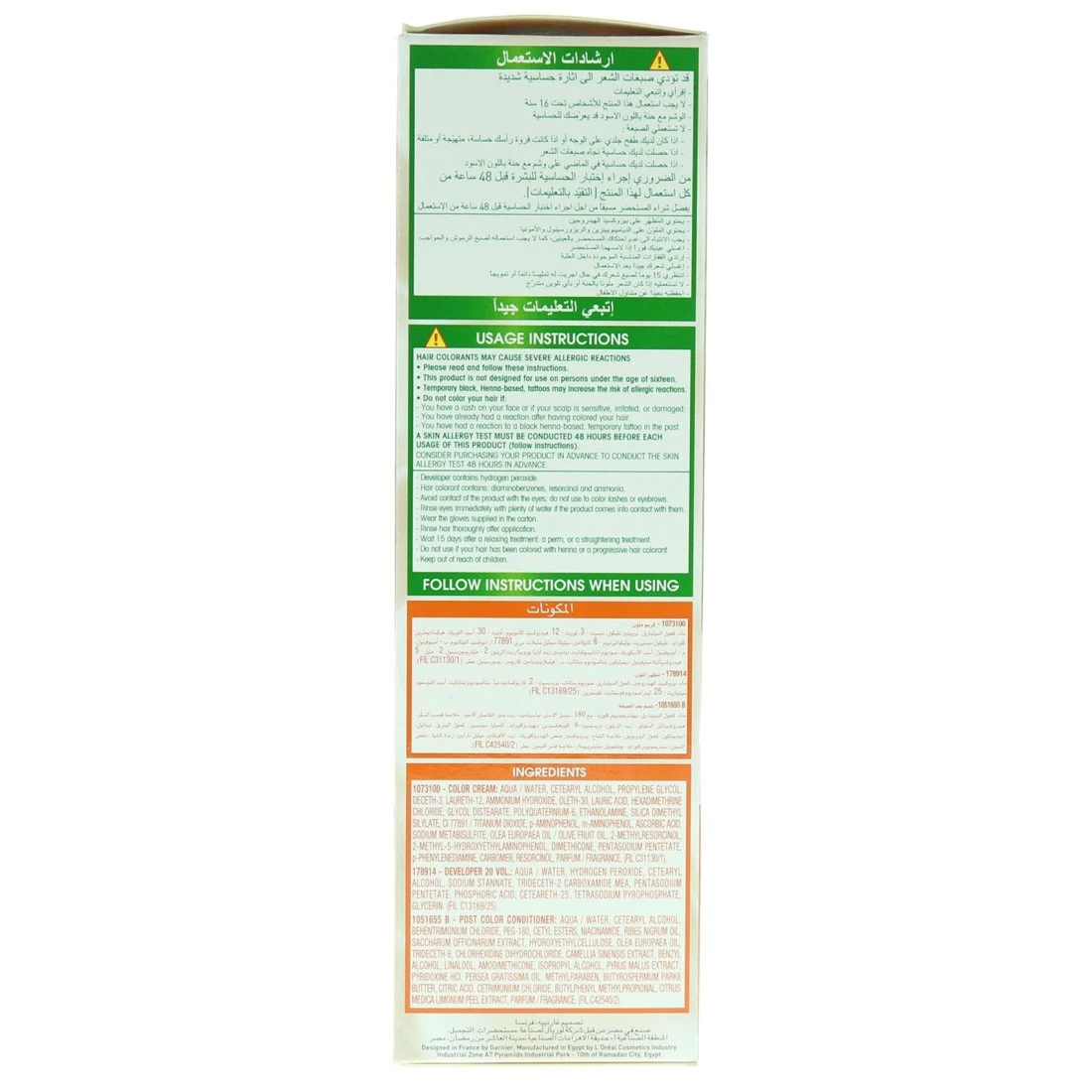ingredients : Aqua/water, Cetearyl Alcohol, Propylene Glycol, Deceth-3, Laureth-12, Ammonium Hydroxide, Oleth-30, Lauric Acid, Hexadimethrine Chloride, Glycol Distearate, Polyquaternium-6, Ethanolamine, Silica Dimethyl Silylate, Ci 77891/titanium Dioxide, 2, 4-diaminophenoxyethanol Hci, M-aminophenol, Ascorbic Acid, Sodium Metabisulfite, Olea Europaea Oil/olive Fruit Oil, Dimethicone, Pentasodium Pentetate, N, N-bis(2-/hydroxyethyl)- P-phenylenediamine Sulfate, P-phenylenediamine, Carbomer, Resorcinol, Parfum/fragrance. (Fil C26671/1)178914 Developer 20 Vol.: Aqua/water, Hydrogen Peroxide, Cetearyl Alcohol, Sodium Stannate, Trideceth-2 Carboxamide Mea, Pentasodium Penteate, Phosphoric Acid, Ceteareth-25, Tetrasodium Pyrophosphate, Glycerin. (Fil C13169/25)1051655 F-post Color Conditioner: Aqua/water, Cetearyl Alcohol, Behentrimonium Chloride, Peg-180, Cetyl Esters, Niacinamide, Ribes Nigrum Oil/black Current Seed Oil, Saccharum Officinarum Extract/ Sugar Cane Extract, Hydroxyethylcellulose, Olea Europaea Oil/olive Fruit Oil, Trideceth-6, Chlorhexidine Dihydrochloride, Camellia Sinensis Extract, Benzyl Alcohol, Linalool, Amodimethicone, Isopropyl Alcohol, Pyrus Malus Extract/ Apple Fruit Extract, Pyridoxine Hci, Persea Gratissima Oil/avocado Oil, Methylparaben, Butyrospermum Parkii Butter/shea Butter, Citric Acid, Cetrimonium Chloride, Butylphenyl Methylpropional, Citrus Medica Limonum Peel Extract/lemon Peel Extract, Parfum/fragrance. (Fil C161805/1).