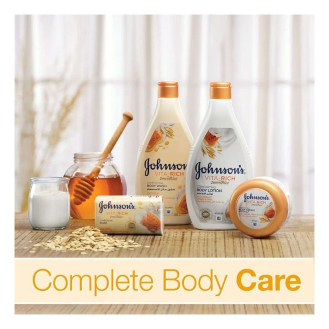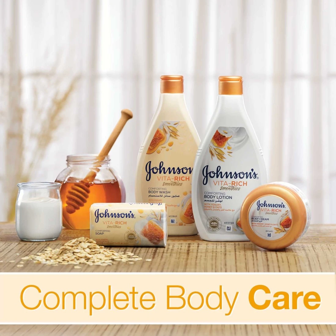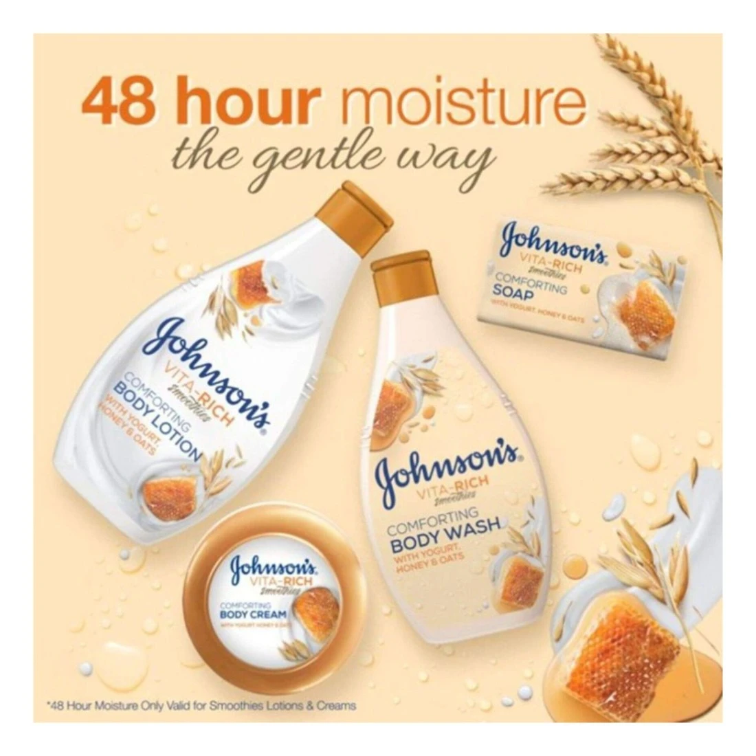 JOHNSON’S Vita-Rich Smoothies Comforting Body Lotion is a fast-absorbing, luxurious body lotion that provides your dry skin with long-lasting moisturisation.Enriched with yogurt concentrate, honey and oats, JOHNSON’S Vita-Rich Smoothies Comforting Body Lotion intensely nourishes and comforts your skin, keeping it moisturised for 48 hours.JOHNSON’S Vita-Rich Smoothies Comforting Body Lotion is light-weight and non-greasy, and is infused with a delicious, cosy fragrance that leaves your skin feeling silky soft and beautifully vibrant. For beautifully scented, healthy-looking skin that feels comfortable all day, use JOHNSON’s Vita-Rich Smoothies Comforting Body Lotion!