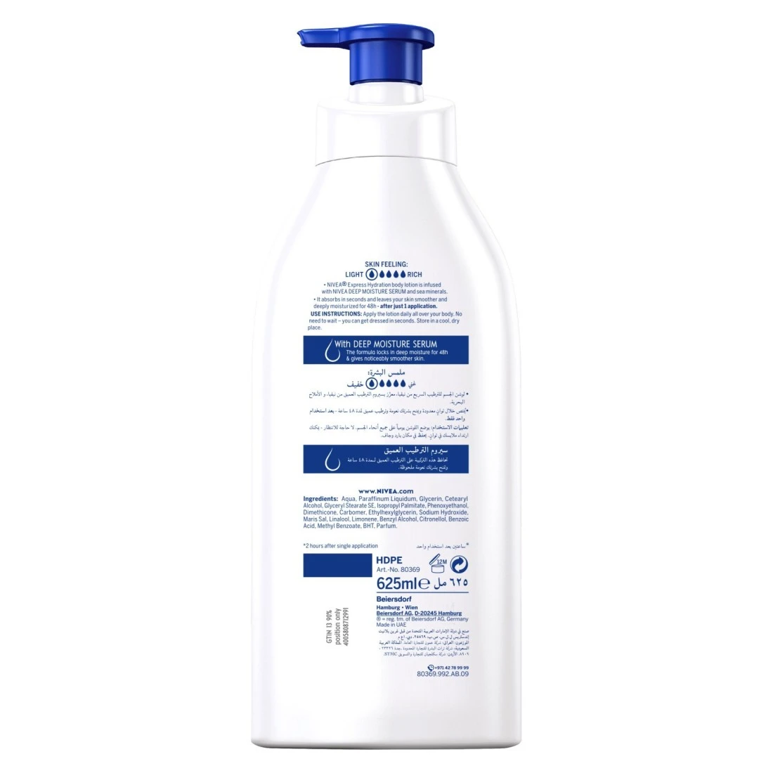 The fast absorbing NIVEA Express Hydration Body Lotion instantly delivers all the moisture needed to unveil long-lasting soft and supple skin. Sea Minerals in an ultra-light formula are quickly absorbed leaving your skin immediately soft and supple, and delicately enwrapped in a blue-lotus scent.At NIVEA we’ve got a vast selection of soaps, shower gels, bath additives, deodorants, creams, lotions, milks and a lot more. If you’re looking for products to help improve the healthy look or glow of your skin, we’ve got you covered! Take a look now and discover the ideal NIVEA product for your needs and preferences. We have products for both men and women including shaving items and deodorants for all of your personal hygiene requirements. NIVEA, a hundred years of skincare for life!