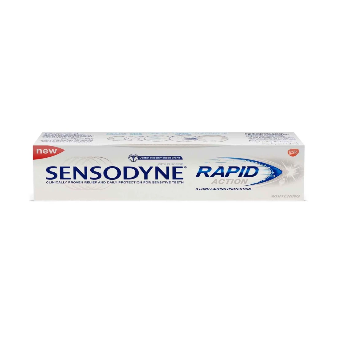 Sensodyne Rapid Action Whitening is a toothpaste specially formulated to provide fast relief for sensitive teeth while also whitening your teeth. It contains active ingredients that help to block the pain signals from reaching the nerves of your teeth, providing quick relief from sensitivity. At the same time, it gently removes stains and restores the natural whiteness of your teeth, giving you a brighter smile. This toothpaste is perfect for those who suffer from tooth sensitivity and want to achieve a whiter smile. It is clinically proven to provide fast relief from sensitivity, with results noticeable within a week of use. The unique formula of Sensodyne Rapid Action Whitening is gentle on the teeth and gums, making it suitable for everyday use. With regular use, you can enjoy a pain-free and brighter smile. With Sensodyne Rapid Action Whitening, you no longer have to compromise between sensitivity relief and teeth whitening. This toothpaste offers both benefits in one product, making it convenient and effective. Say goodbye to tooth sensitivity and hello to a whiter smile with Sensodyne Rapid Action Whitening.