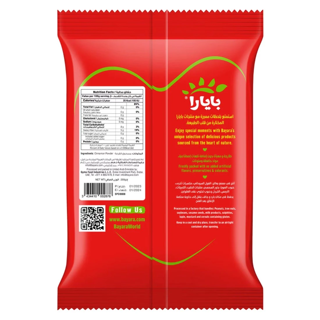 Bayara Cinnamon Powder is made from high-quality cinnamon bark carefully ground to create a fine powder. This aromatic spice is commonly used in baking cooking and beverages to add a warm and sweet flavour. It has been sourced from the finest cinnamon trees to ensure superior taste and quality. The 200g pack is convenient for both home and professional use and it comes in a resealable bag to preserve freshness. Bayara Cinnamon Powder is an essential ingredient for any kitchen perfect for adding a touch of warmth and flavour to a variety of dishes.