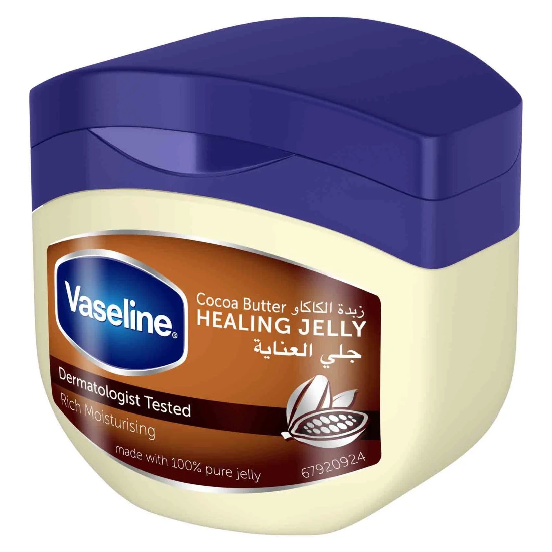 Vaseline Jelly Cocoa Butter This formula works to help heal dull dry skin and give skin a natural radiance healthy look. Vaseline Petroleum Jelly has long been used to help heal dry skin and is effective at locking in moisture. Our Vaseline Jelly Cocoa Butter combines the dry skin healing benefits of Vaseline Jelly with cocoa butter which is known to nourish your skin. Vaseline Jelly forms a protective barrier to seal in moisture deep within the skin's surface layers and to enhance the skin's natural barrier recovery. With its moisturising properties, Vaseline Petroleum Jelly Cocoa Butter is great for tackling dull dry skin and is suitable for sensitive skin. This product is also made with cocoa butter which is known to be a great moisturiser, especially for particularly rough areas like elbows knees and heels. Simply apply Vaseline Jelly Cocoa Butter daily to deeply condition relieve and rejuvenate dry skin. Gentle on Skin Vaseline Jelly with Cocoa Butter isn't just good for dry skin
