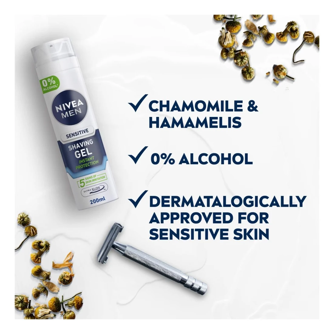 NIVEA MEN Sensitive Shaving Gel is an extra-gentle formula developed to provide a comfortable shave and leave your skin looking healthy and cared for.Formulated with 0% alcohol, NIVEA MEN Sensitive Shaving Gel does not burn and is enriched with chamomile and hamamelis extracts to care for your skin before you shave. This fragrance-neutral foam is powered with the Ultra Glide Technology to ensure a close, clean and comfortable shave while protecting your skin from micro-cuts and irritations.A happy man is a good man. If men feel good in their skin, they have the confidence to achieve more. We at NIVEA have worked hard to perfect the art of men’s grooming by elaborating a line of quality skin care products for men. NIVEA MEN gives you a daily boost of confidence to unlock your everyday potential while guaranteeing uncompromising quality and performance.NIVEA MEN, it starts with you!