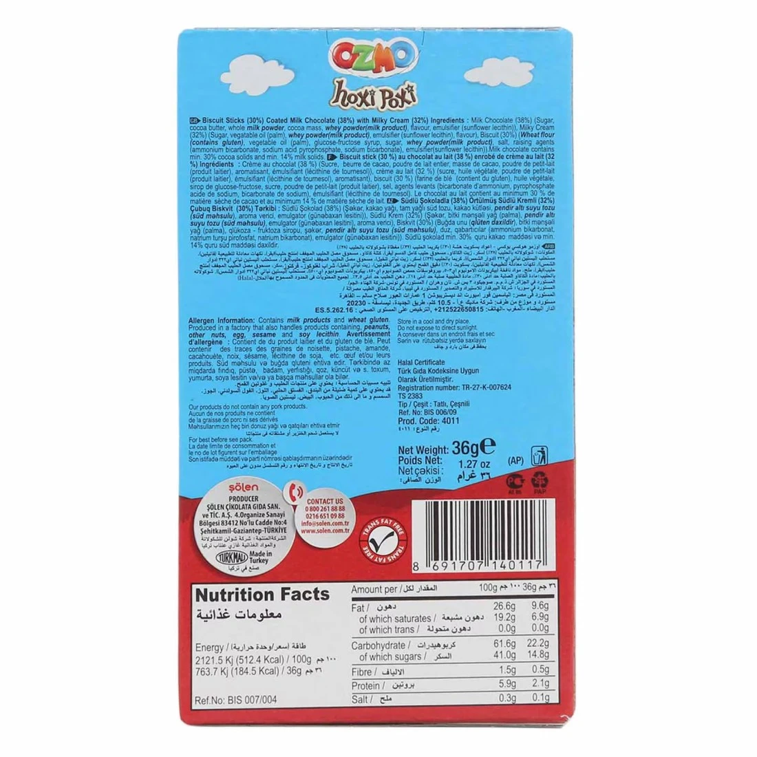 Ozmo Hoxi Poxi Chocolate Coated Sticks Biscuits are a delicious treat that combines a crispy biscuit with a smooth chocolate coating. Each bite is a perfect balance of sweetness and crunch making them a perfect snack for any time of day. with a convenient size of 36g, these biscuits are great for on-the-go snacking or enjoying as a light indulgence. Give yourself a treat with Ozmo Hoxi Poxi Chocolate Coated Sticks Biscuits.