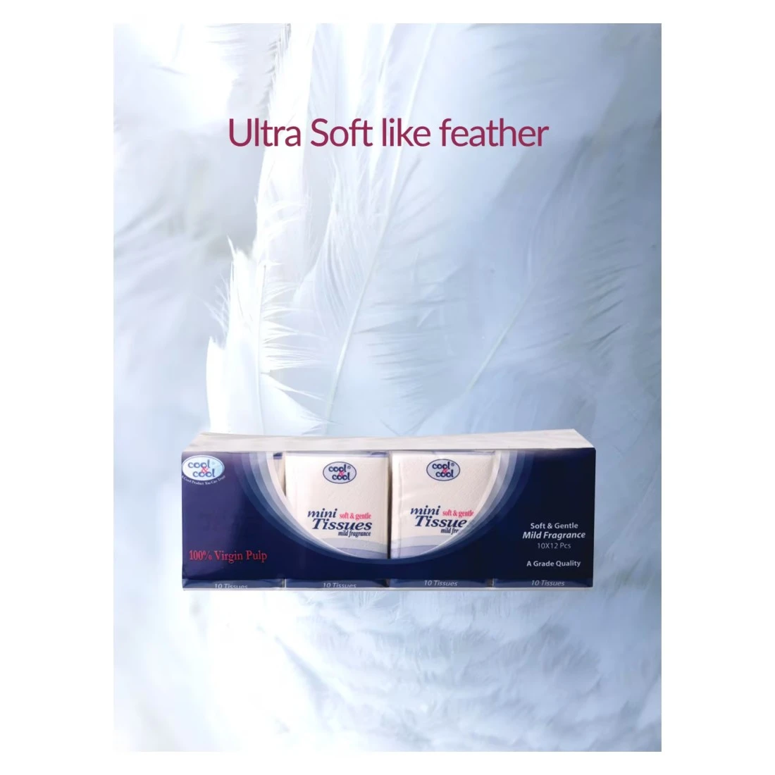 Cool & Cool Soft And Gentle Mini Tissues are perfect for on-the-go use. These white tissues come in a pack of 12 with each pack containing 10 sheets. They are soft and gentle on the skin making them suitable for all skin types. These mini tissues are convenient to carry in your bag or pocket ensuring you always have a tissue handy when you need it. Whether you need to wipe away sweat clean your hands or remove makeup these mini tissues are a must-have item for everyday use.