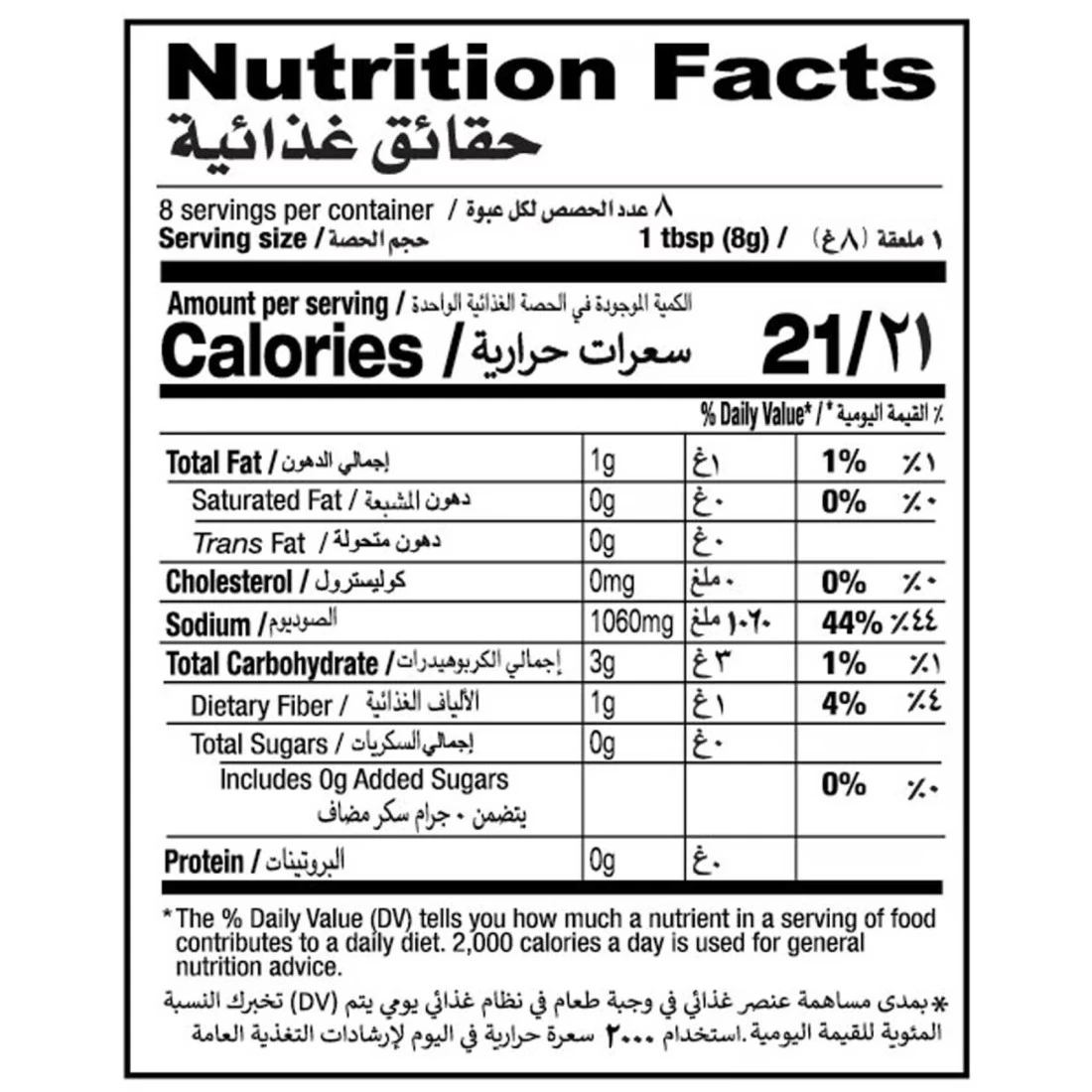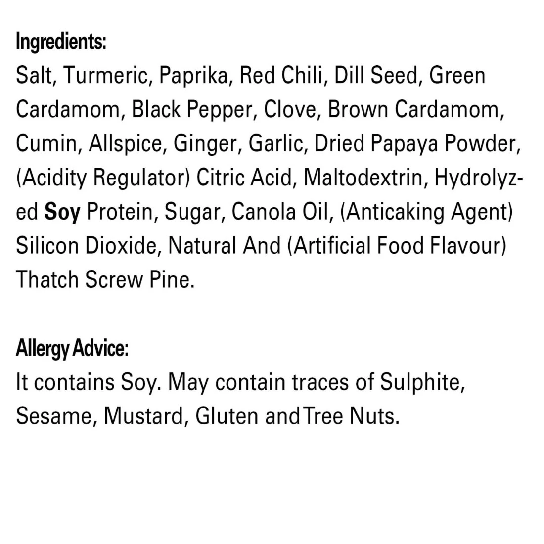 ingredients : Salt, Red Chilli, Turmeric, Cumin, Blak Pepper, Large Cardamom, Cinnamon, Green Cardamom, Clove, Brown Cardamom, All Spice, Dill Seed, Ginger, Garlic, Citric Acid, Maltodextin, Hydrolyzed Soy Protein, Cane Sugar, Canola Oil and Silicon dioxide