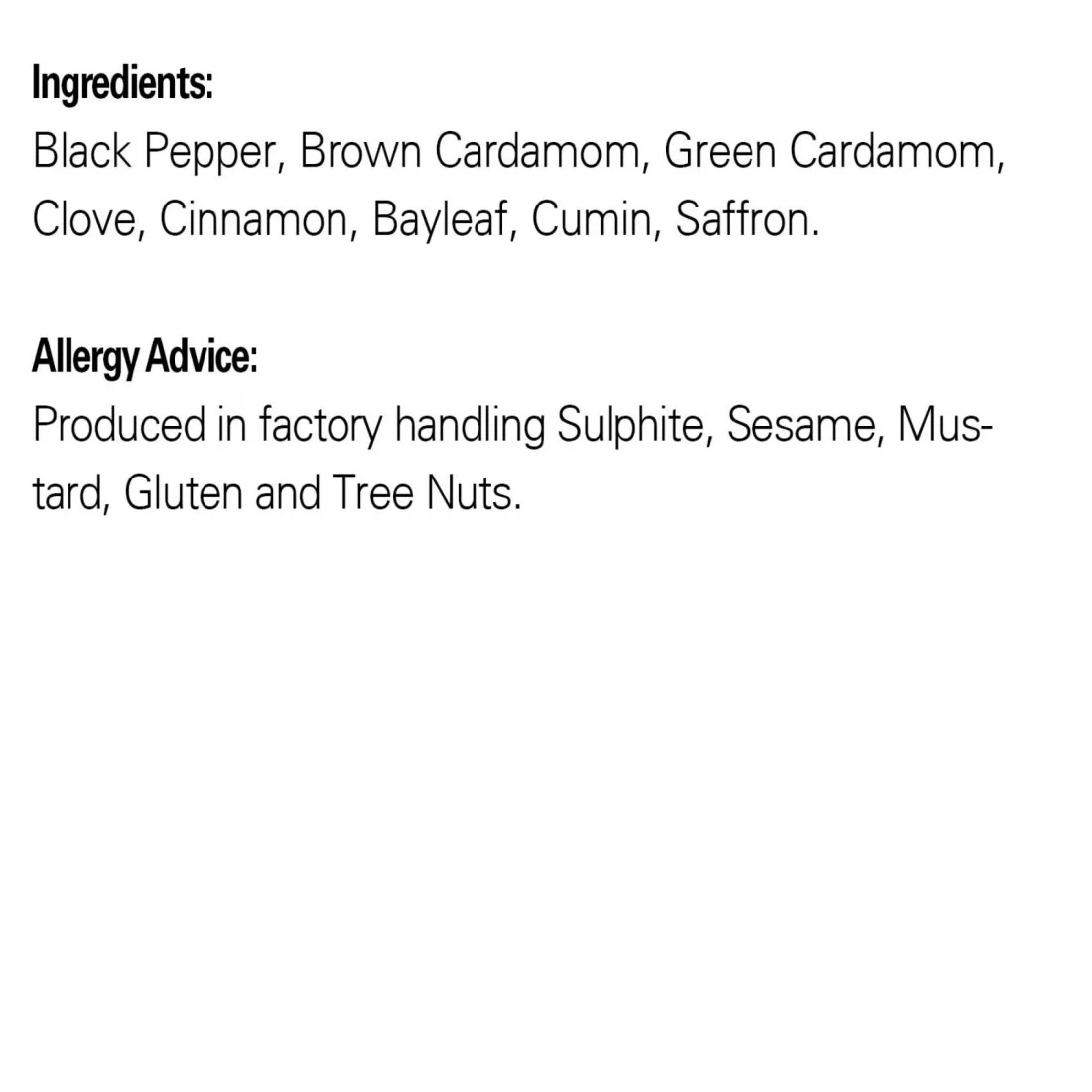 ingredients : Black Pepper, Brown Cardamom, Green Cardamom, Clove, Cinnamon, Bay Leaf, Cumin, Saffron