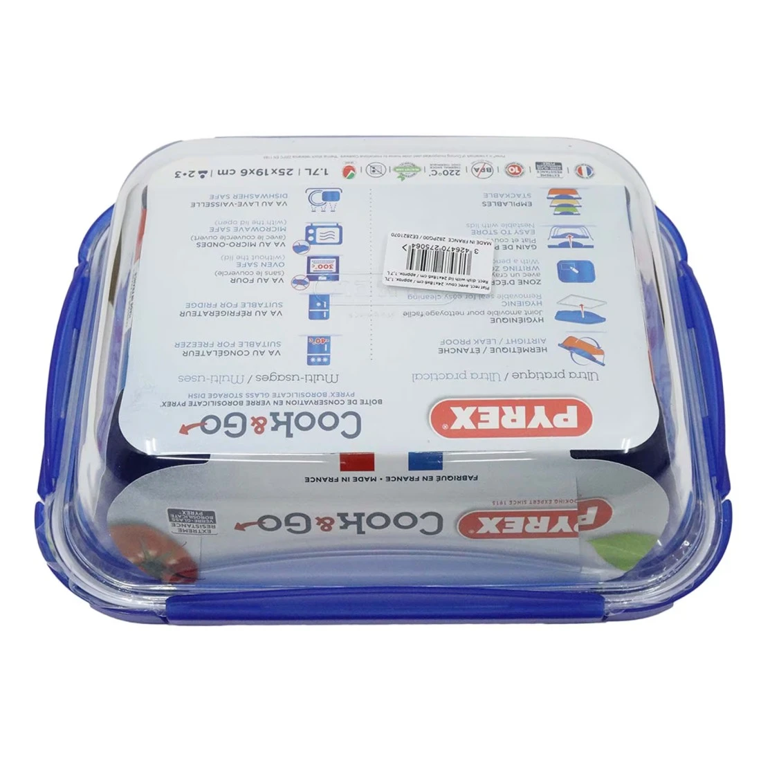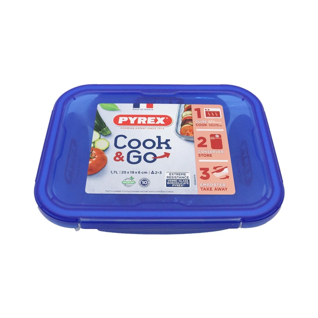 Pyrex Cook & Go Rectangular Food Container With Lid Clear/Blue 1.7L