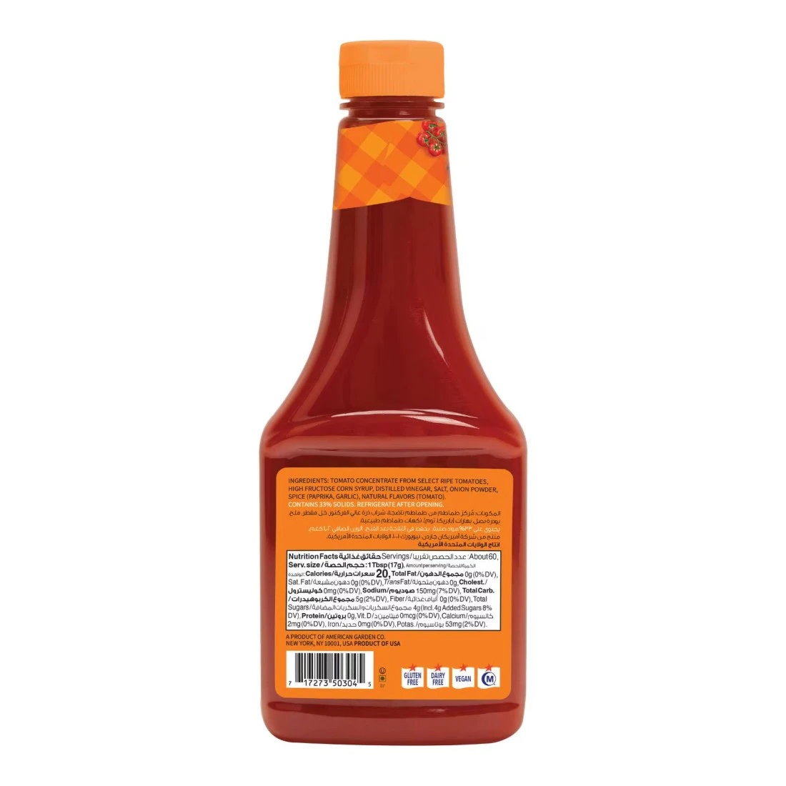 American Garden U.S. Ketchup 1.02kg delivers a burst of flavour to your favourite foods. This ketchup is US Certified Grade A and made from BD8:BG74 California vine-ripened tomatoes to deliver an authentic American flavour. This American Garden ketchup bottle is packed with delicious tomatoes and the perfect blend of spices to add a deliciously sweet and tangy taste to many foods. Contains no artificial colours artificial flavours or preservatives and is gluten-free and vegan. Add this ketchup to your French fries hamburgers sandwiches shawarmas or any other food of your choice. American Garden brings you premium quality foods from the United States and around the world. Our wide range of authentic foods is perfect for sharing with friends and family.