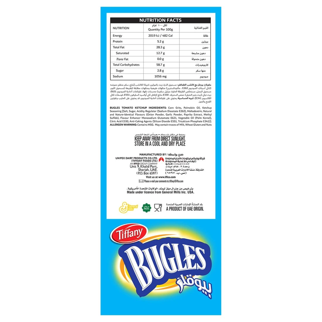 Tiffany Bugles Ketchup Chips are a popular snack option for those who love the tangy and savoury taste of ketchup. These chips are made from selected potatoes that are thinly sliced and then seasoned with the iconic ketchup flavour. Filled with crispy crunchy chips that offer a burst of tomatoes goodness in every bite. Whether enjoyed on their own or paired with your favourite dip Tiffany Bugles Ketchup Chips are a delicious and satisfying snack option.