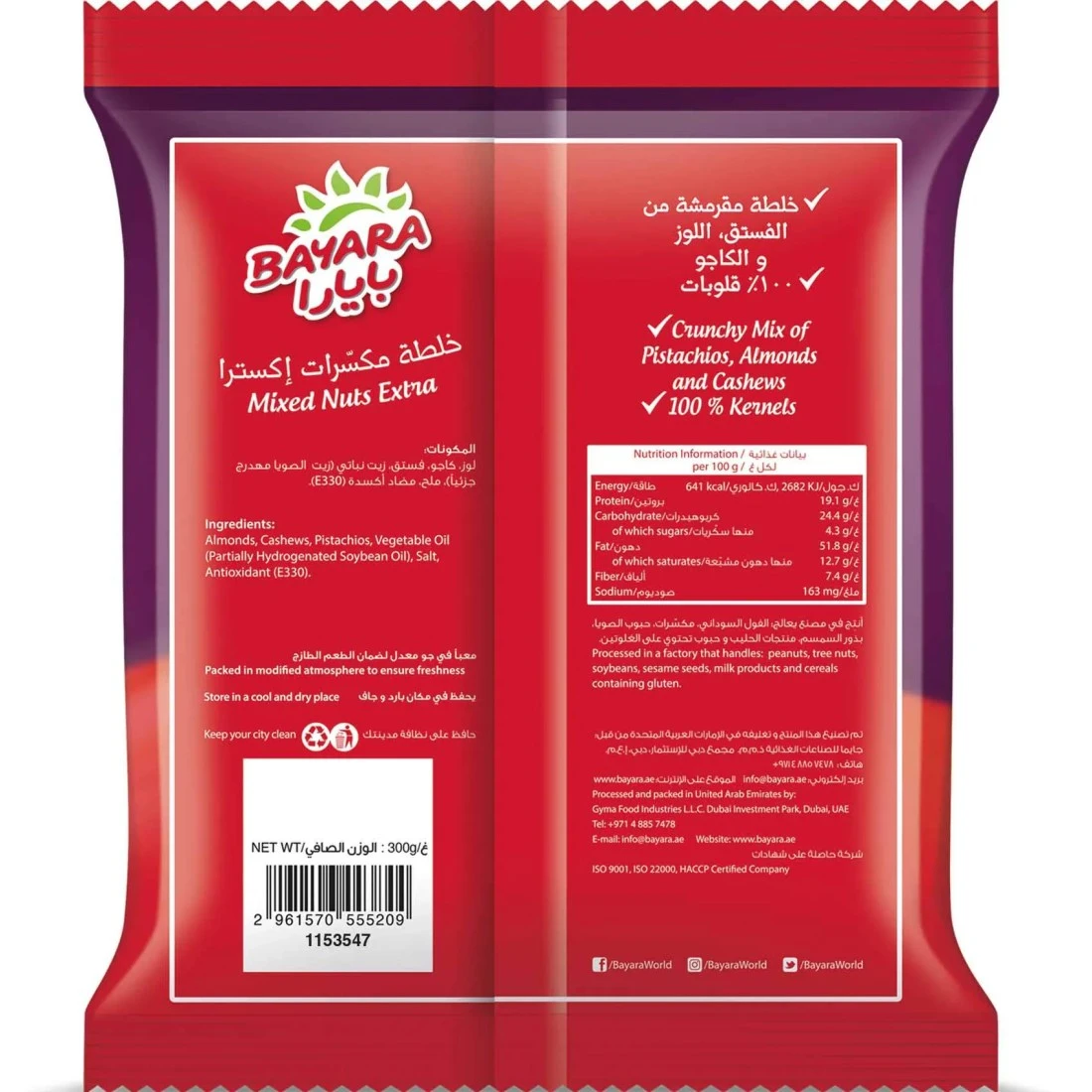 Bayara Snacks Mixed Nuts Extra is a delicious and nutritious snack that combines a variety of premium quality nuts. This 300g pack contains a mixture of almonds cashews walnuts hazelnuts and pistachios which are carefully selected to ensure a perfect blend of flavours and textures. These nuts are roasted to perfection and lightly salted to enhance their taste. Packed with essential nutrients including healthy fats protein and fiber these mixed nuts are a great option for anyone looking for a wholesome snack. They can be enjoyed on their own or added to salads trail mixes or baked goods for an extra crunch. Whether you're looking for a quick energy boost or a satisfying snack Bayara Snacks Mixed Nuts Extra is a perfect choice.