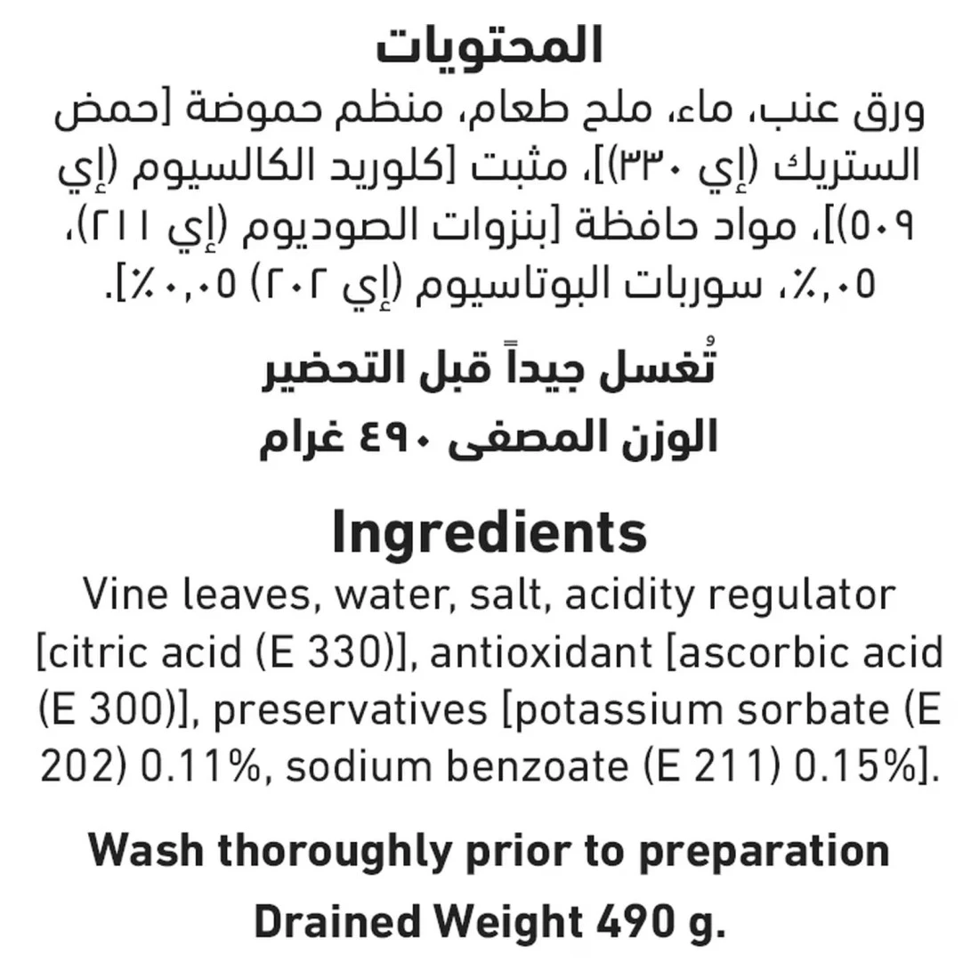ingredients : Vine Leaves, Water, Salt, Acidity Regulator Citric Acid (e 330)], Preservatives [sodium Benzoate (e 211), 0.1%, Potassium Sorbate (e 202), Sodium Bisulfite (e 222)]