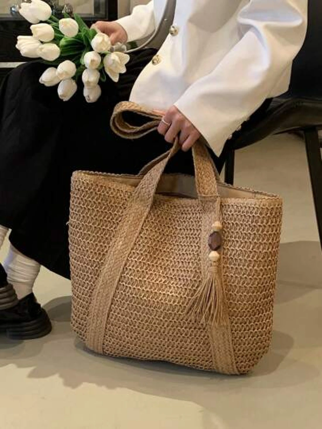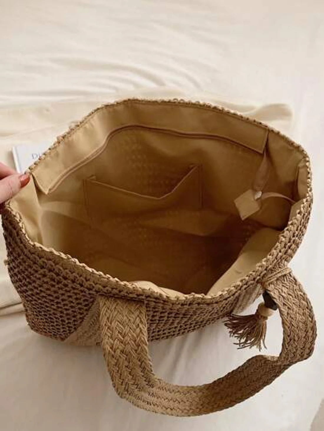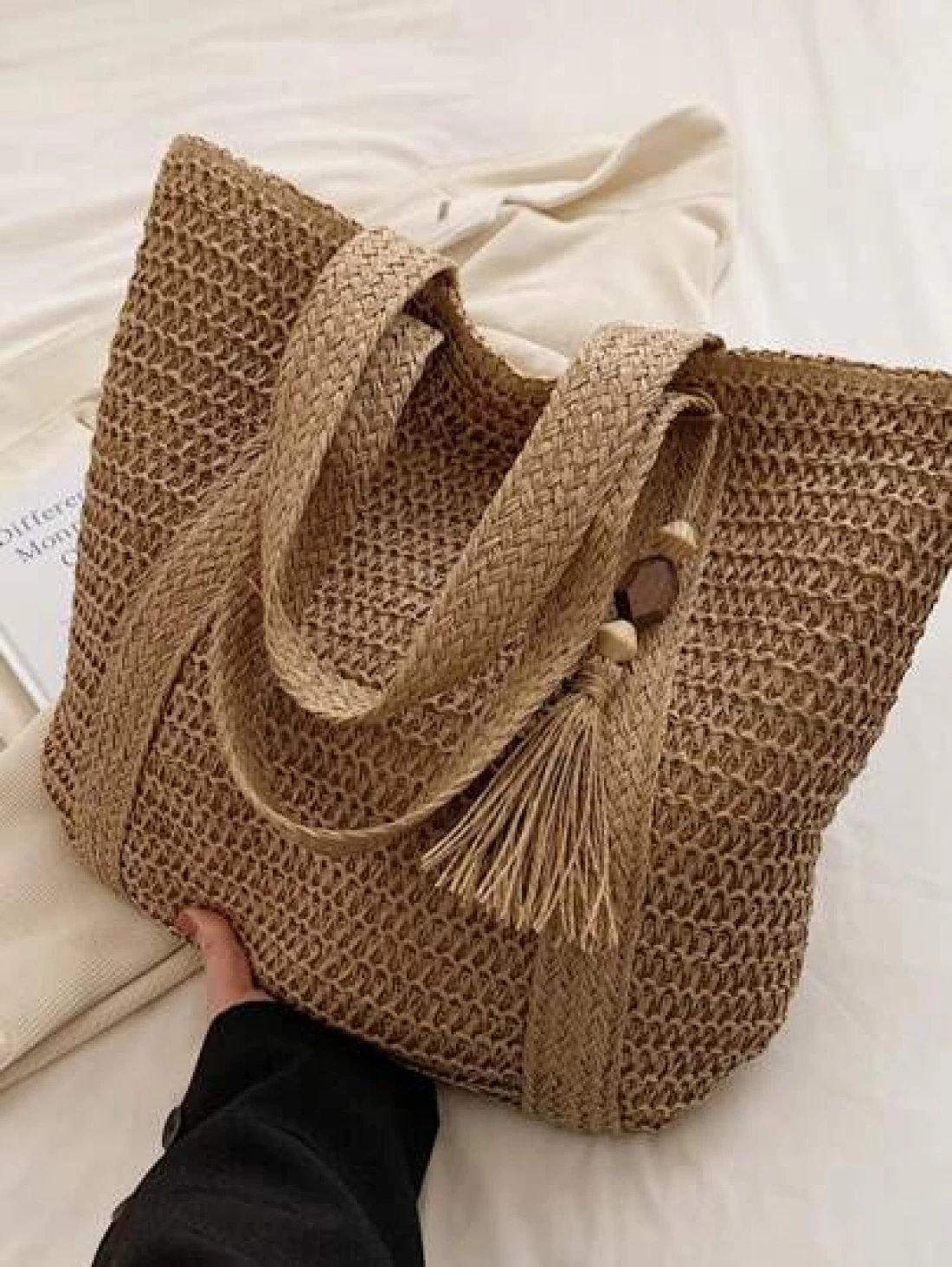 1 Pc Fashionable New Casual Summer Holiday Style Large Capacity Portable Solid Color Grass Woven Zipper Tote Bag With Wooden Bead Tassel Pendant Women s Beach Bag Suitable For Outdoor Leisure Vacation
