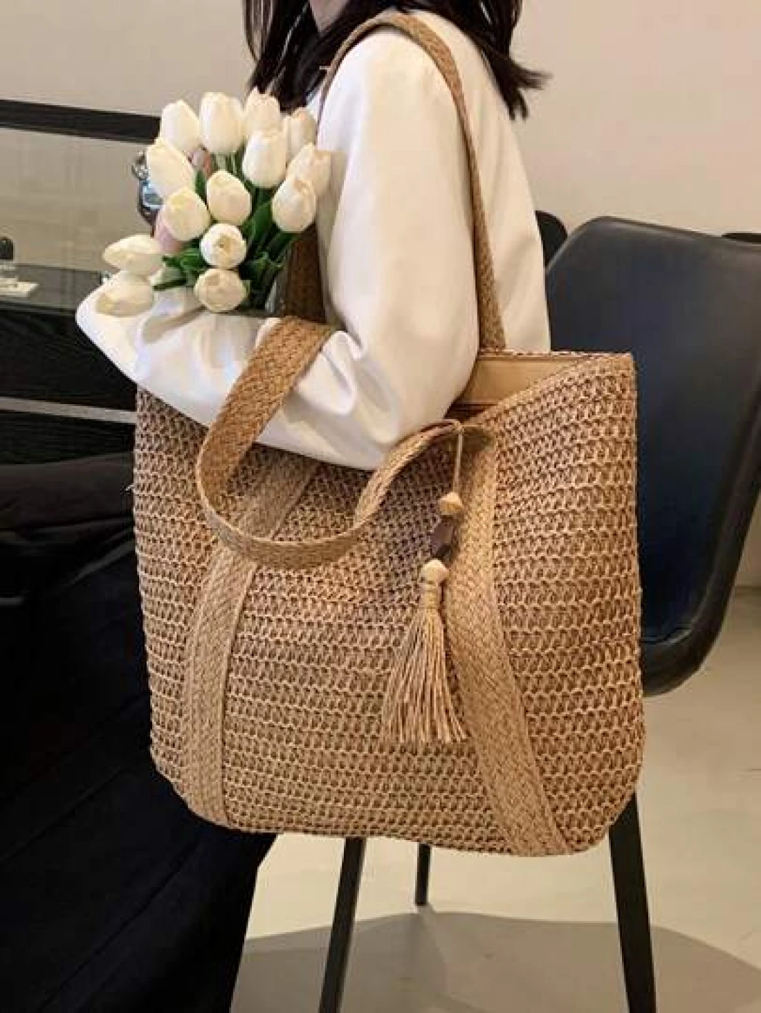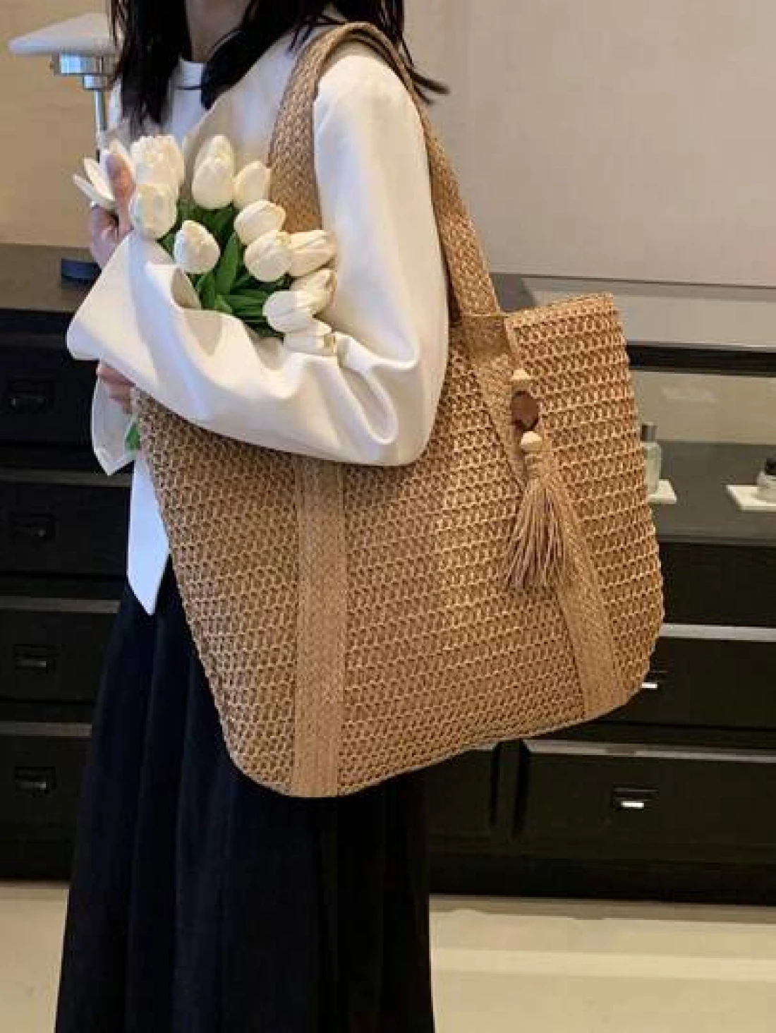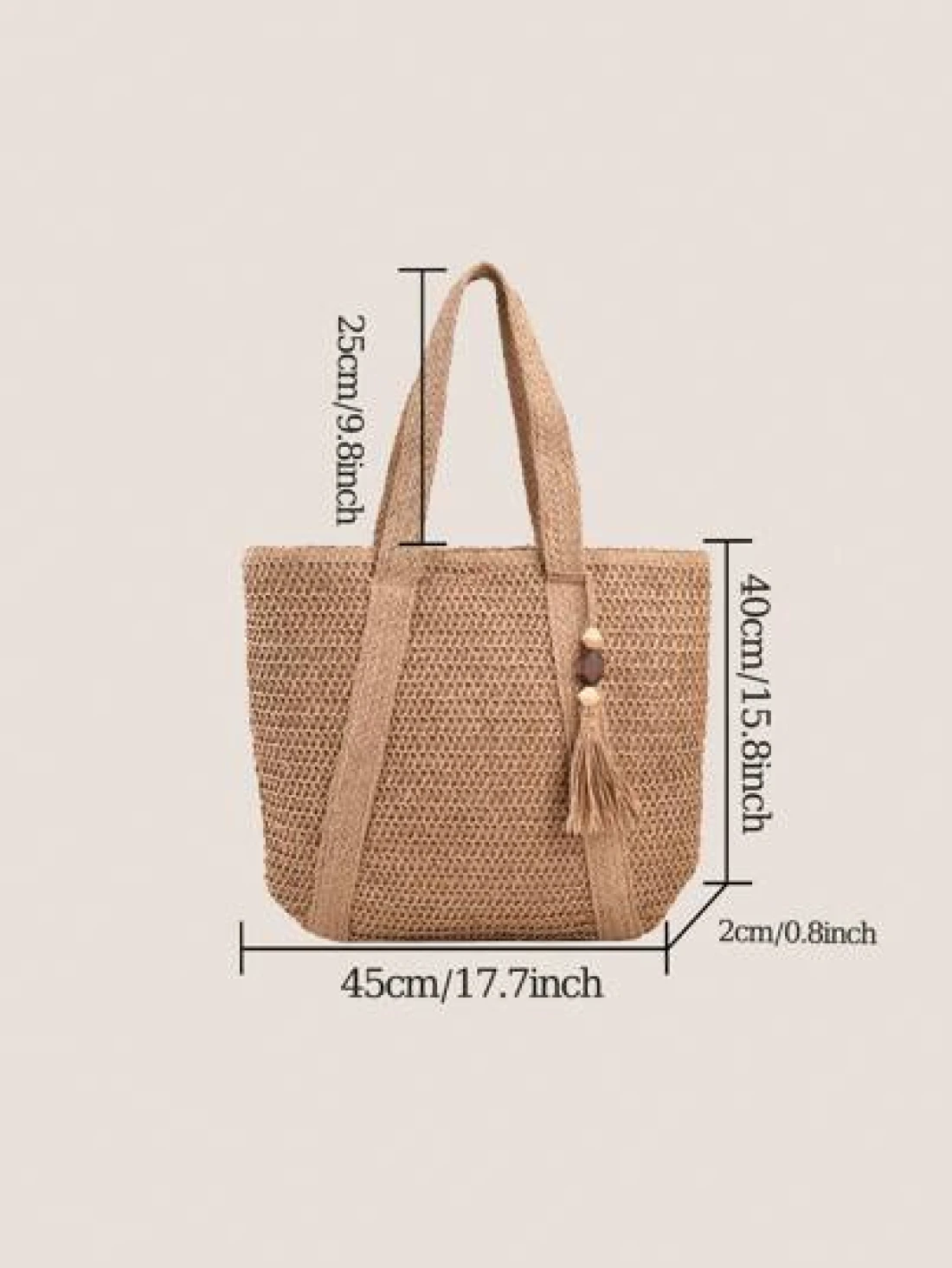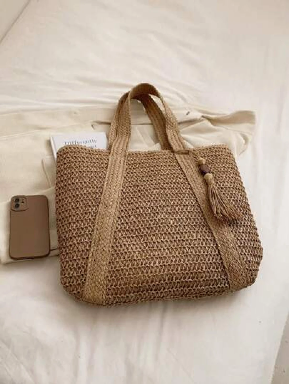1 Pc Fashionable New Casual Summer Holiday Style Large Capacity Portable Solid Color Grass Woven Zipper Tote Bag With Wooden Bead Tassel Pendant Women s Beach Bag Suitable For Outdoor Leisure Vacation
