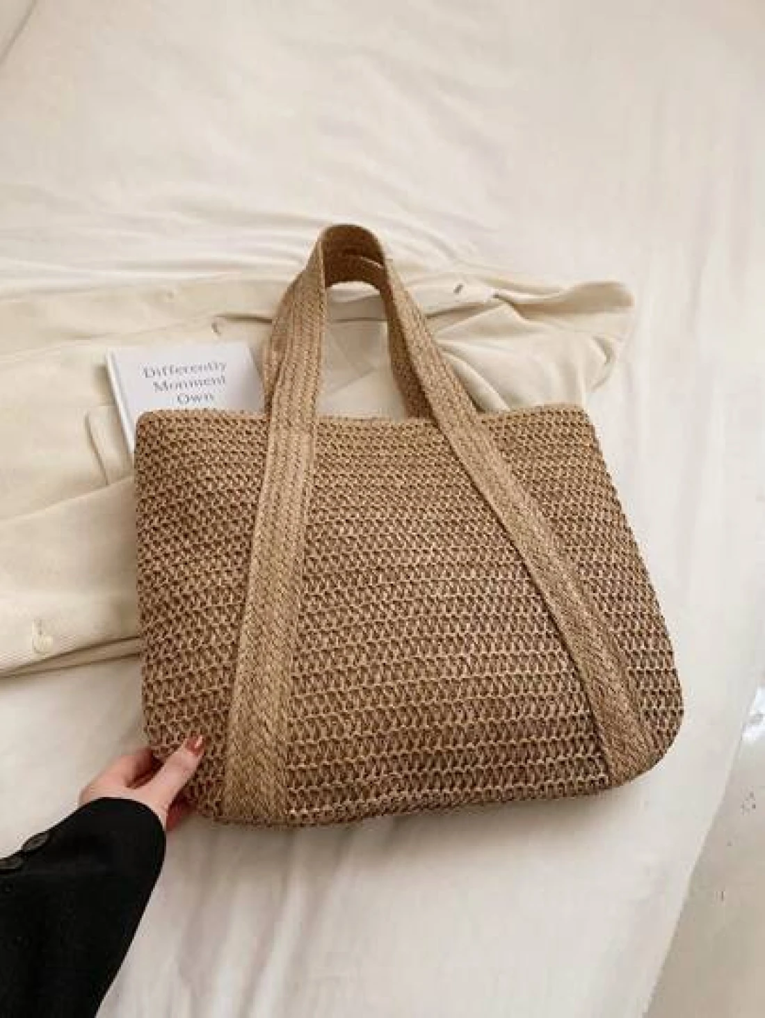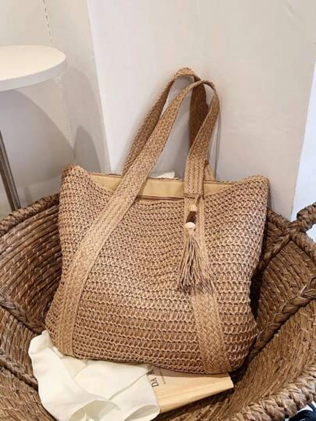 1 Pc Fashionable New Casual Summer Holiday Style Large Capacity Portable Solid Color Grass Woven Zipper Tote Bag With Wooden Bead Tassel Pendant Women s Beach Bag Suitable For Outdoor Leisure Vacation Seaside Travel Tourism And Shopping Daily Commuting To Work Summer Straw Beach Bag For Women Vacation Essentials Perfectly Matching With Beach Accessories Women