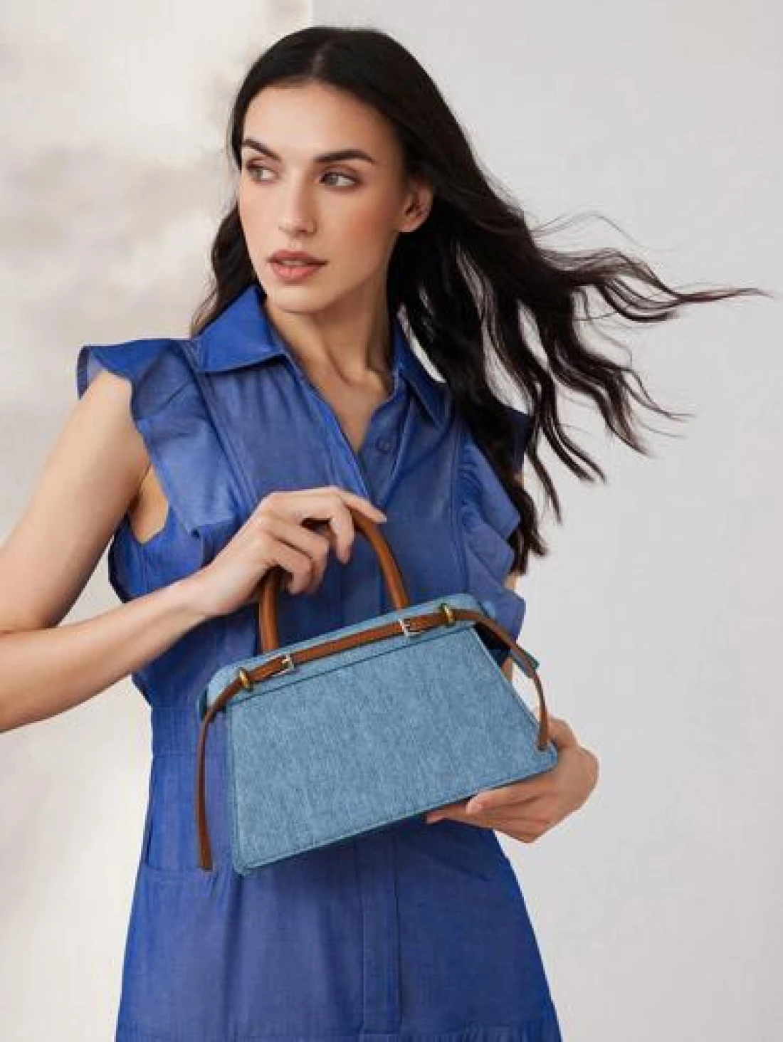 MOTF PREMIUM CONTRAST BUCKLE DETAIL DENIM EFFECT PRINT TOP HANDLE BAG