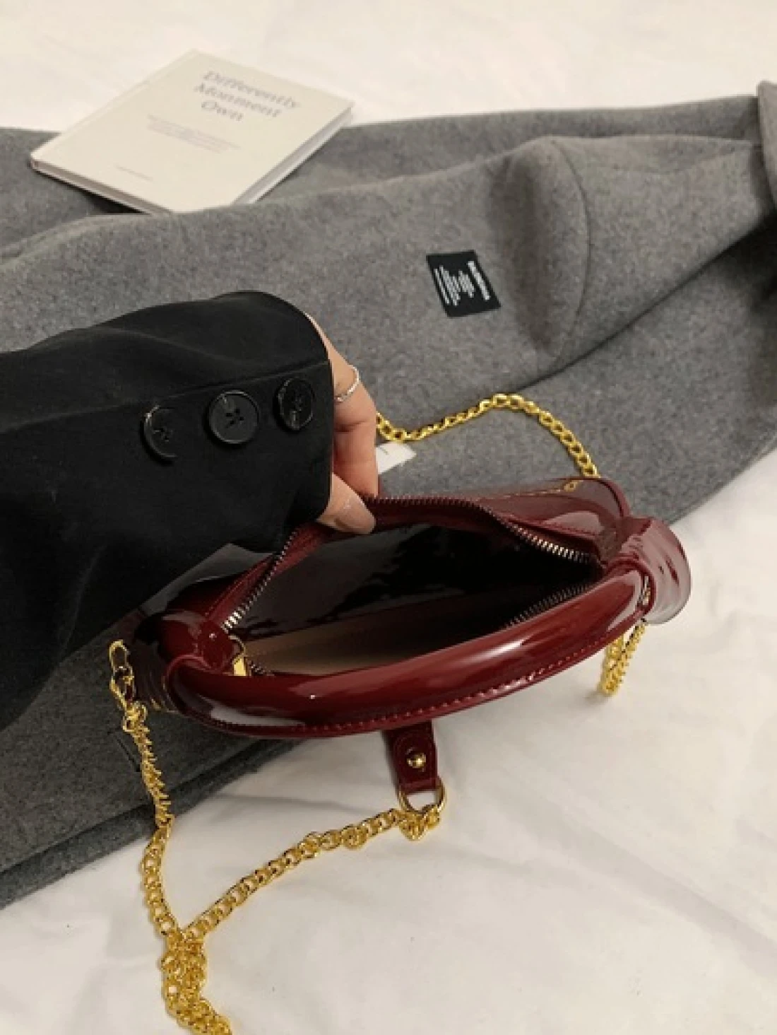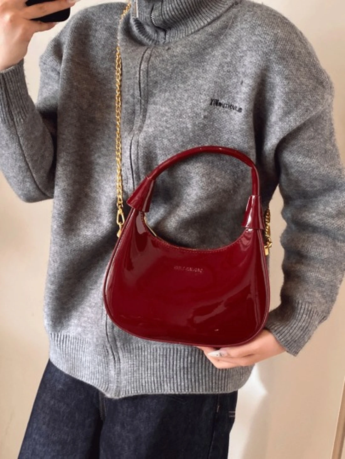 New Fashion Classic Joker Solid Color Pu Waterproof Fabric Handbag Bright Patent Leather Wine Red Bag Crescent Bag Shoulder Bag Letter Pattern Decoration Design Suitable For Traveling Shopping Commuting Party Gathering