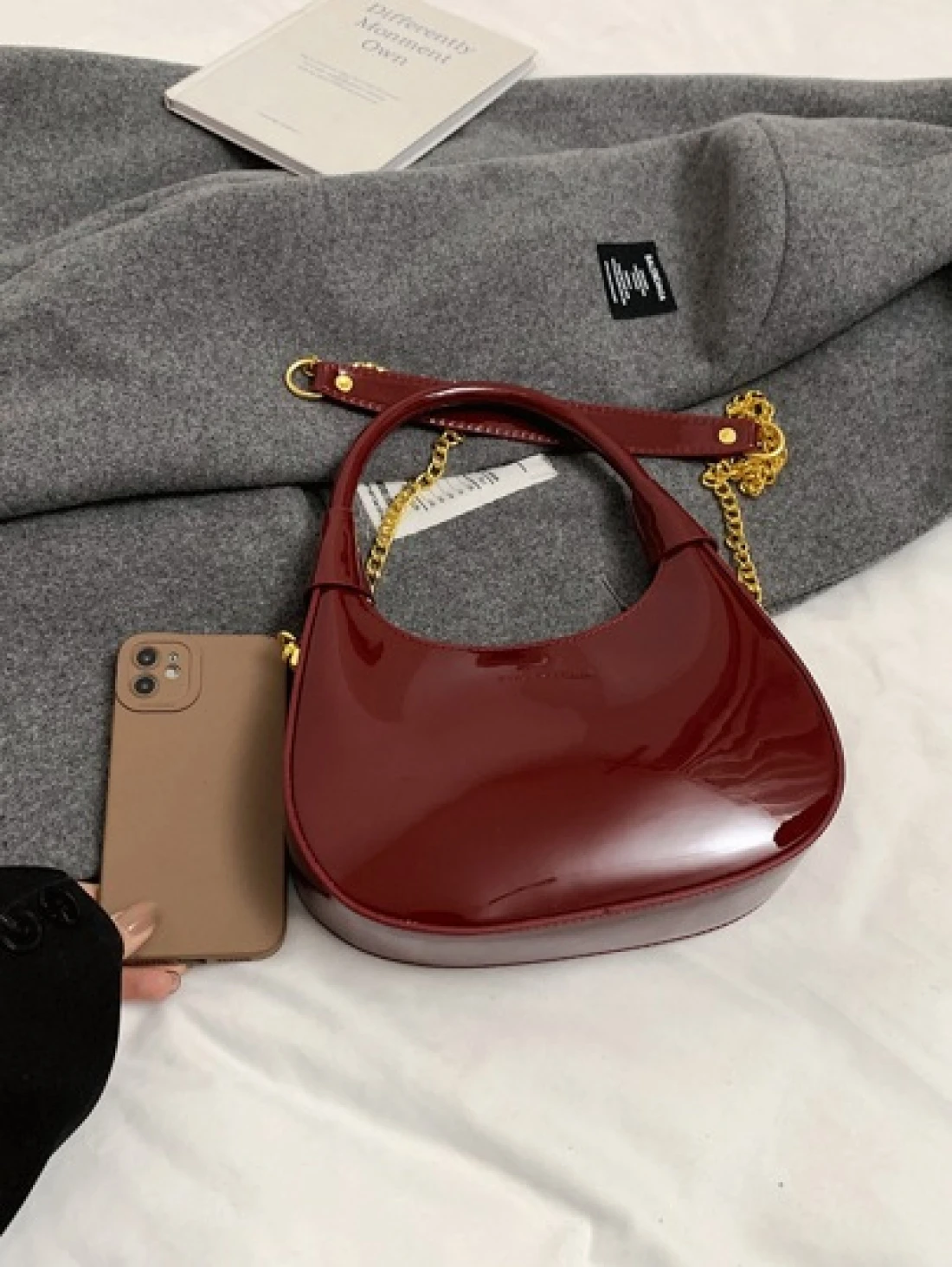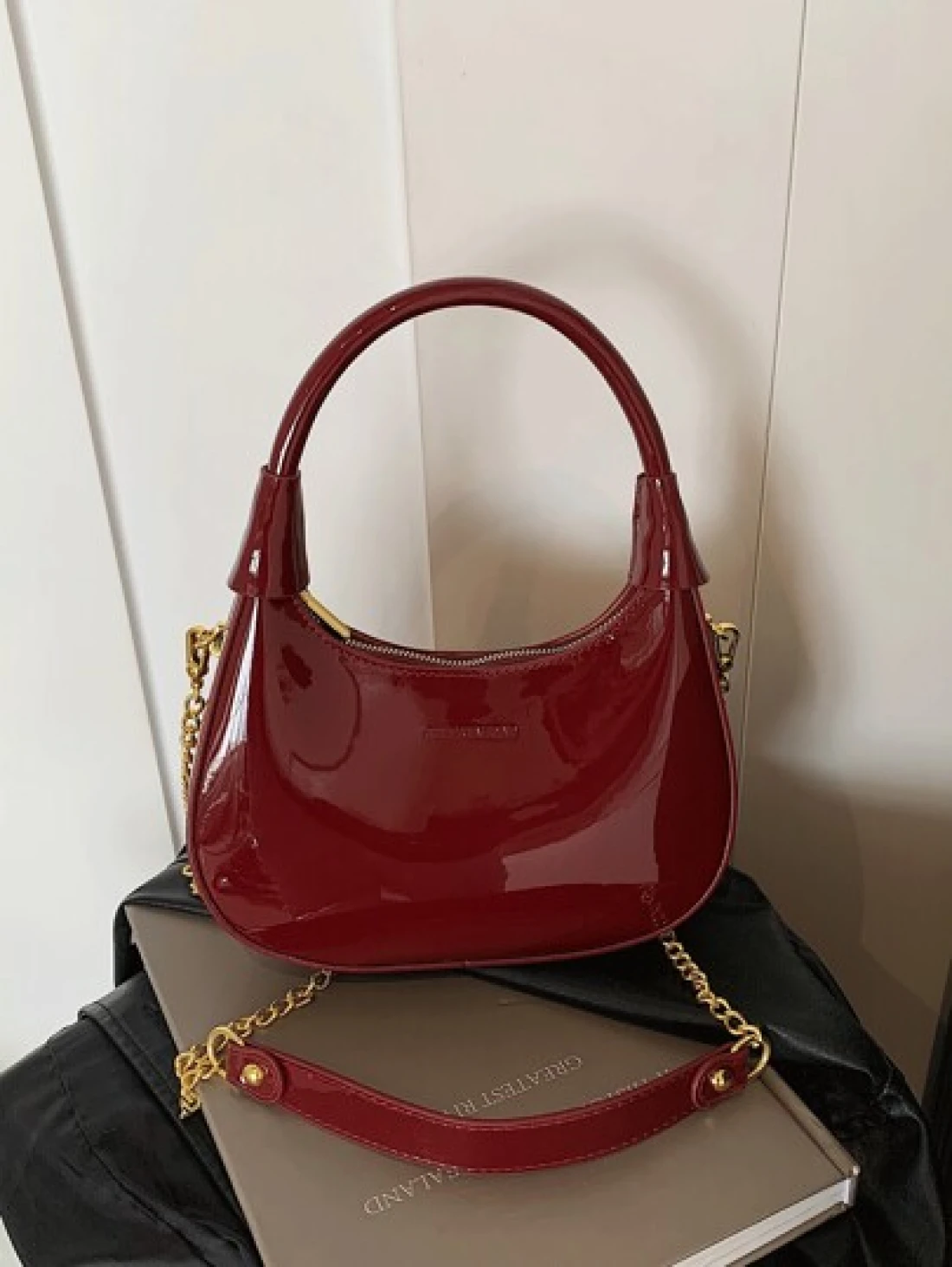 New Fashion Classic Joker Solid Color Pu Waterproof Fabric Handbag Bright Patent Leather Wine Red Bag Crescent Bag Shoulder Bag Letter Pattern Decoration Design Suitable For Traveling Shopping Commuti