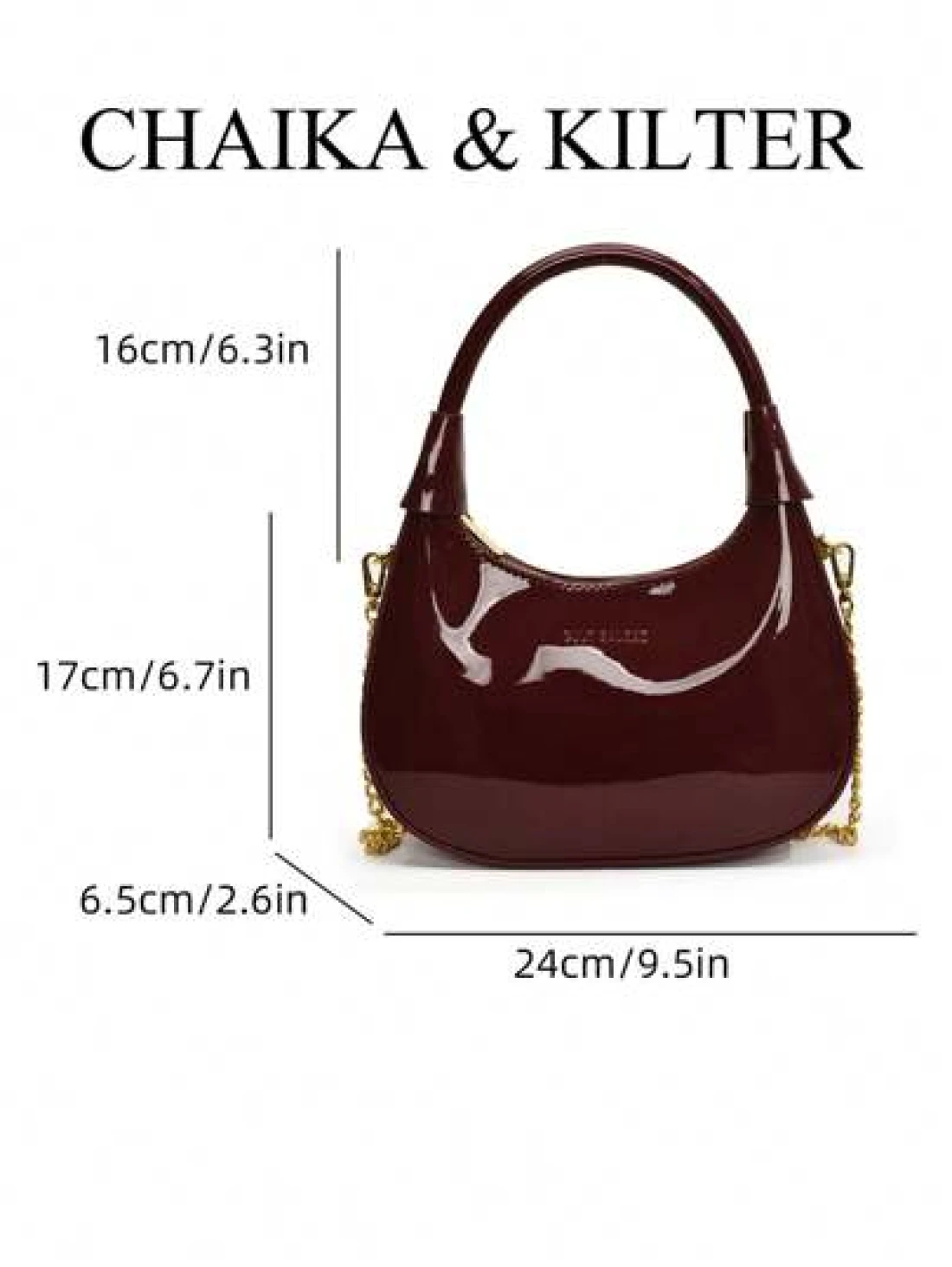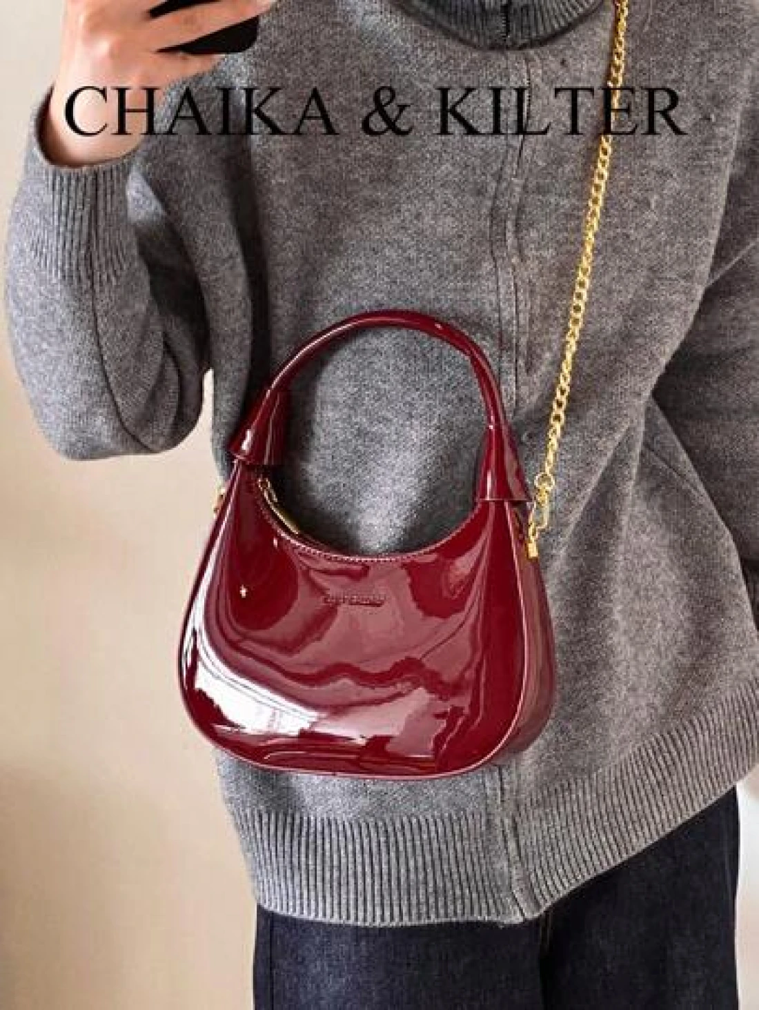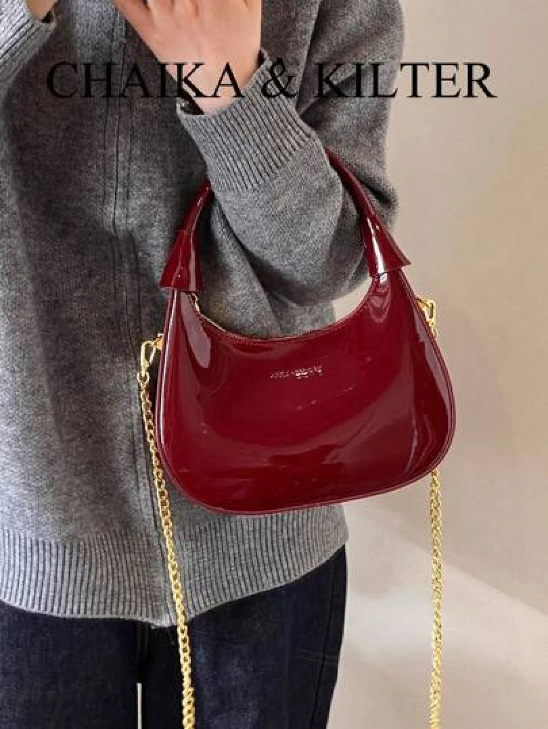 1pc CHAIKA KILTER Women Glossy PU Leather Tote Bag Fashionable Crescent Shaped Armpit Bag With Detachable Metal Chain Zipper Closure Suitable For Daily And Outdoor Use