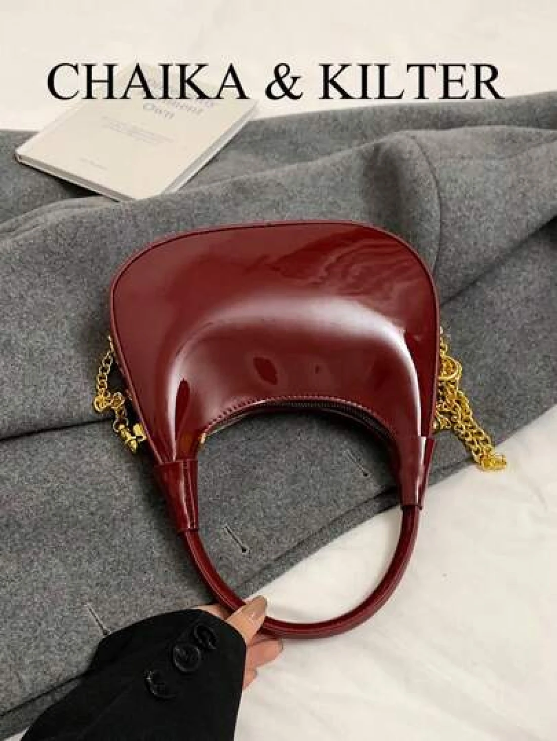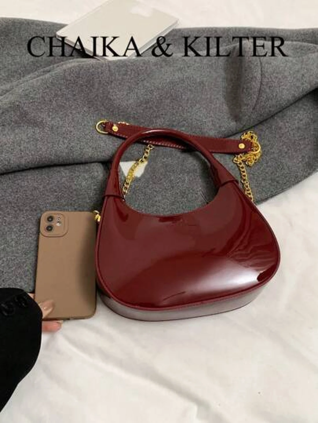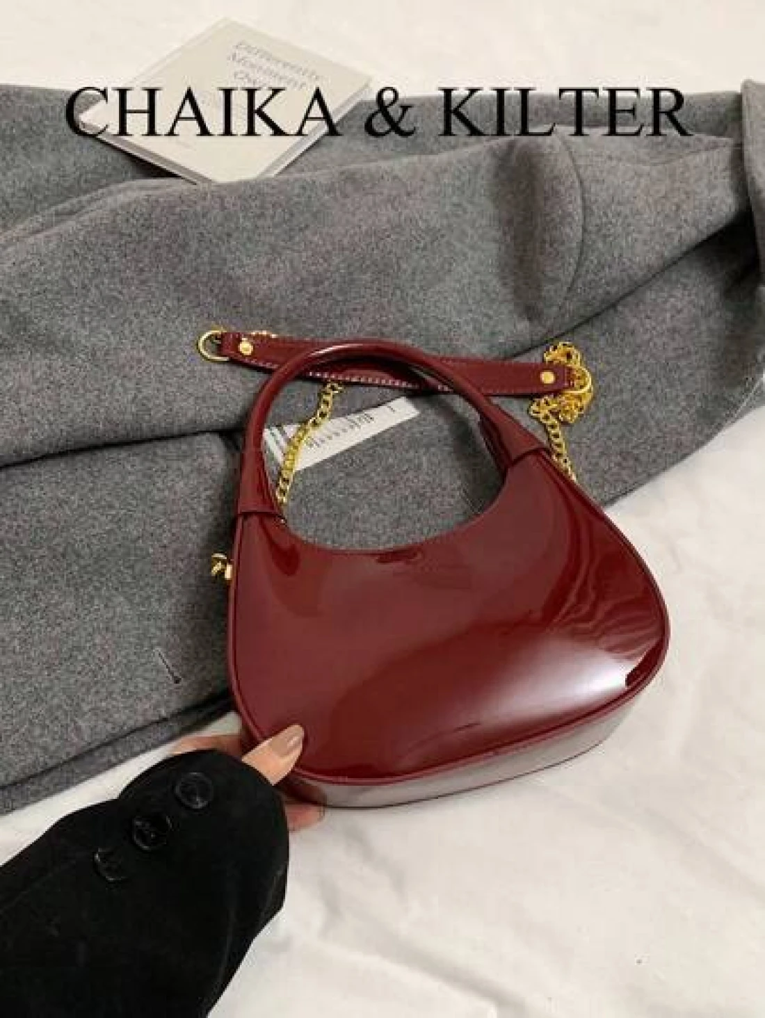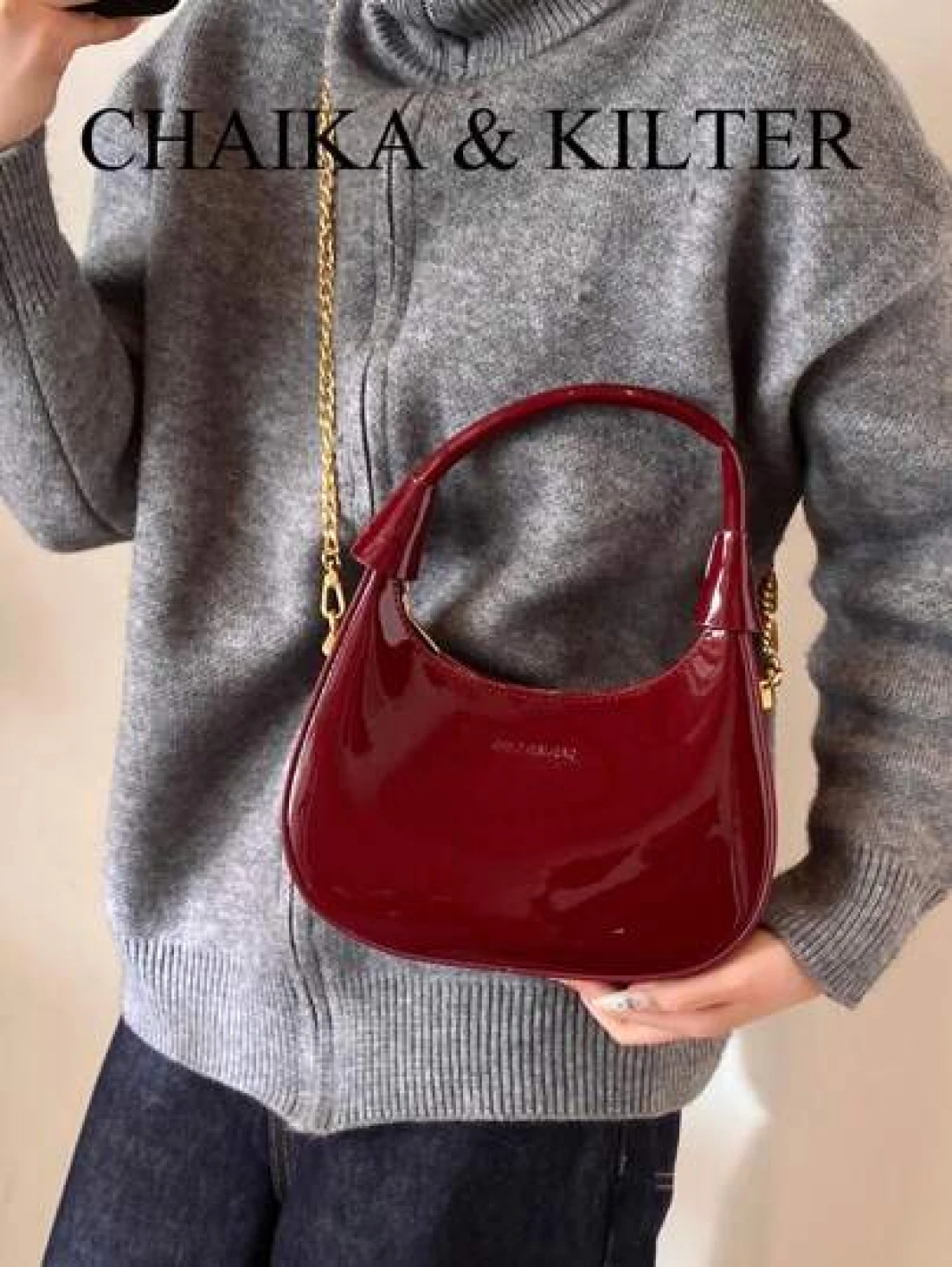 1pc CHAIKA KILTER Women Glossy PU Leather Tote Bag Fashionable Crescent Shaped Armpit Bag With Detachable Metal Chain Zipper Closure Suitable For Daily And Outdoor Use
