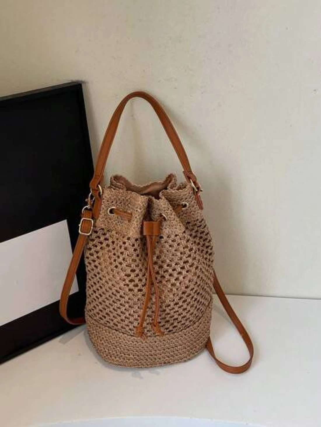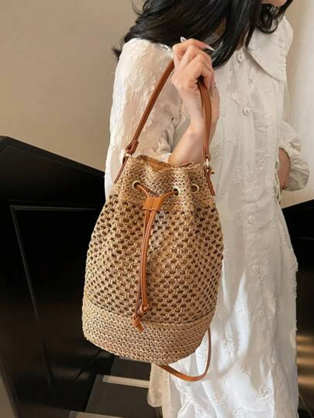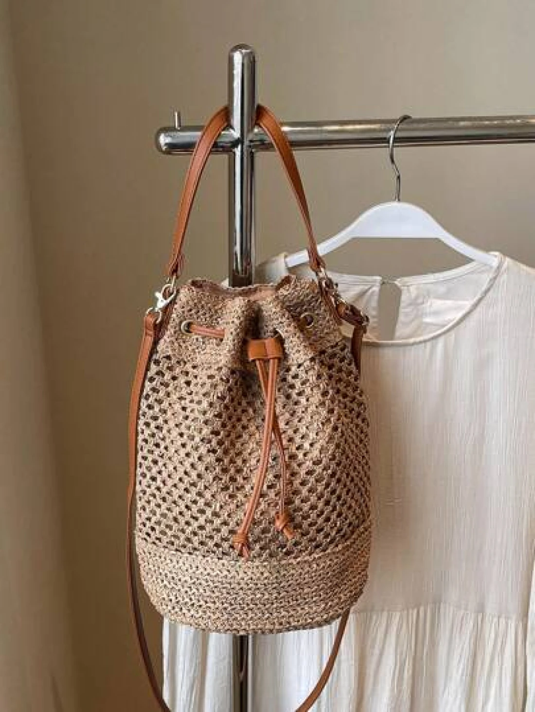1pc Women s Khaki Drawstring Closure Straw Bucket Bag Bohemian Style Fashion Handbag Tote Bag Suitable For Holiday Travel Suitable For Gifts Parties And Other Occasions