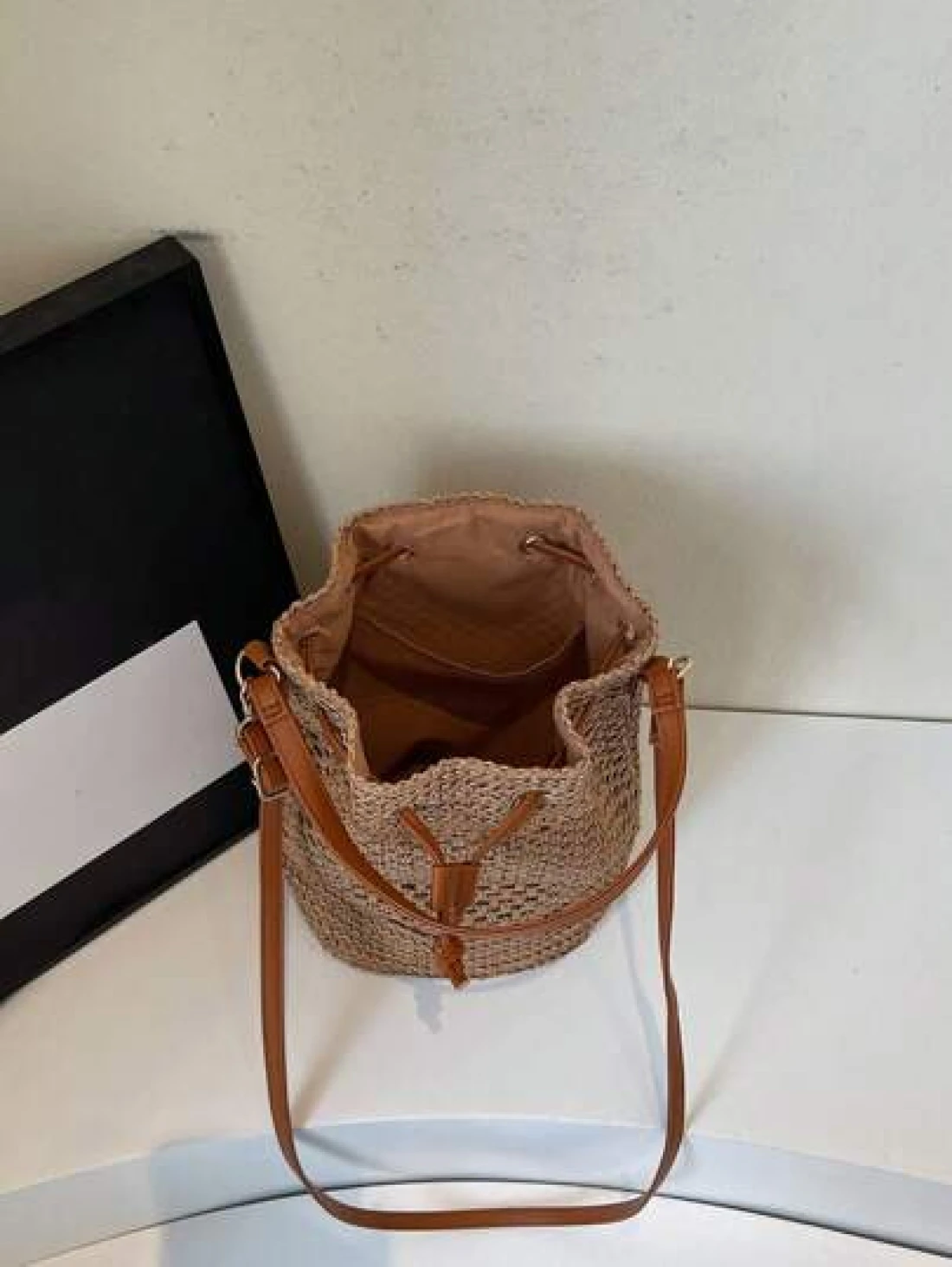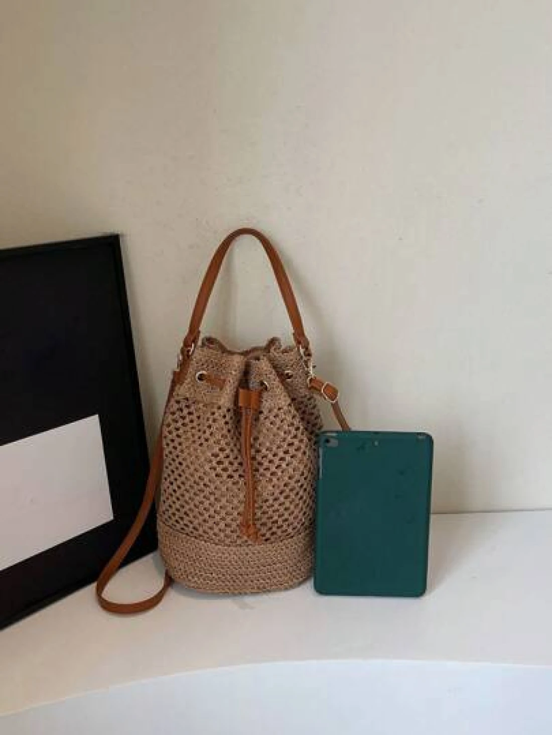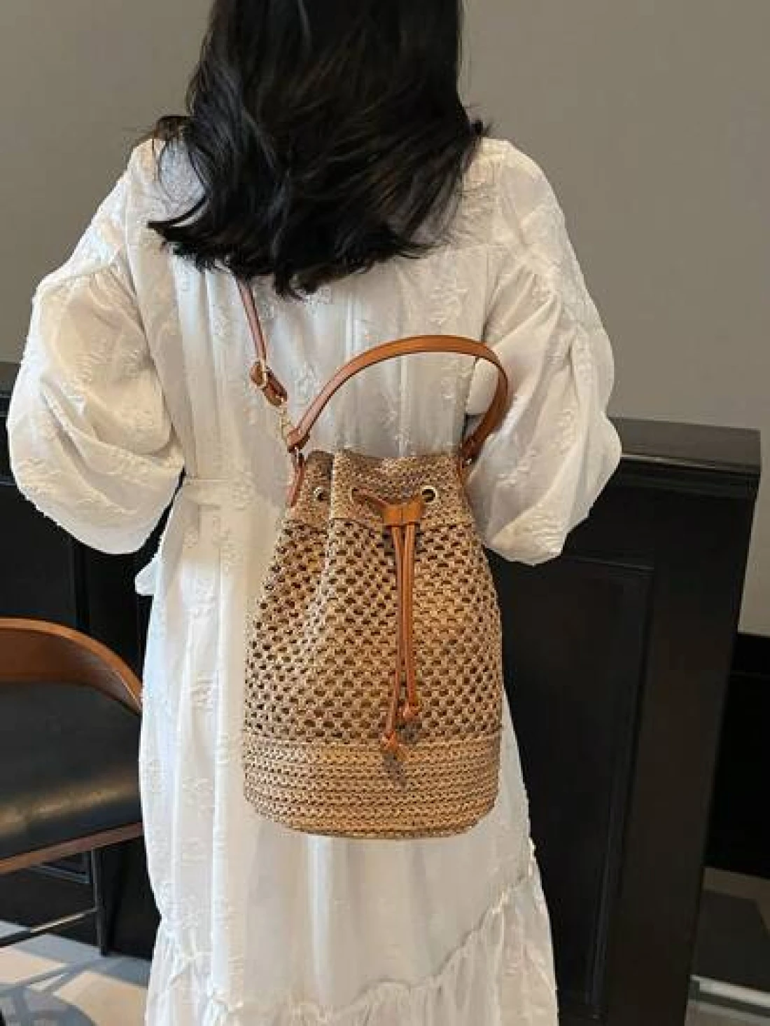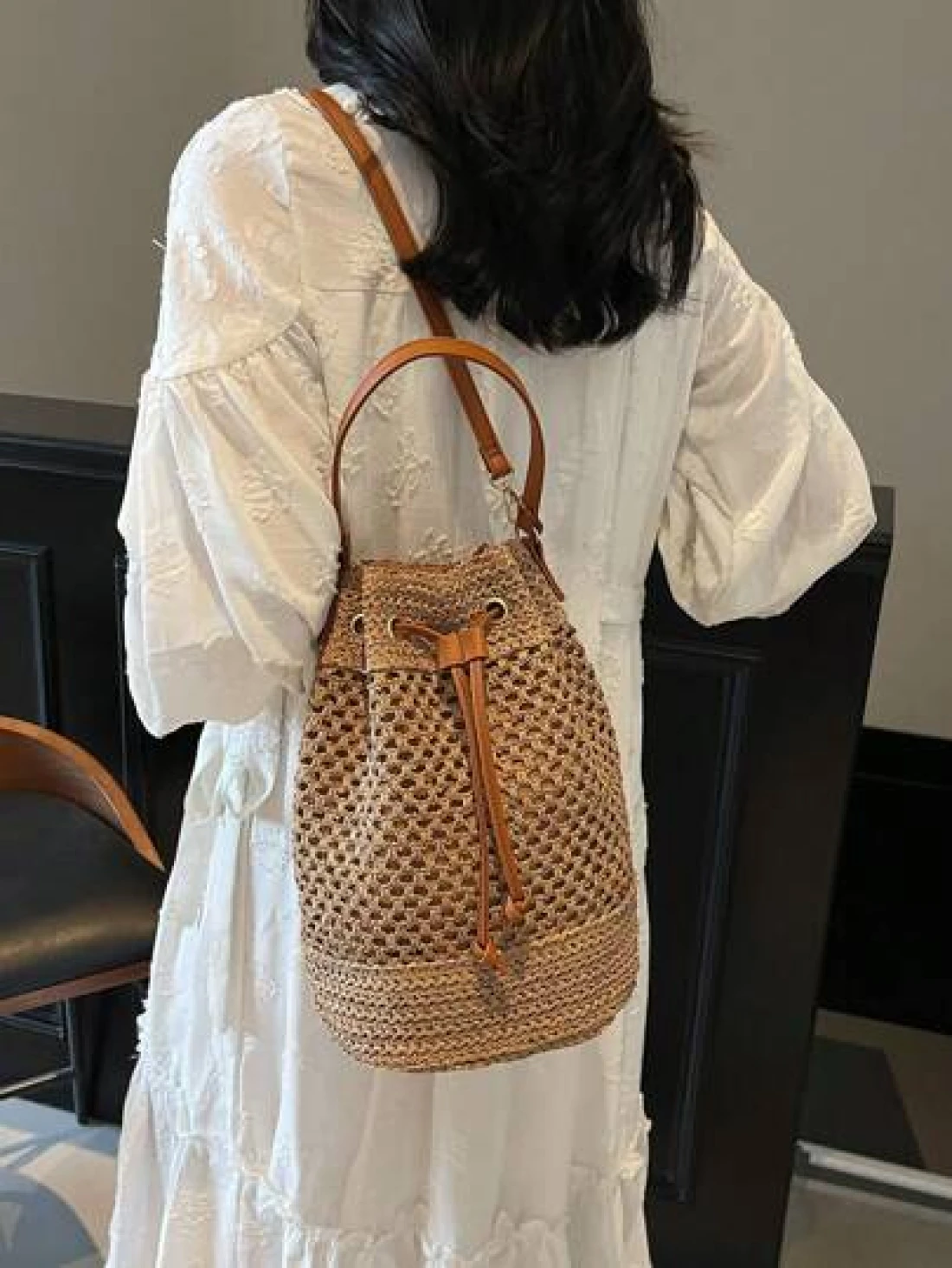 1pc Women s Khaki Drawstring Closure Straw Bucket Bag Bohemian Style Fashion Handbag Tote Bag Suitable For Holiday Travel Suitable For Gifts Parties And Other Occasions