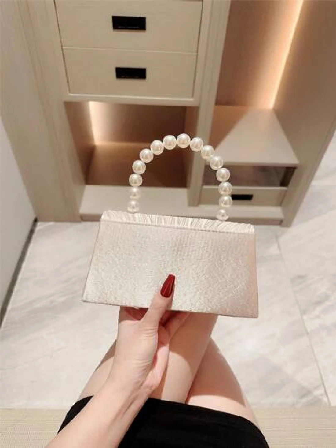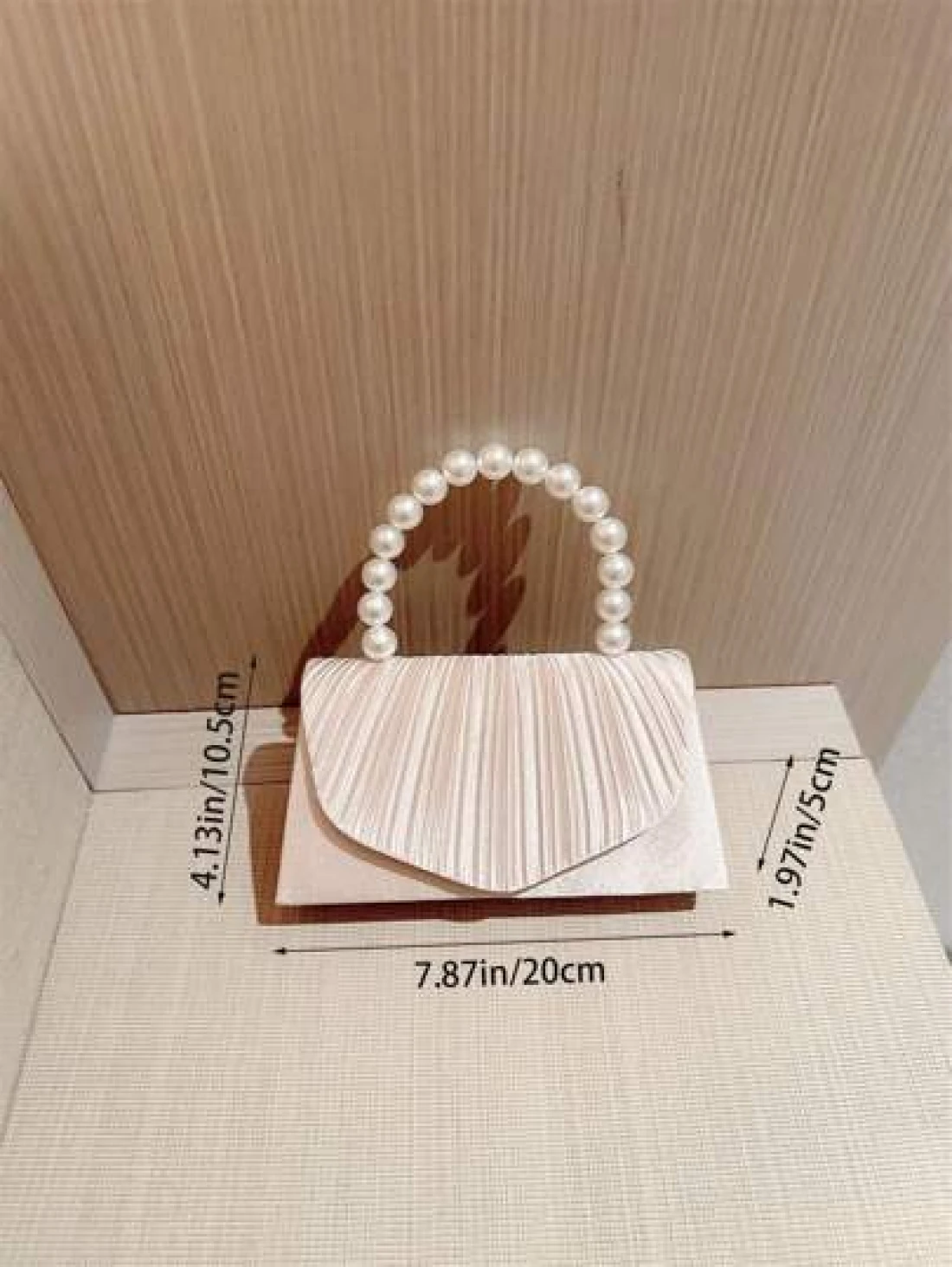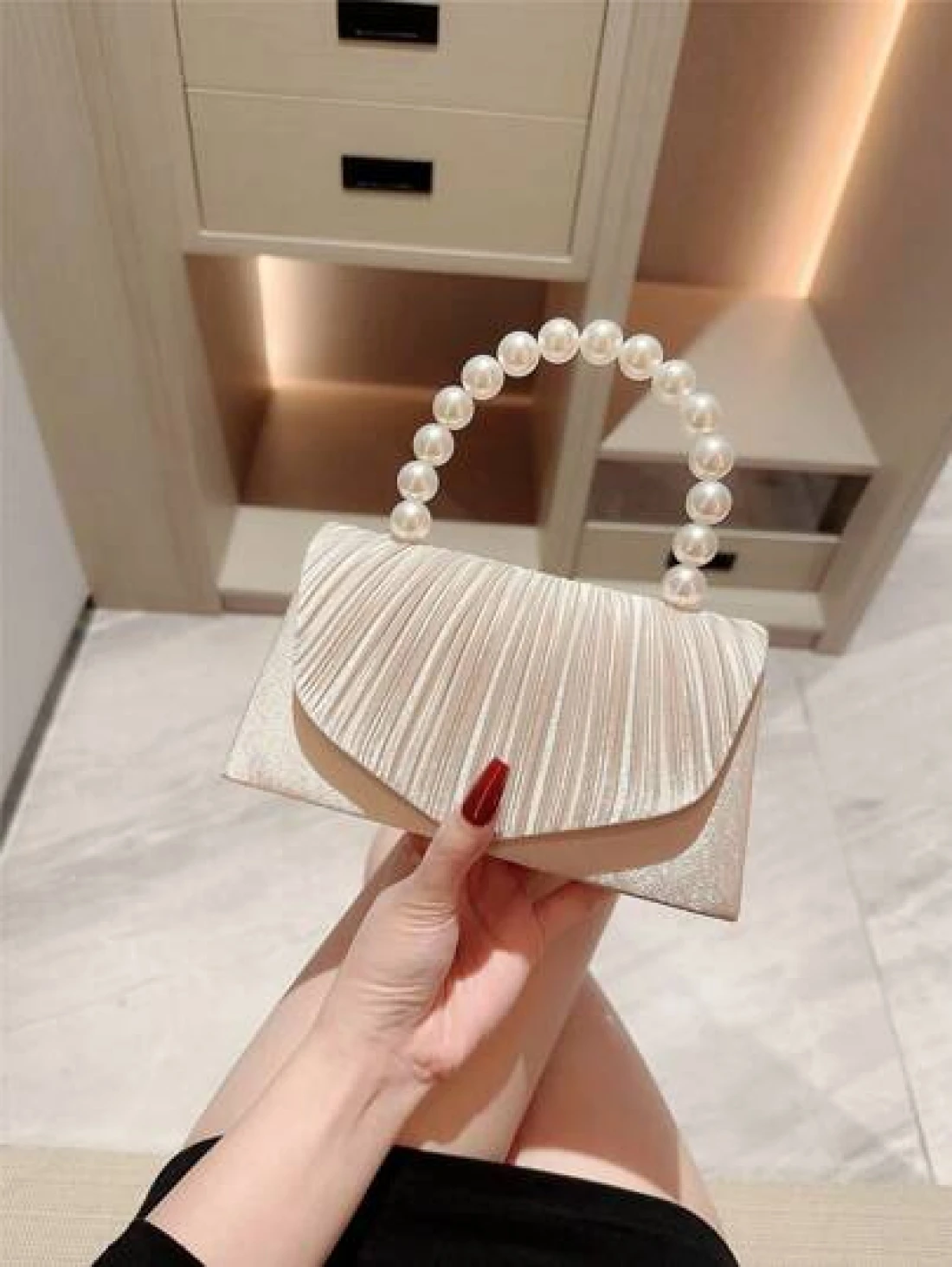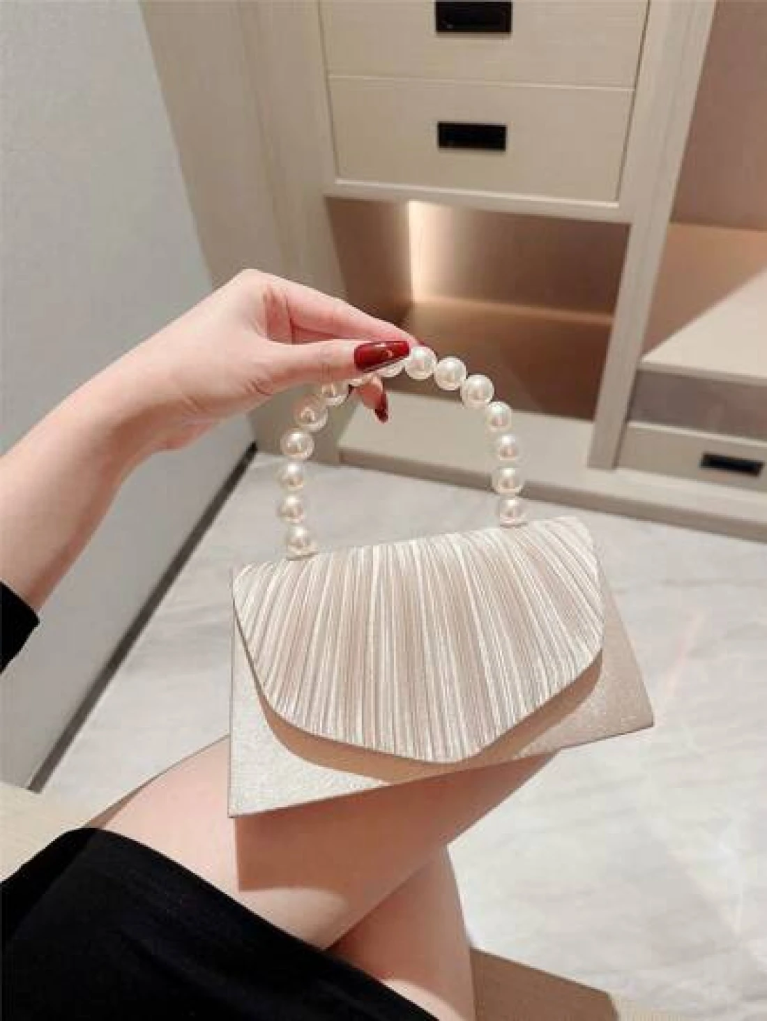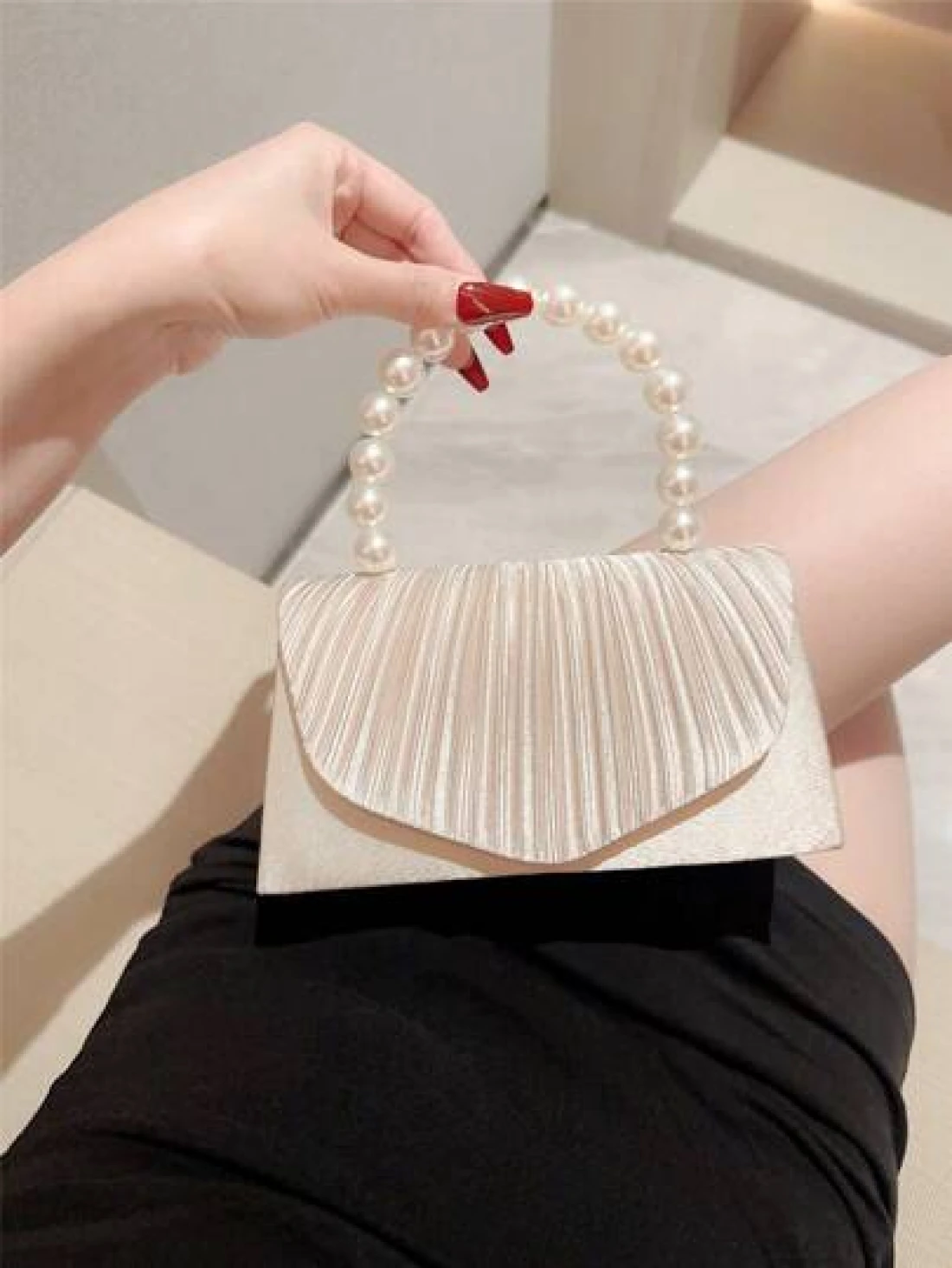 An Elegant Classic Pleated Design Evening Bag Romantic Faux Pearl Party Clutch Bag Luxury Satin Formal Dress Bag Flap Clutch With Chain Strap For Prom Perfectly Matching With New Years Outfit Excellently Matching With Party Dresses For Women Essential Wedding Items Perfectly Matching With Graduation Dress Prom Dresses Elegant Pearl Clutch Prom Bag