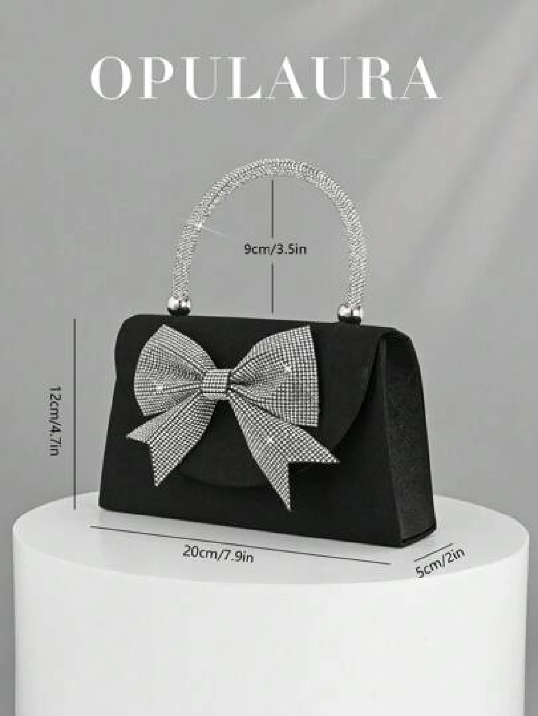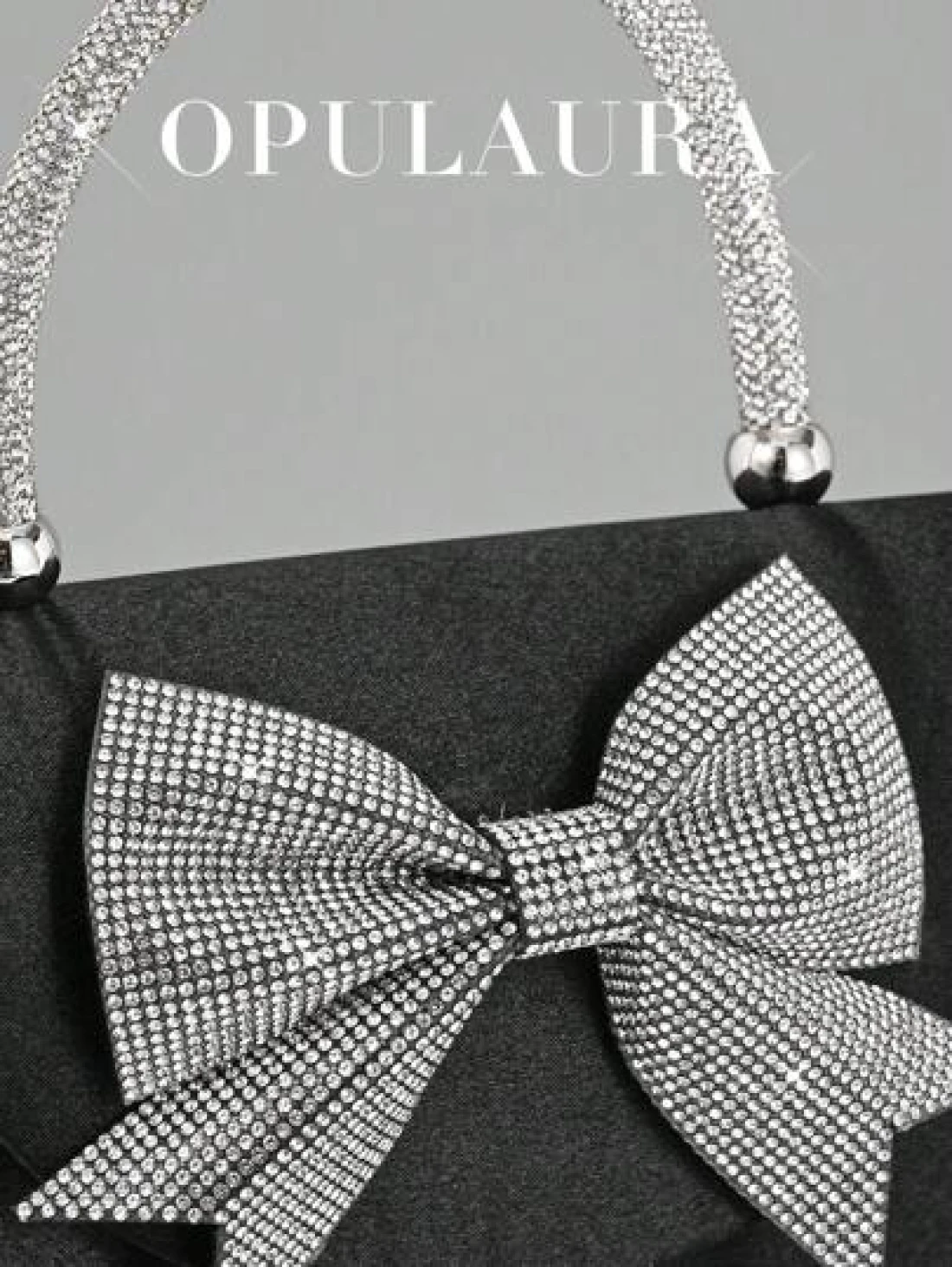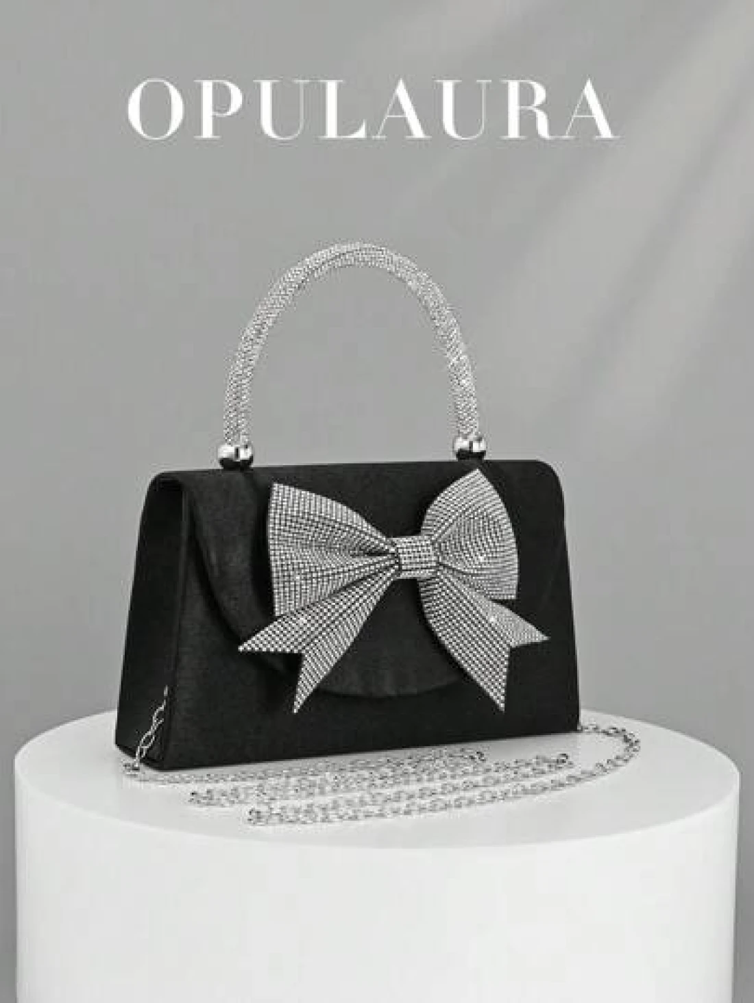OpulAura Women s European And American Fashion Black Satin Flap Clutch Evening Bag Sparkling Elegant Bowknot Rhinestone Decor Party Handbag Luxury Satin Formal Dress Bag Chain Shoulder Bag Suitable For Banquet Party Birthday Wedding