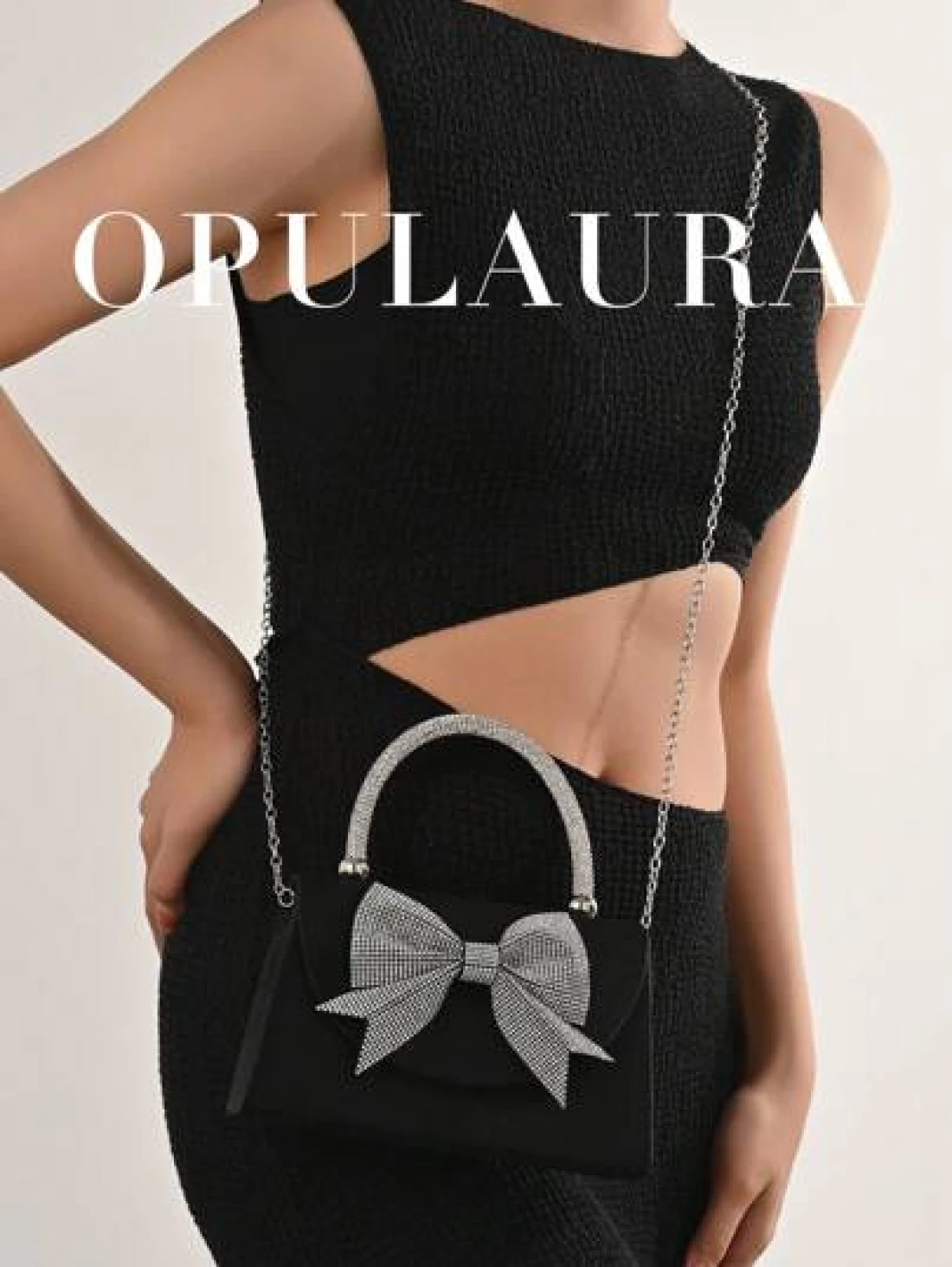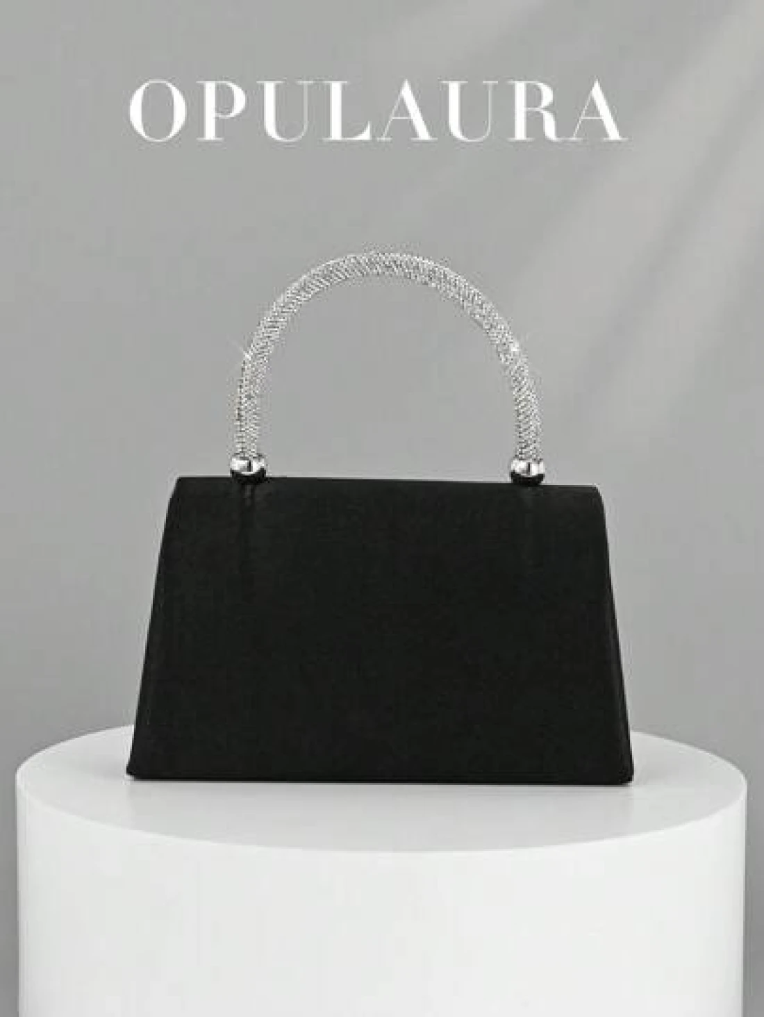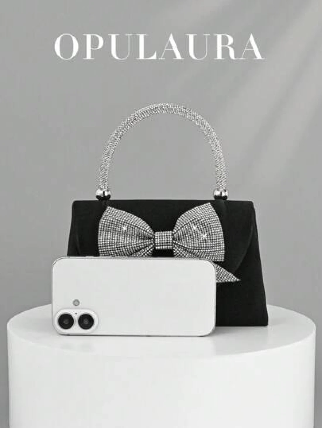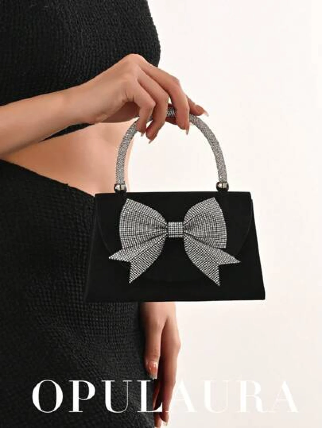 OpulAura Women s European And American Fashion Black Satin Flap Clutch Evening Bag Sparkling Elegant Bowknot Rhinestone Decor Party Handbag Luxury Satin Formal Dress Bag Chain Shoulder Bag Suitable For Banquet Party Birthday Wedding