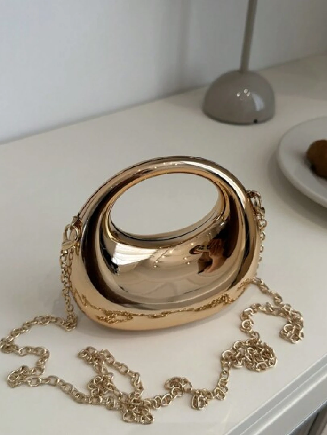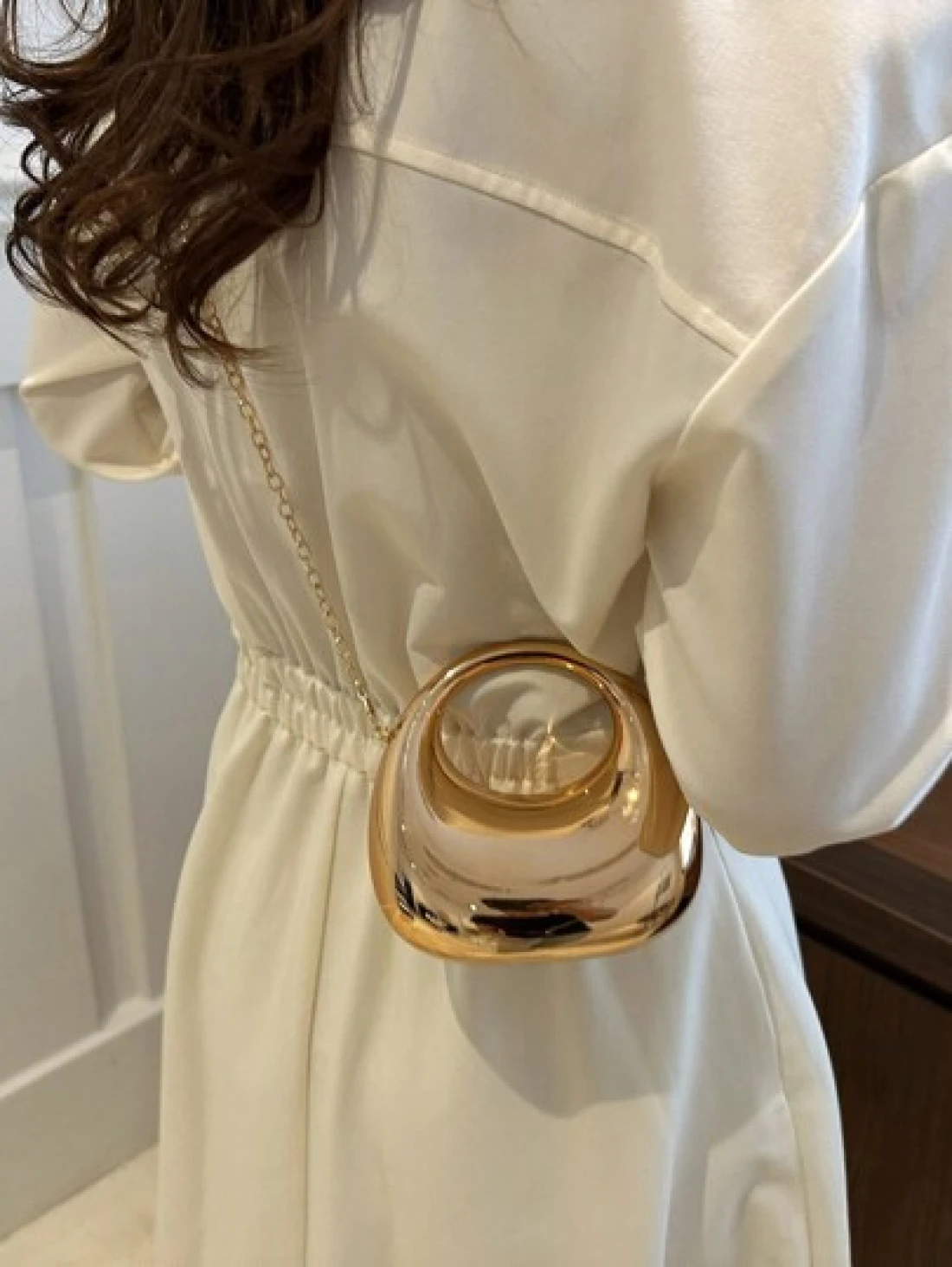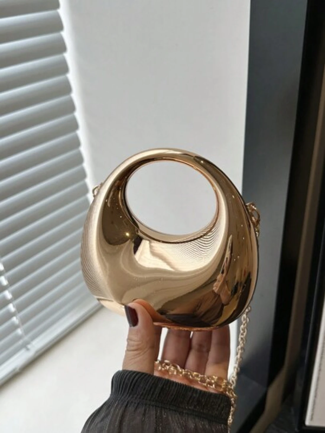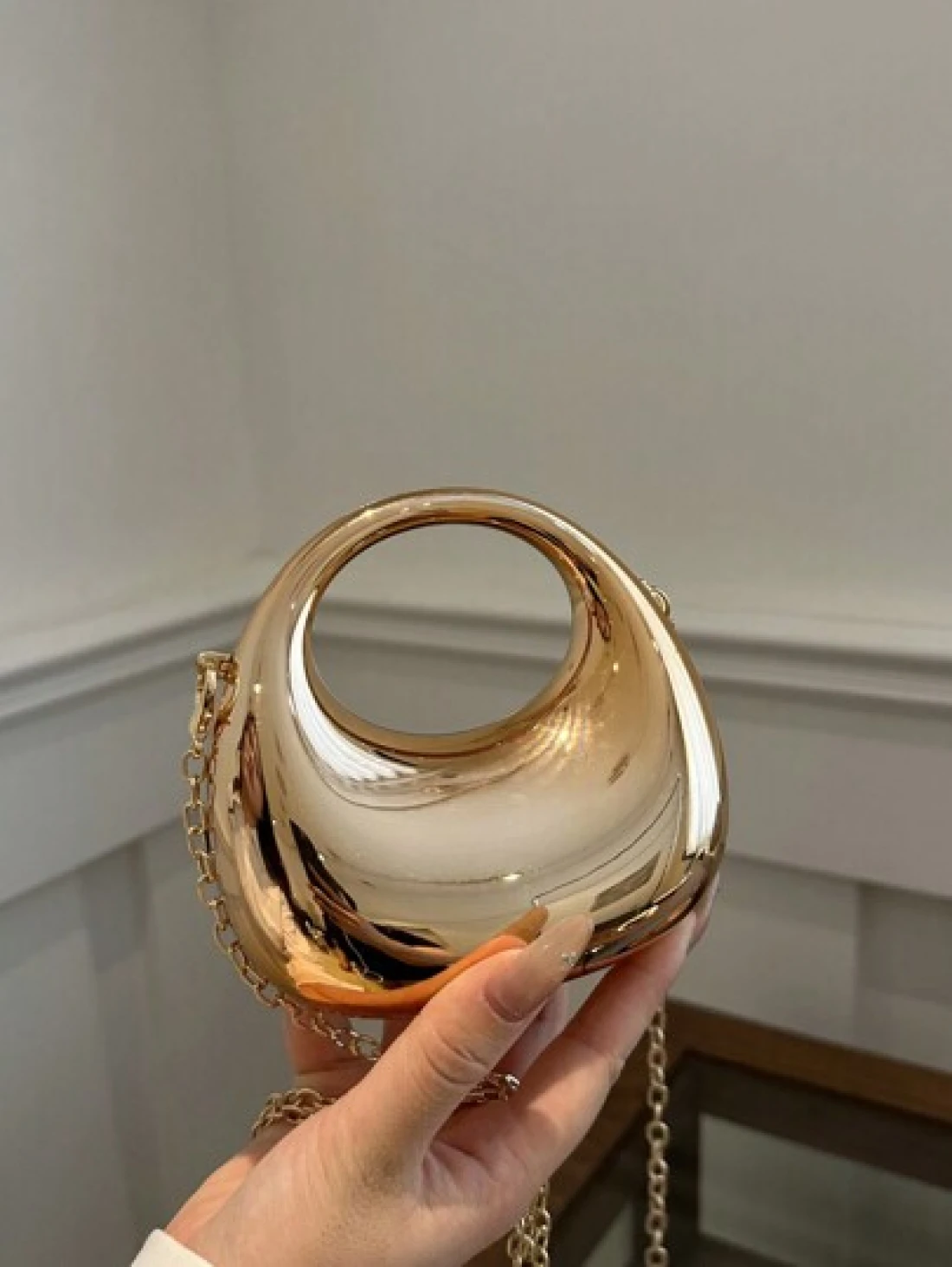 1pc New Avant Garde Metallic Acrylic Crescent Moon Shaped Mini Handbag Glossy Silver And Gold Tone Lunar Crossbody Shoulder Bag With Metallic Chain Fashion Versatile Makeup Cosmetic Earphone Pouch Mini Clutch Evening Bag Gift Box Perfectly Matching With Prom Accessories
