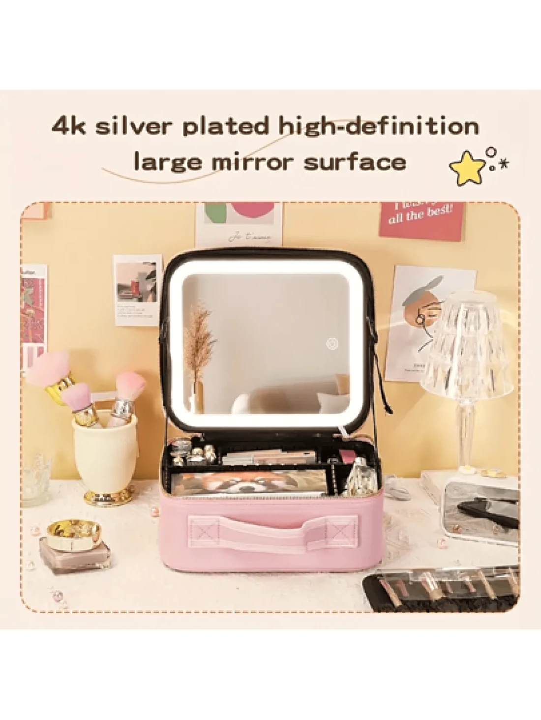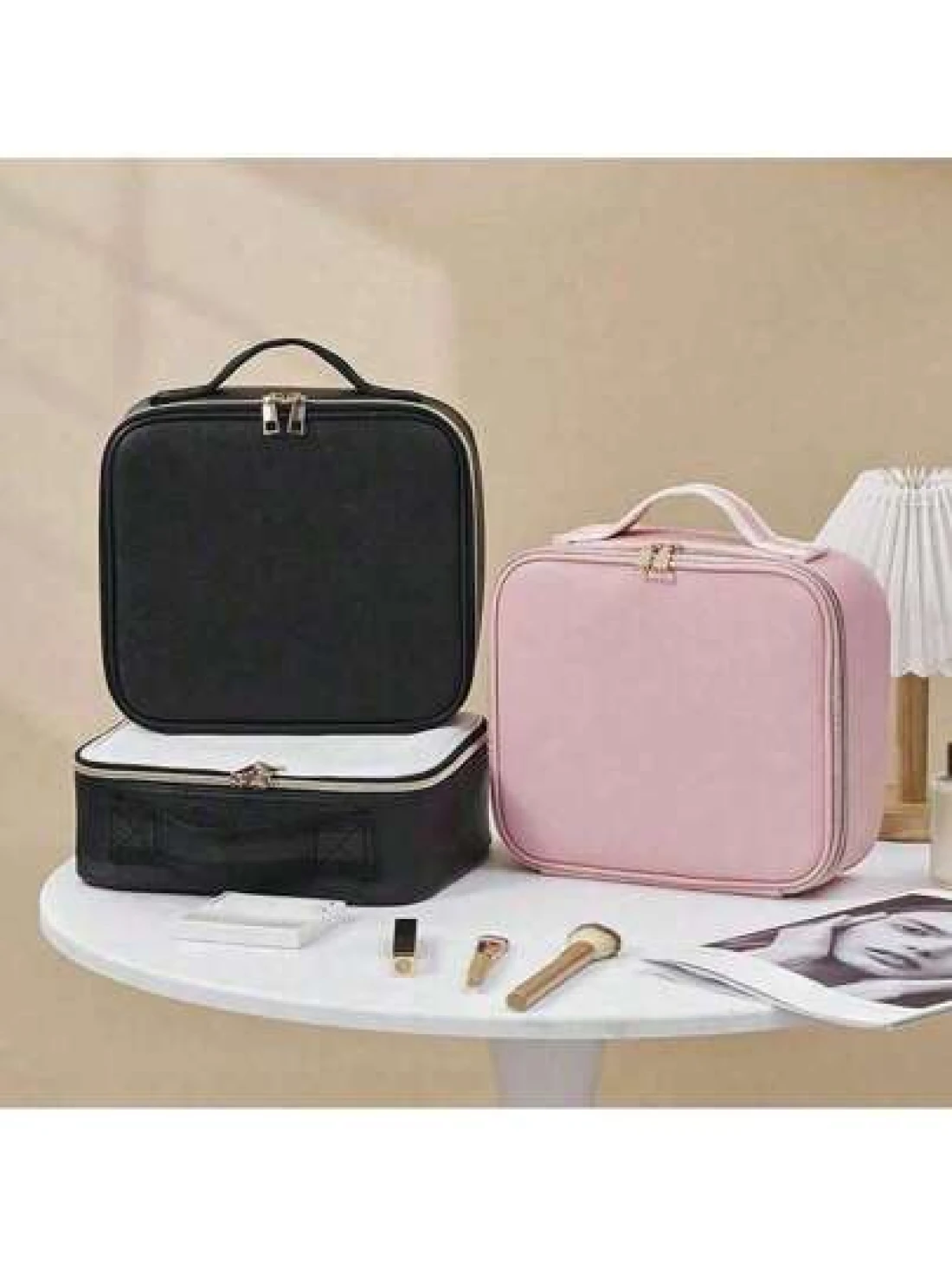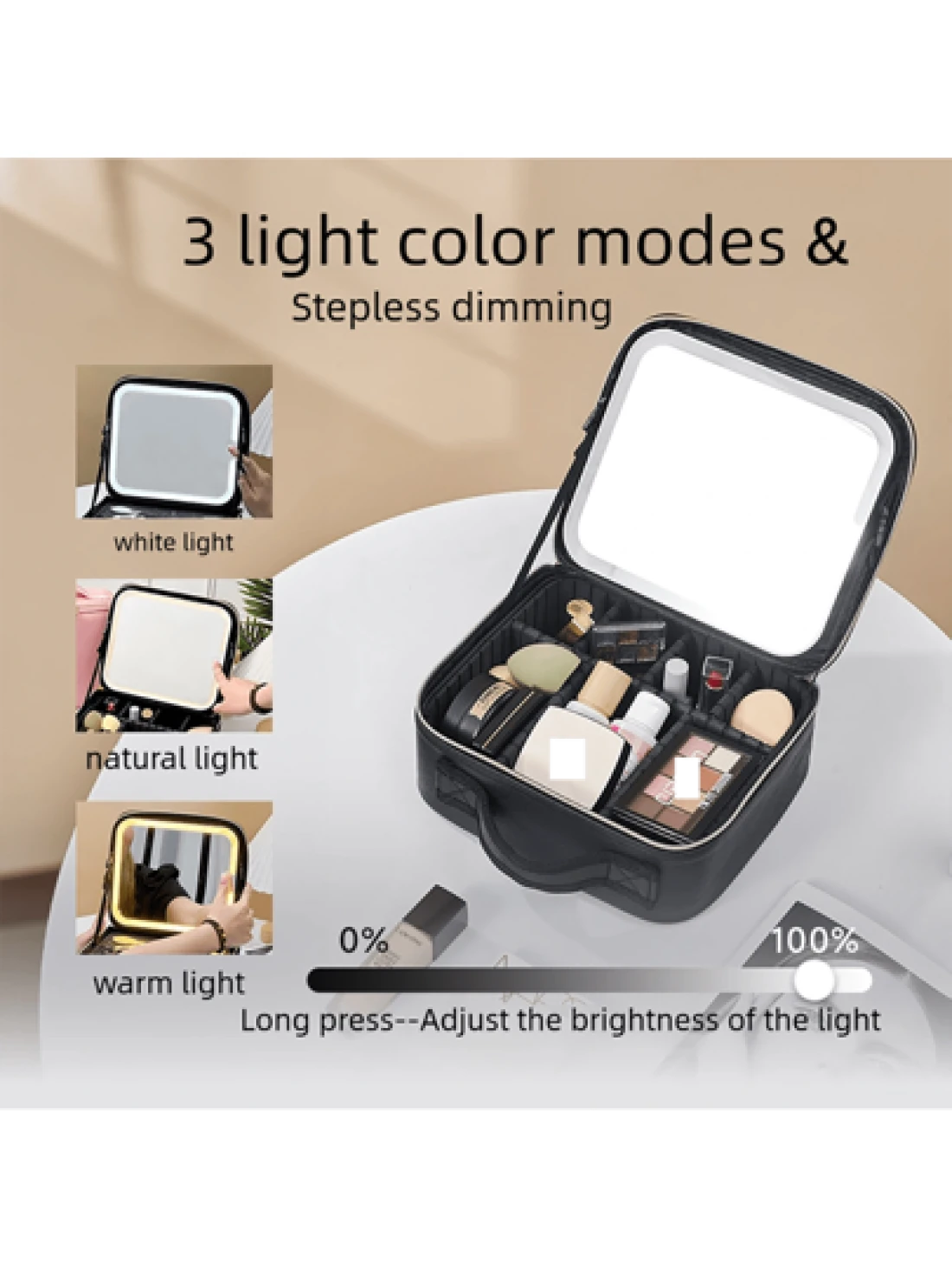 Makeup Bag With Light Up Mirror Travel Cosmetic Case Box 3 Color LED Lighted Mirror With Adjustable Brightness Waterproof Leather Adjustable Dividers Brush Organizer PU Leather Suitable For Girls And
