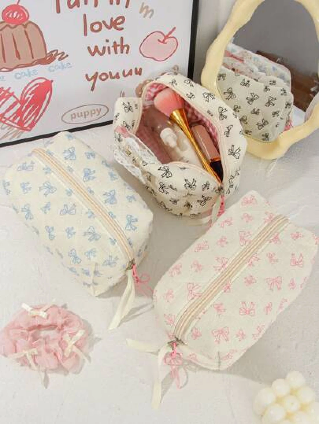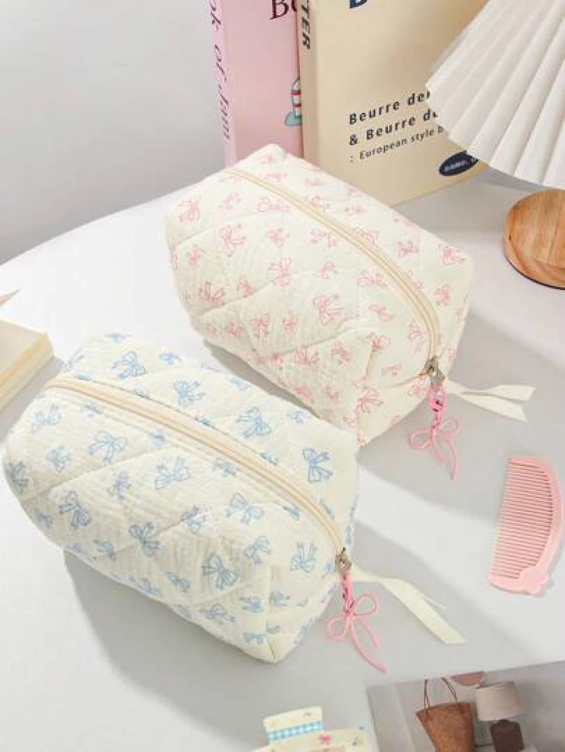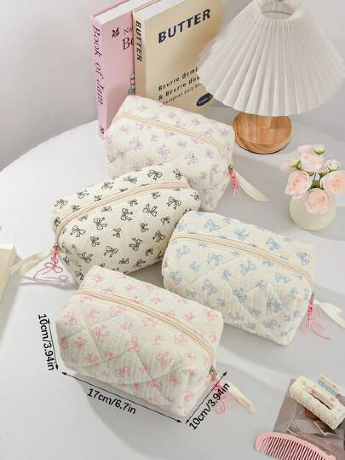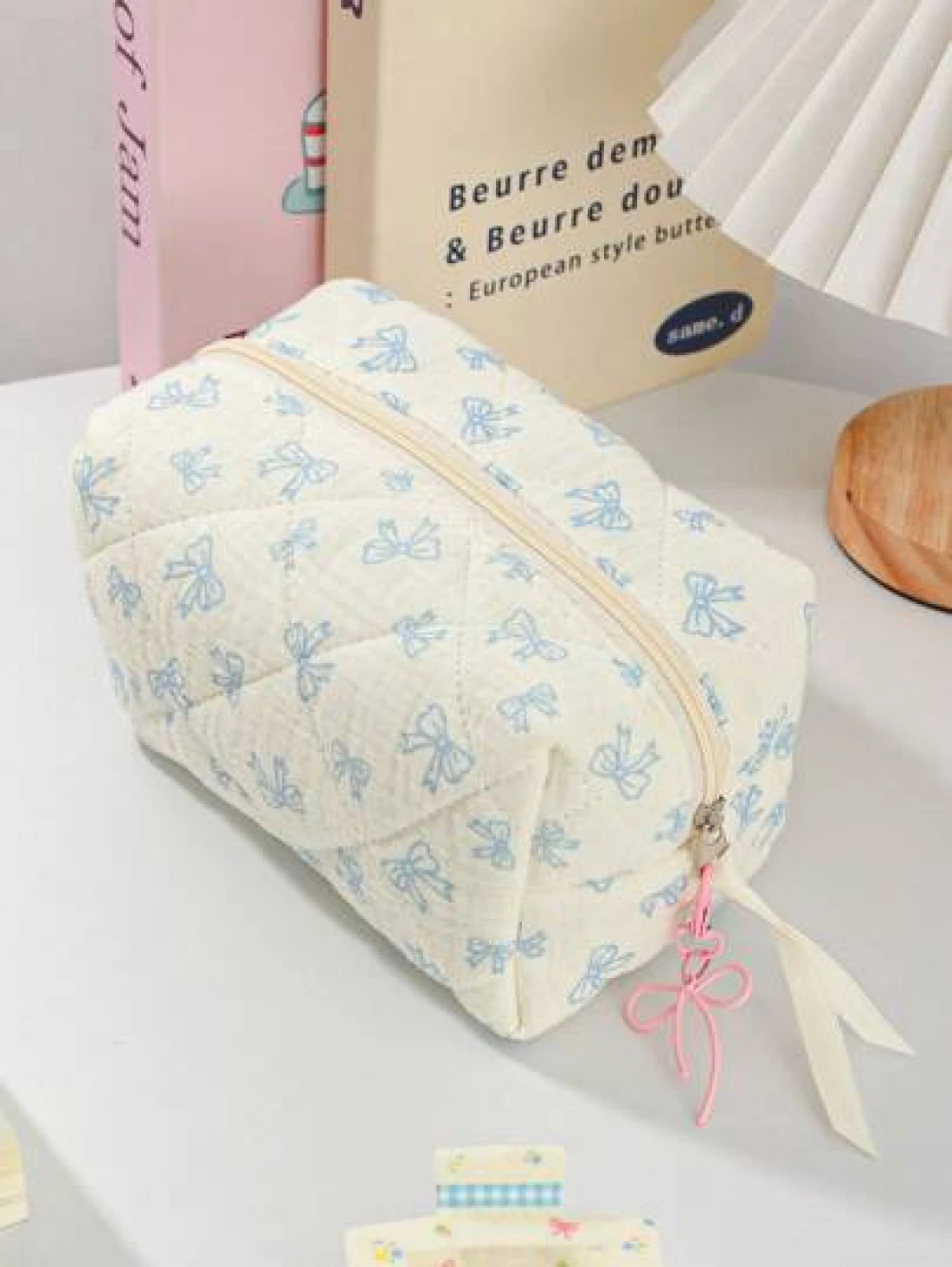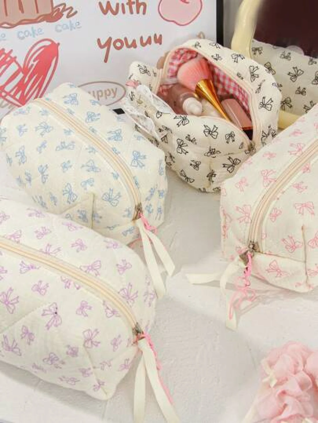 1Piece Quilted Handle Makeup Bag Small Quilted Cosmetic Bag Cute Bow Design Makeup Pouch Makeup Bag Aesthetic Travel Toiletry Bag Organizer Makeup Brushes Storage Bag For Women Bow Pencil Case For Mak