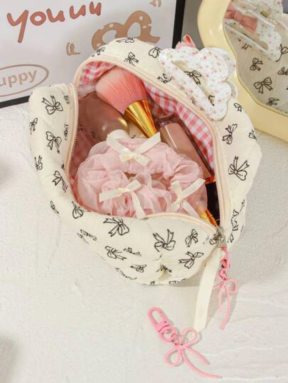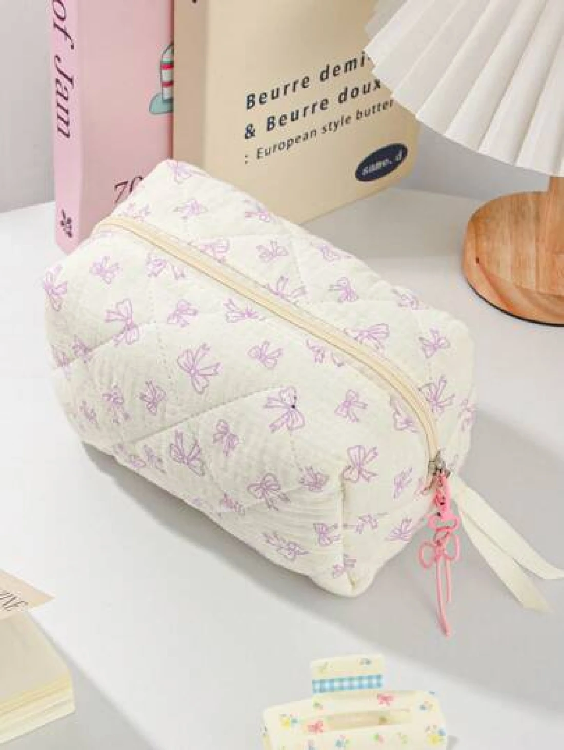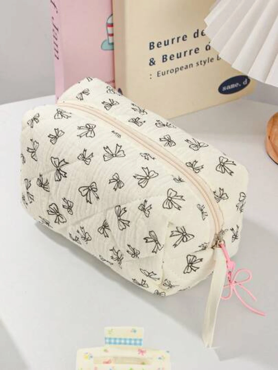 1Piece Quilted Handle Makeup Bag Small Quilted Cosmetic Bag Cute Bow Design Makeup Pouch Makeup Bag Aesthetic Travel Toiletry Bag Organizer Makeup Brushes Storage Bag For Women Bow Pencil Case For Makeup Pouch Skincare Bag