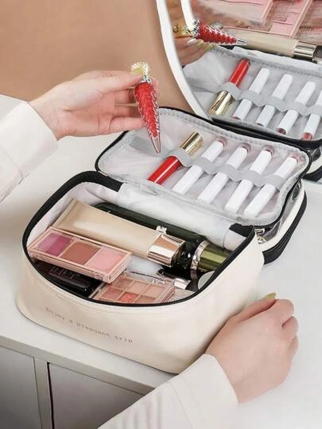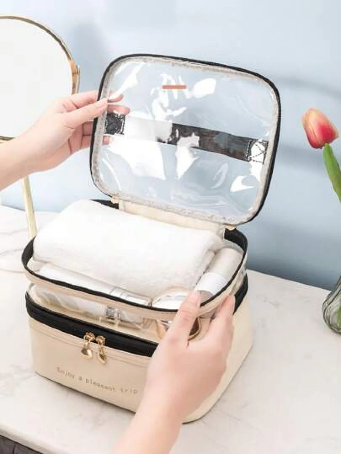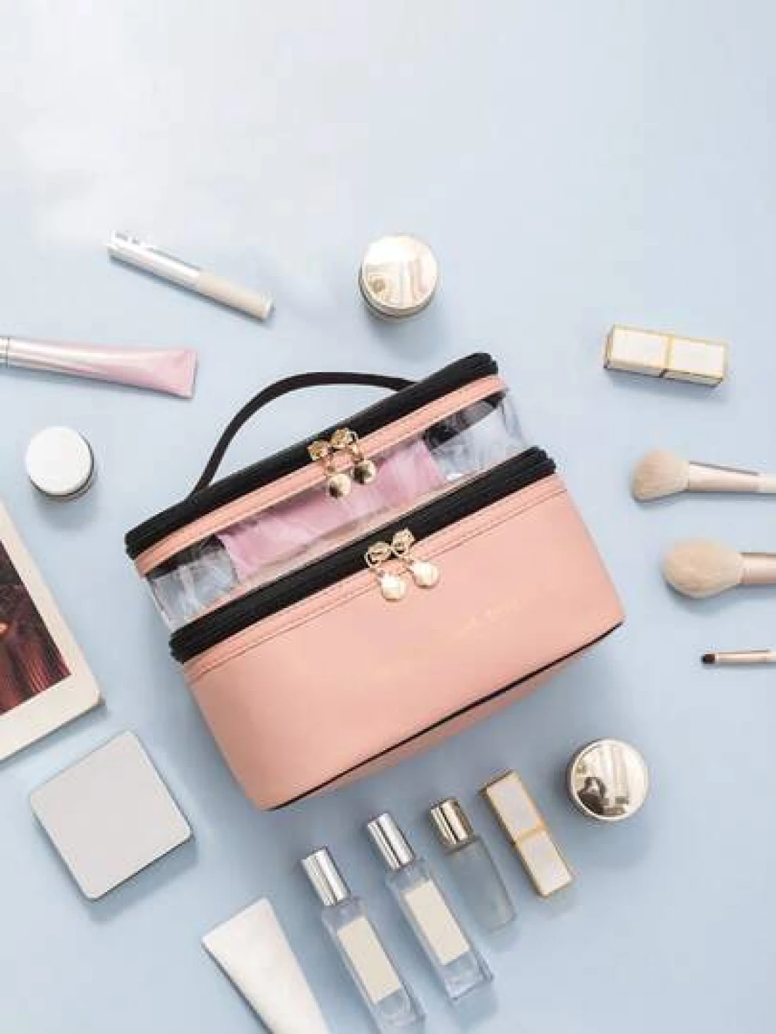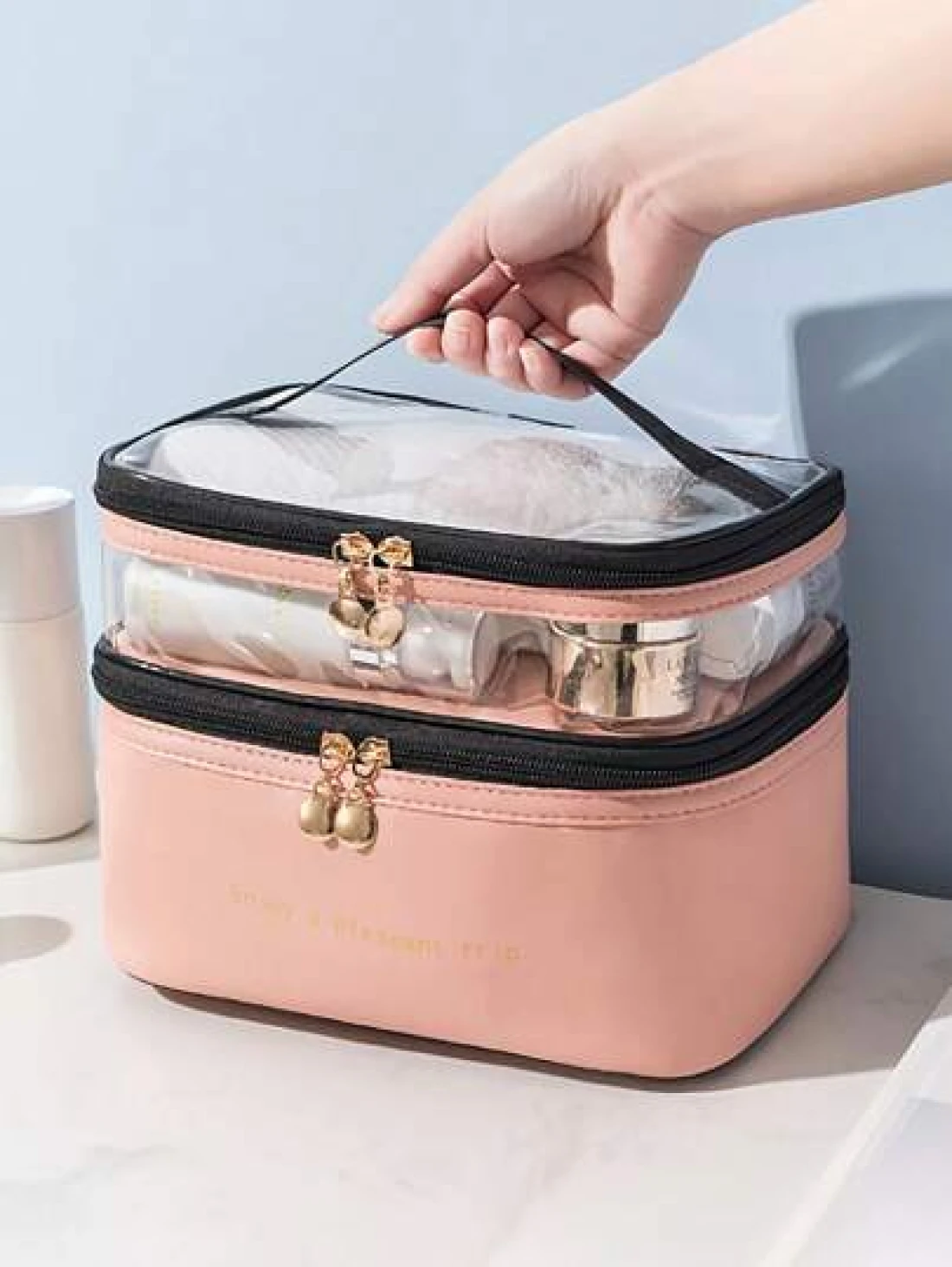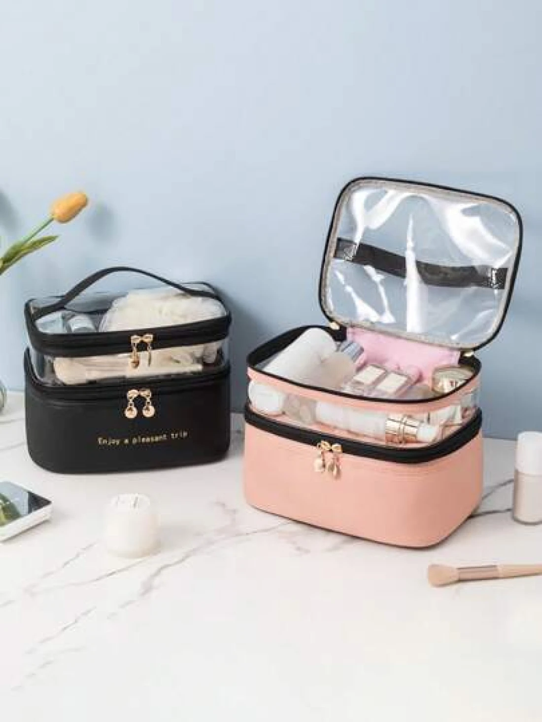 PU 2 Layers Cosmetic Bag Solid Color Travel Transparent Multifunctional Toiletry Handheld Fashionable Waterproof Large Capacity Storage Pouch Summer Travel Vacation Home Bathroom Decor Holiday Makeup Organizer