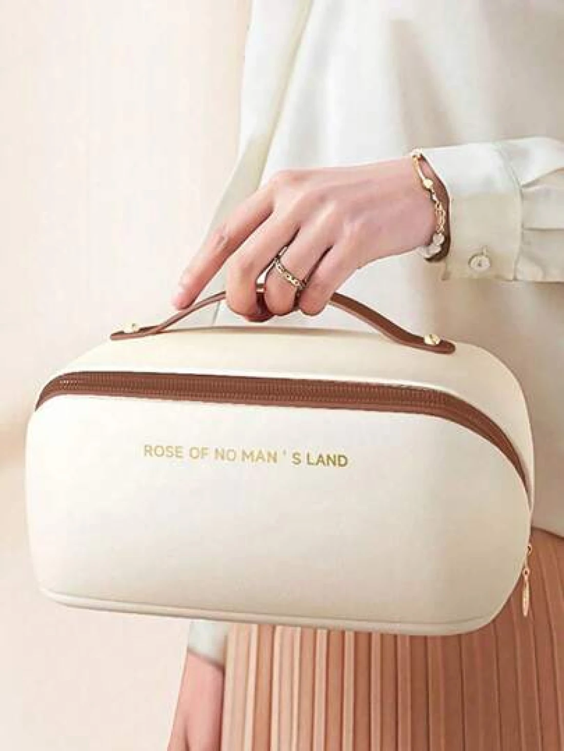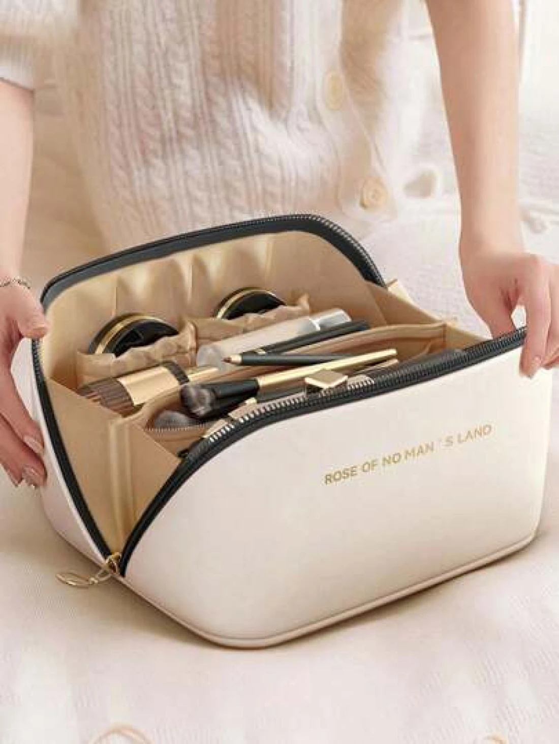 Large Capacity Spacious Double Layer Makeup Bag Cosmetic Organizer Bag PU Leather Waterproof Makeup Pouch Lightweight Toiletry Bag With Compartments Big Capacity Travel Makeup Storage Bag Multi Functi