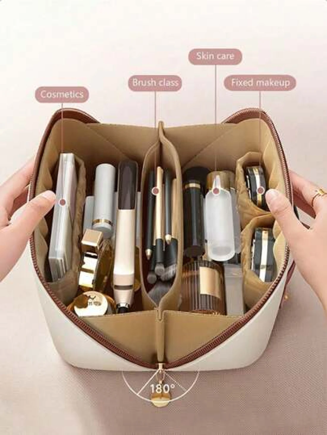 Large Capacity Spacious Double Layer Makeup Bag Cosmetic Organizer Bag PU Leather Waterproof Makeup Pouch Lightweight Toiletry Bag With Compartments Big Capacity Travel Makeup Storage Bag Multi Functional Travel Organizer Bag Home Travel Cosmetic Bag With Divider And Handle