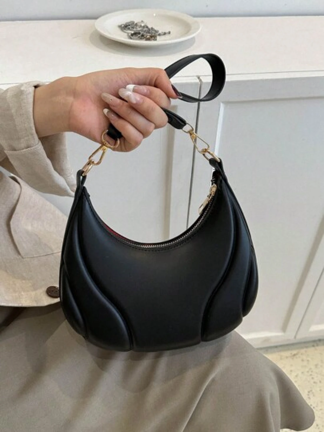Hot Search Crescent Handbag 1 Piece Solid Acrylic Chain Decoration PU Portable Elegant Zipper Shoulder Bag Handbag Suitable For Girls To Travel And Daily Use