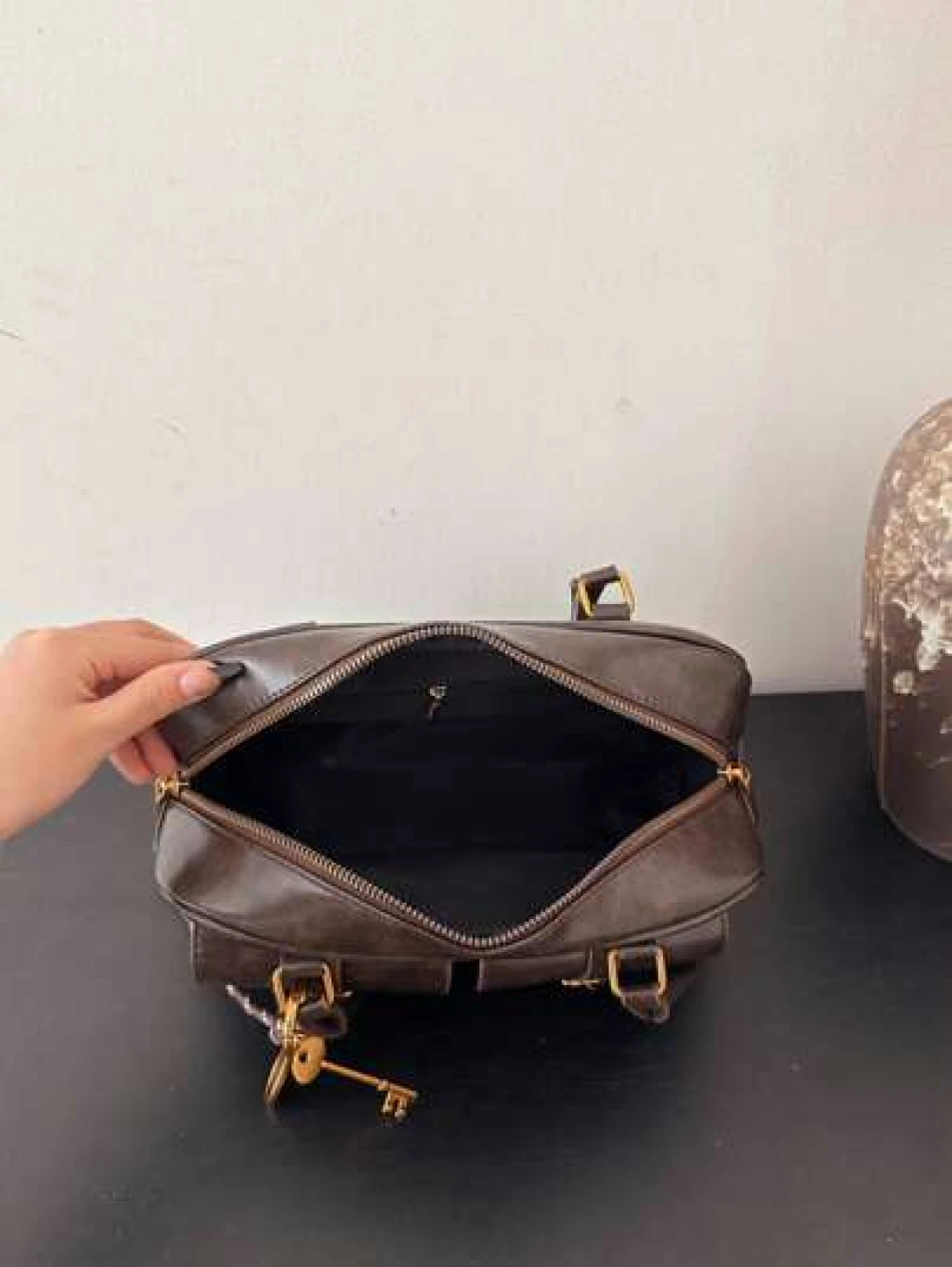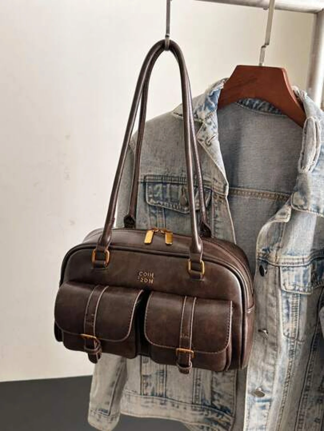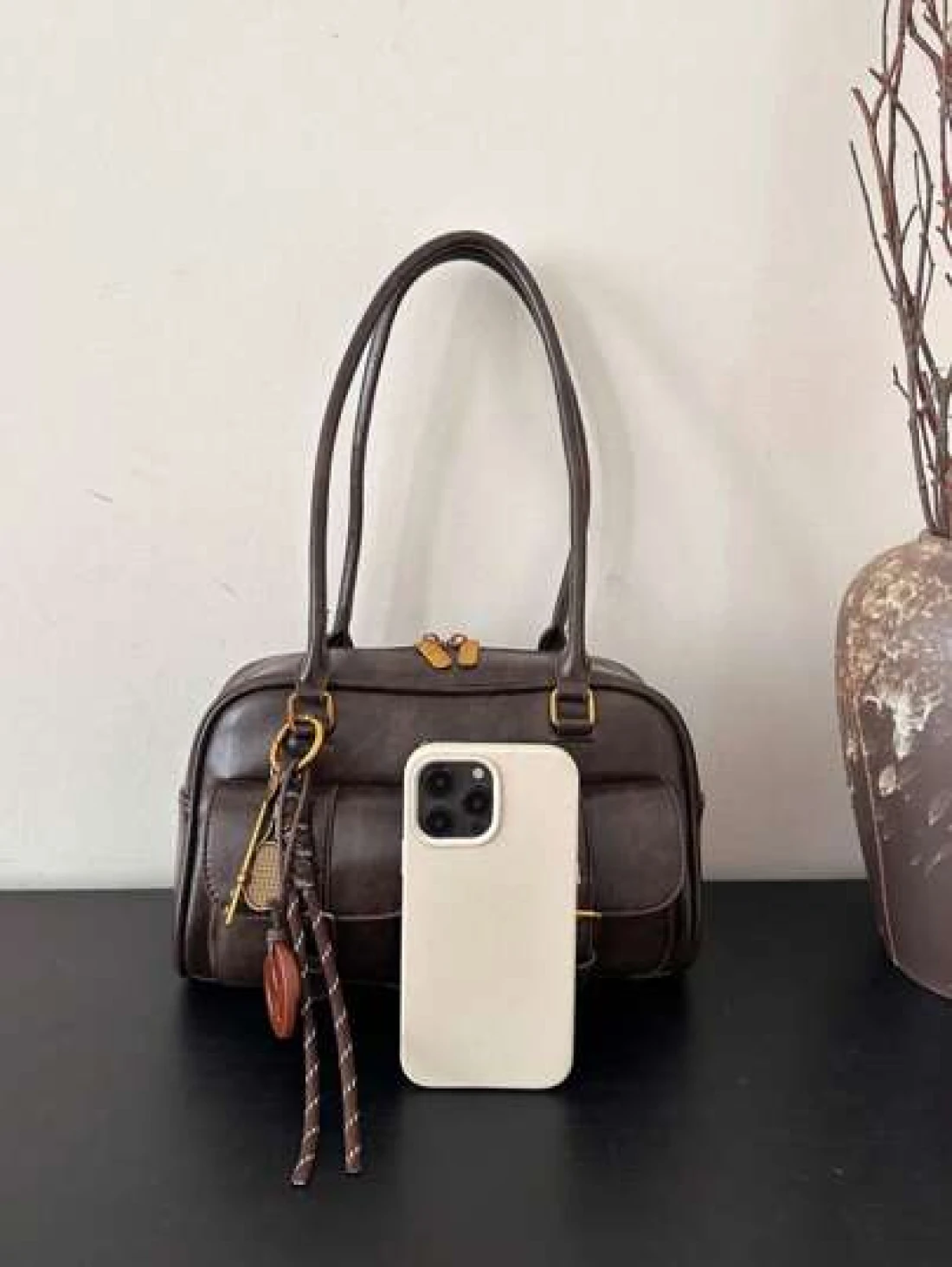 Faux Leather Solid Color Retro Multiple Pocket Large Capacity Women s Shoulder Bag With Hanging Decorations Suitable For Women s Daily Use And Travel Holiday