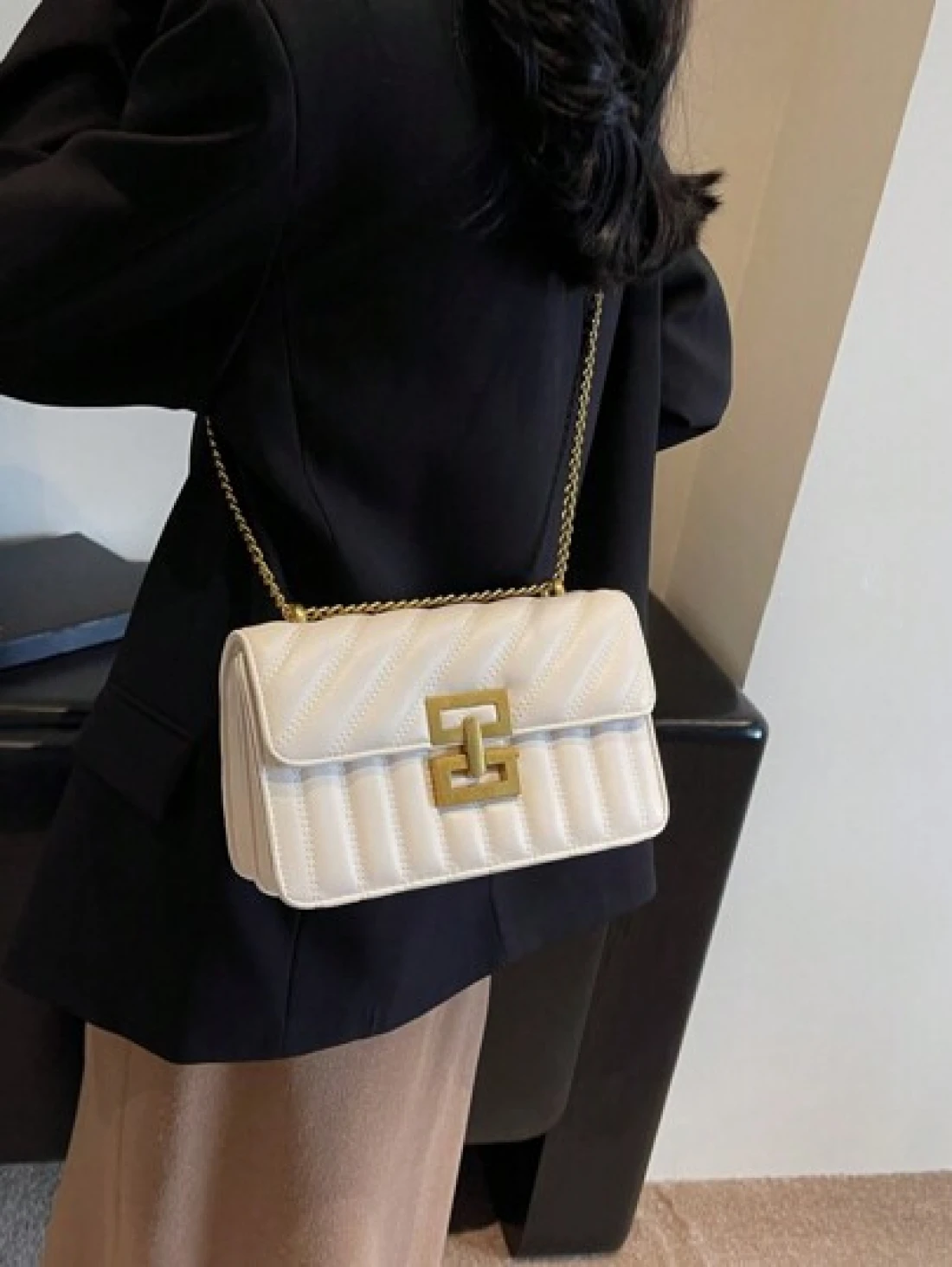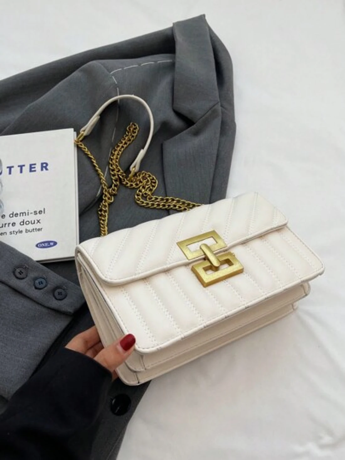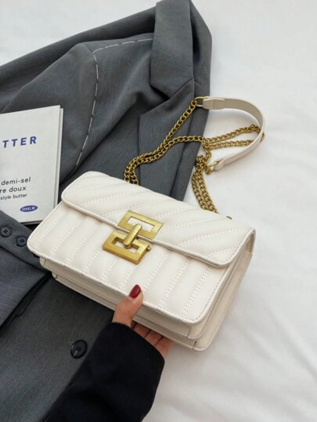 1pc Ladies Embroidery Striped Fashionable Lock Closure Square Bag Purse With Colorful Chain Suitable For Dating And Gift