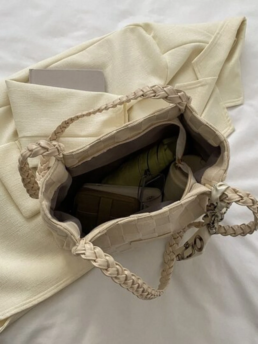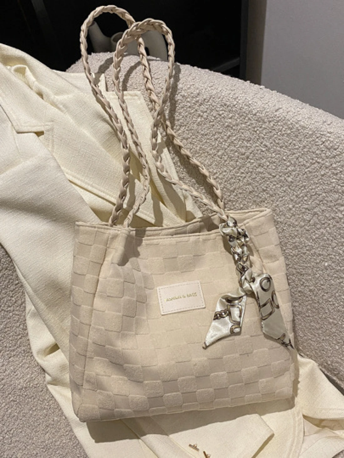 Scarf Letter Patch Decor Textured Square Bagtote Bag Handbag Shoulder BagCasual FashionGeometricLightweight Portable Large CapcityFor Girl For College Students For Woman For Women Rookies White Collar
