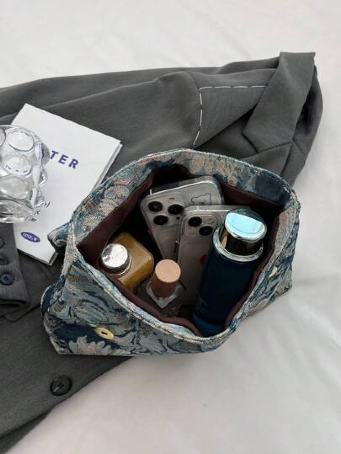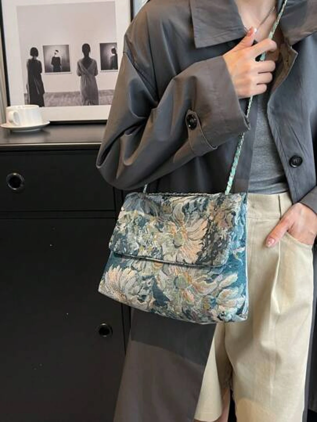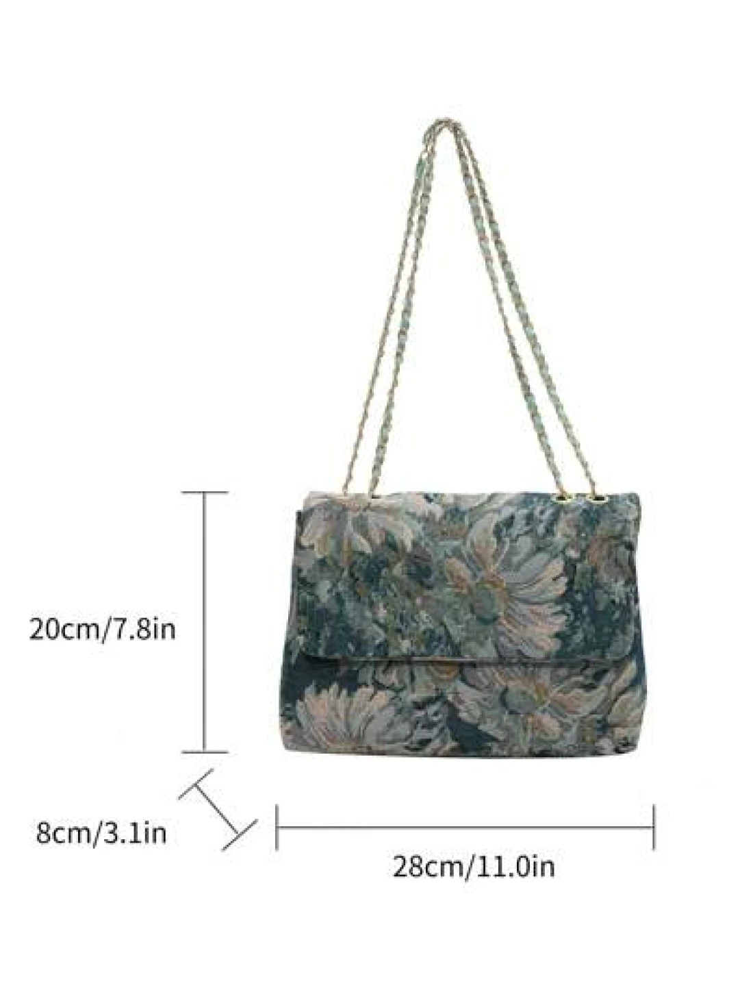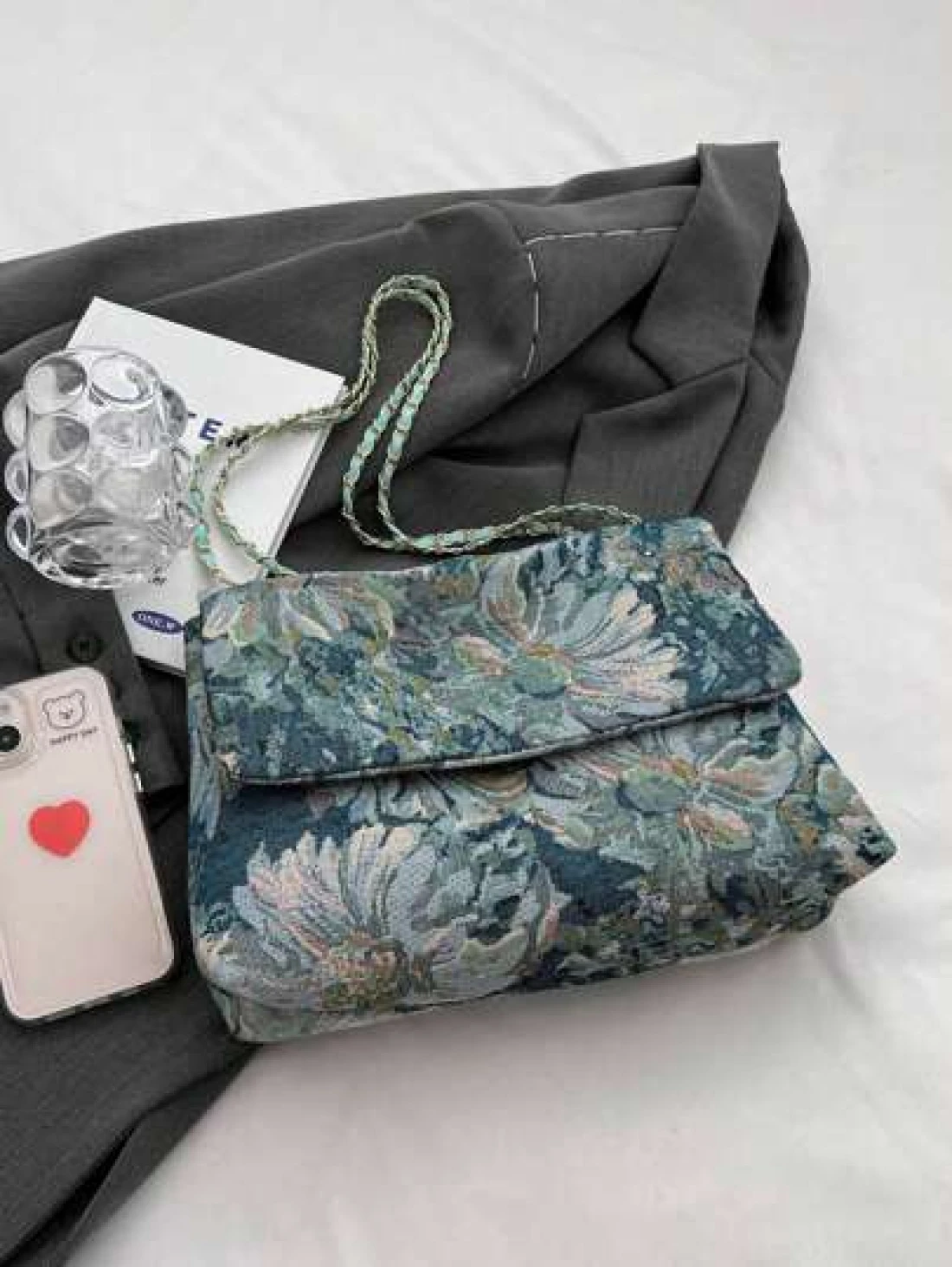Floral Pattern Square Bag Flap Polyester Chain Strap