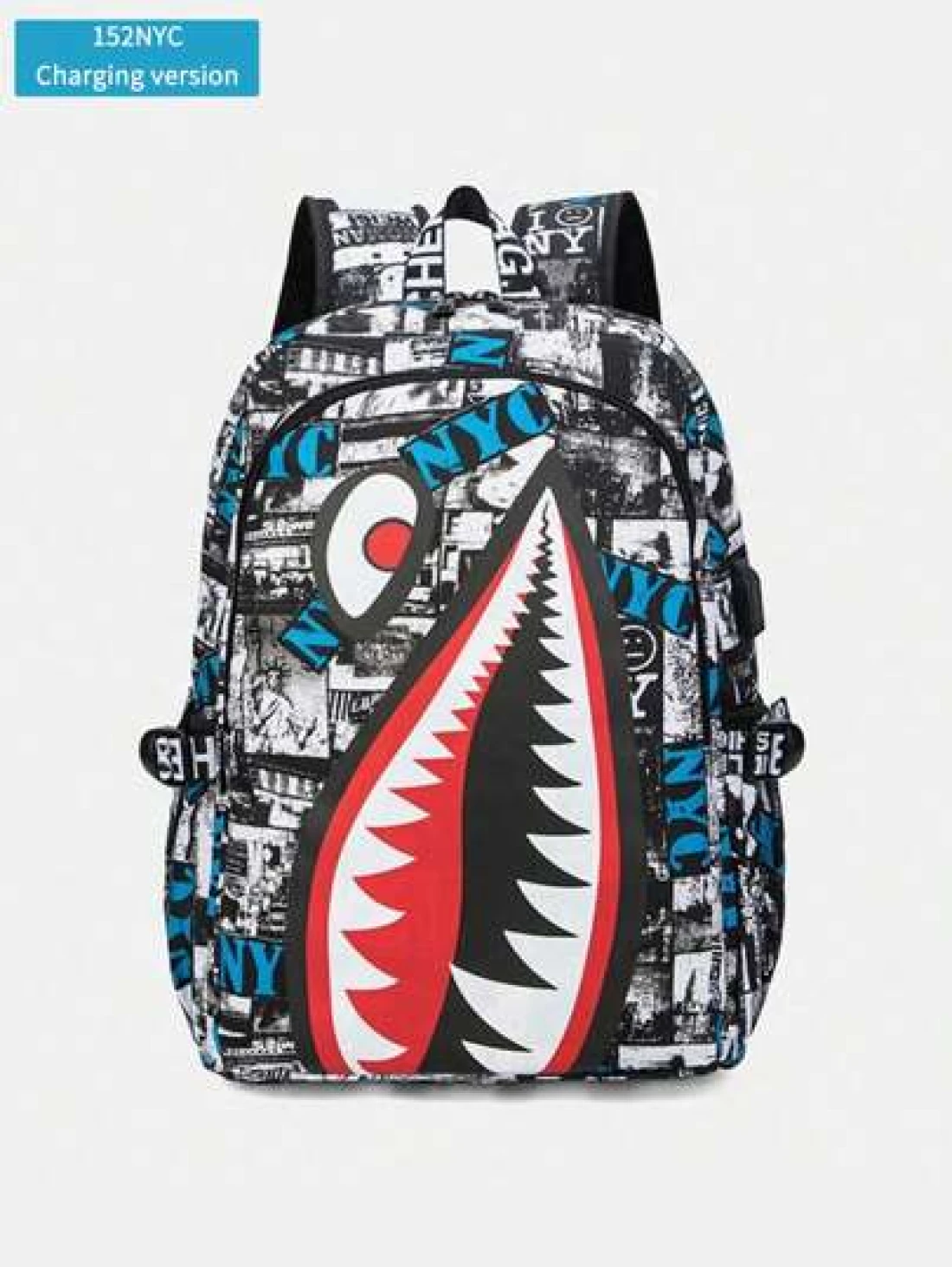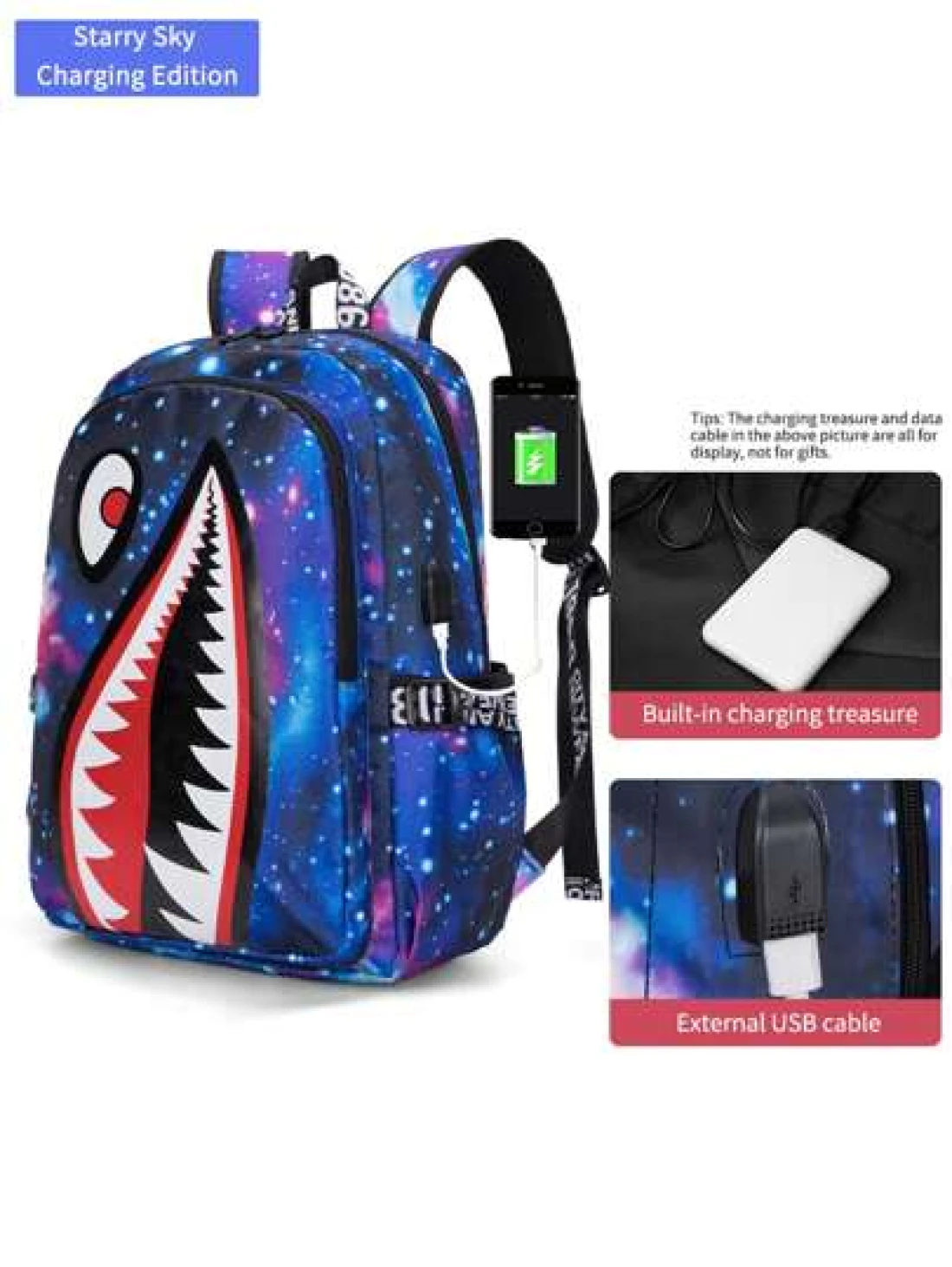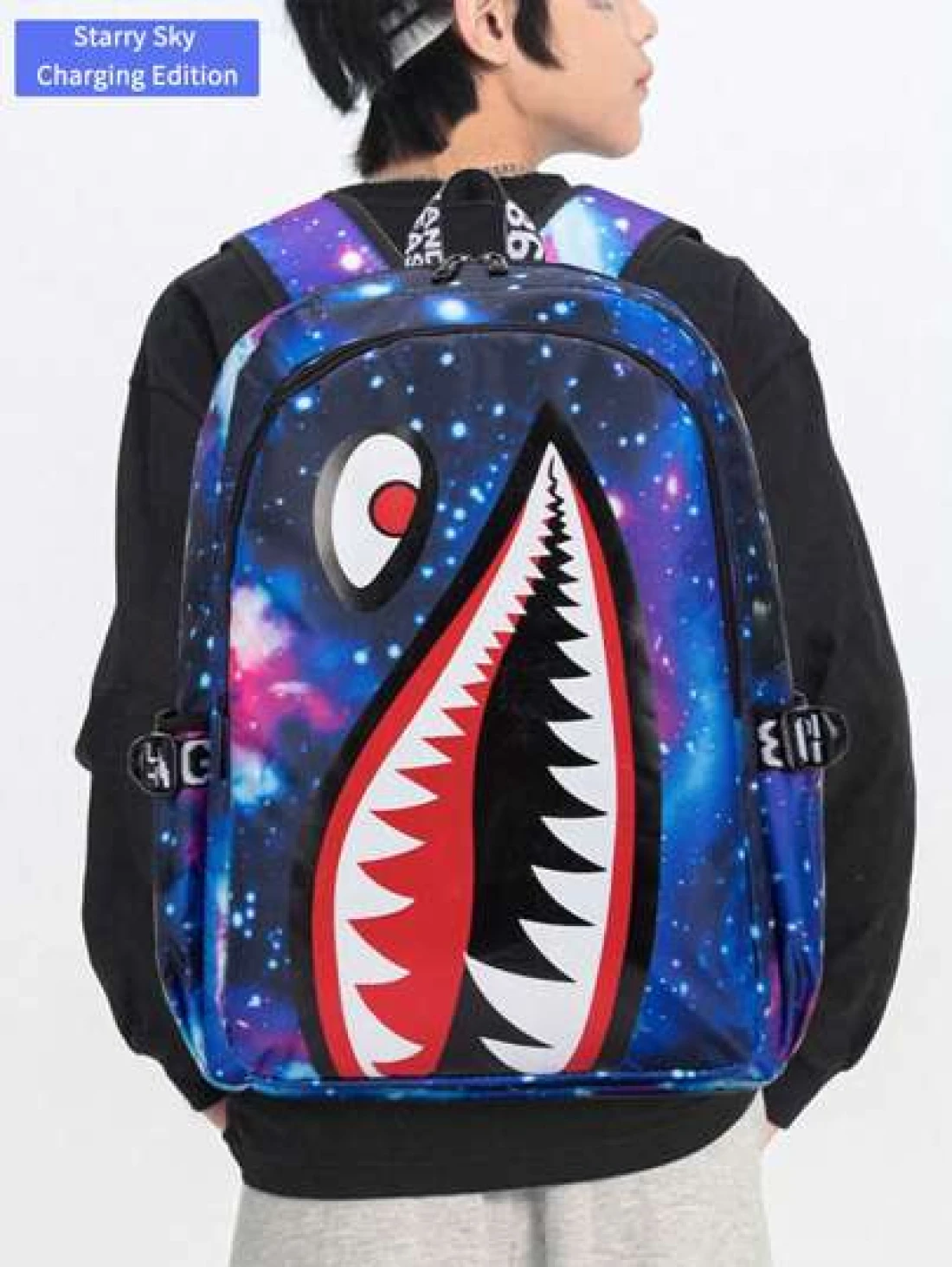Men s Fashionable Starry Sky Print Backpack Stylish Shark Mouth Print Bookbag With Random All Over Print USB Charging Port Large Capacity Lightweight Nylon Travel Bag University Commute Backpack Fits 14 Laptop Adjustable Shoulder Strap Personalized Gift For Men All Webbing Print Letters Random