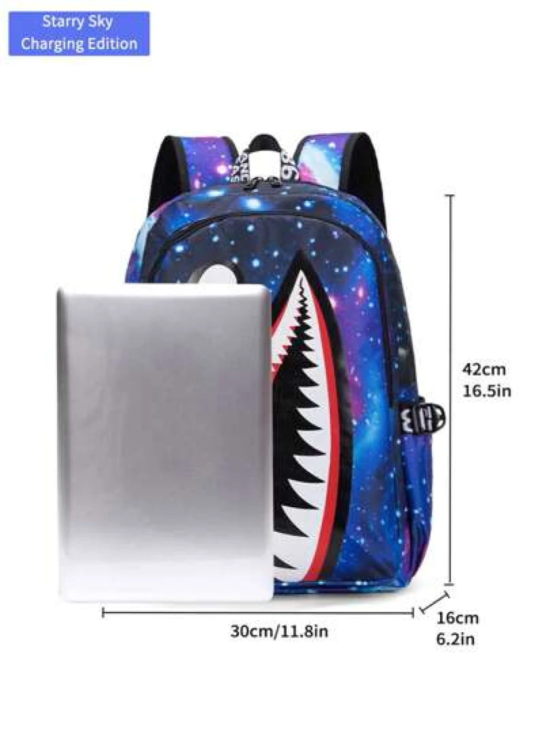 Men s Fashionable Starry Sky Print Backpack Stylish Shark Mouth Print Bookbag With Random All Over Print USB Charging Port Large Capacity Lightweight Nylon Travel Bag University Commute Backpack Fits