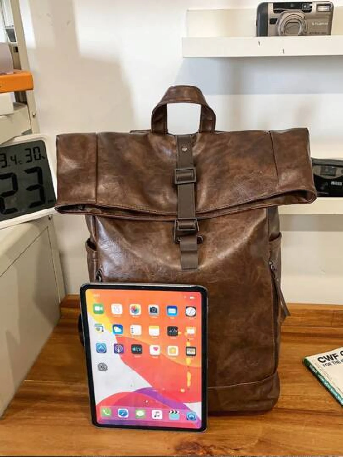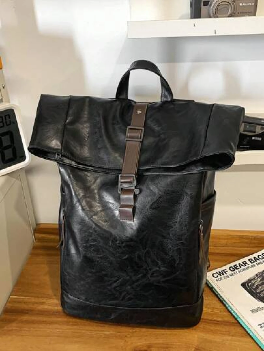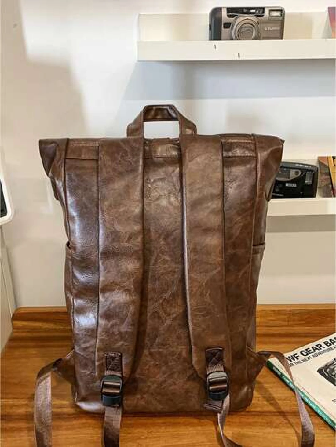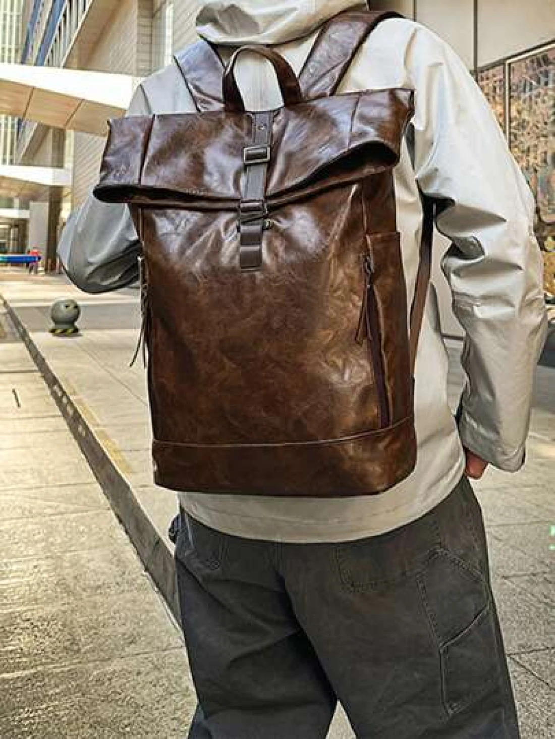 Backpack Flap Backpack Leather Backpack Large Capacity Oversized For Business Office Supplies Outdoor PU Leather Business Vintage Solid Color Men Gifts