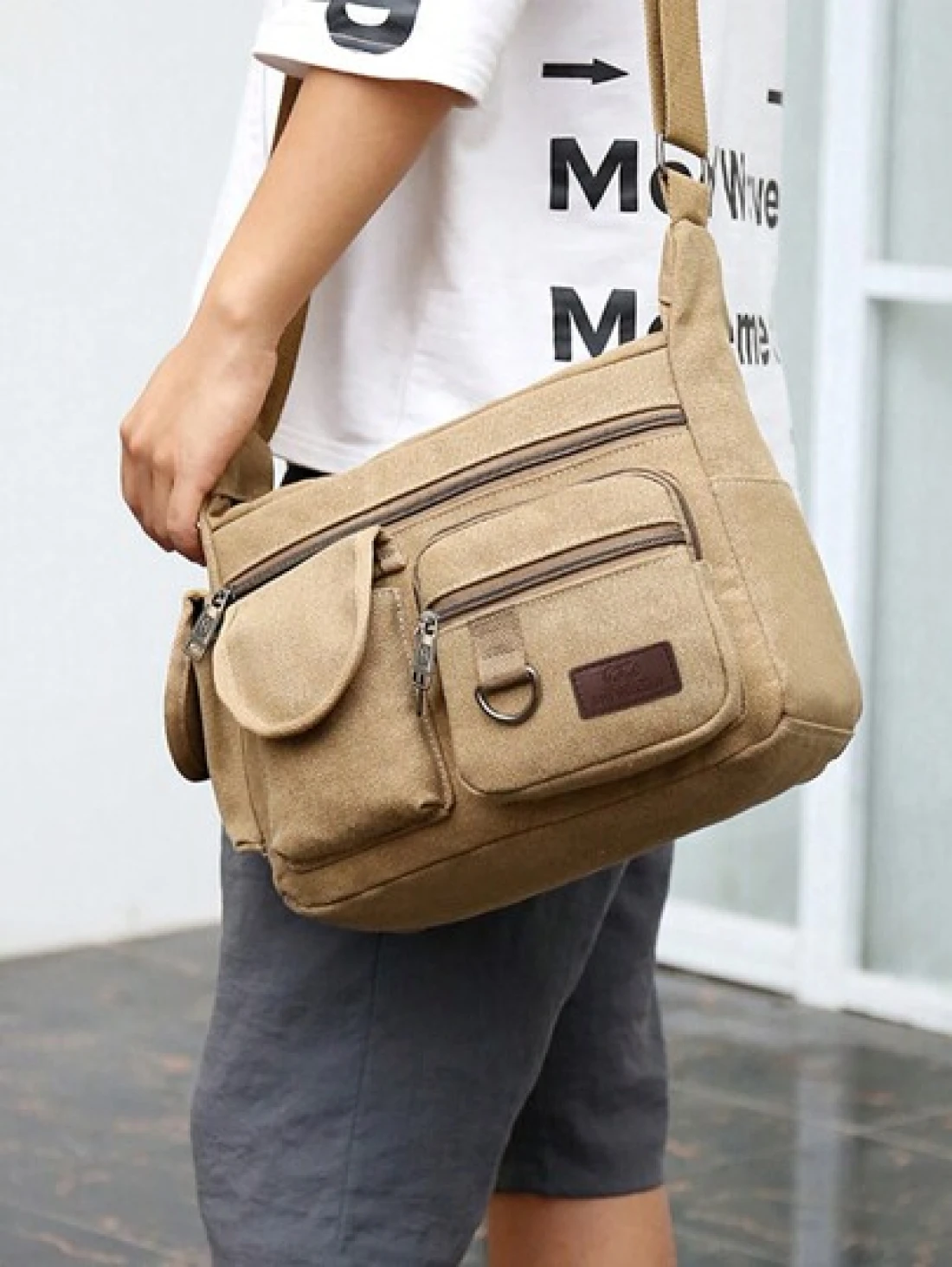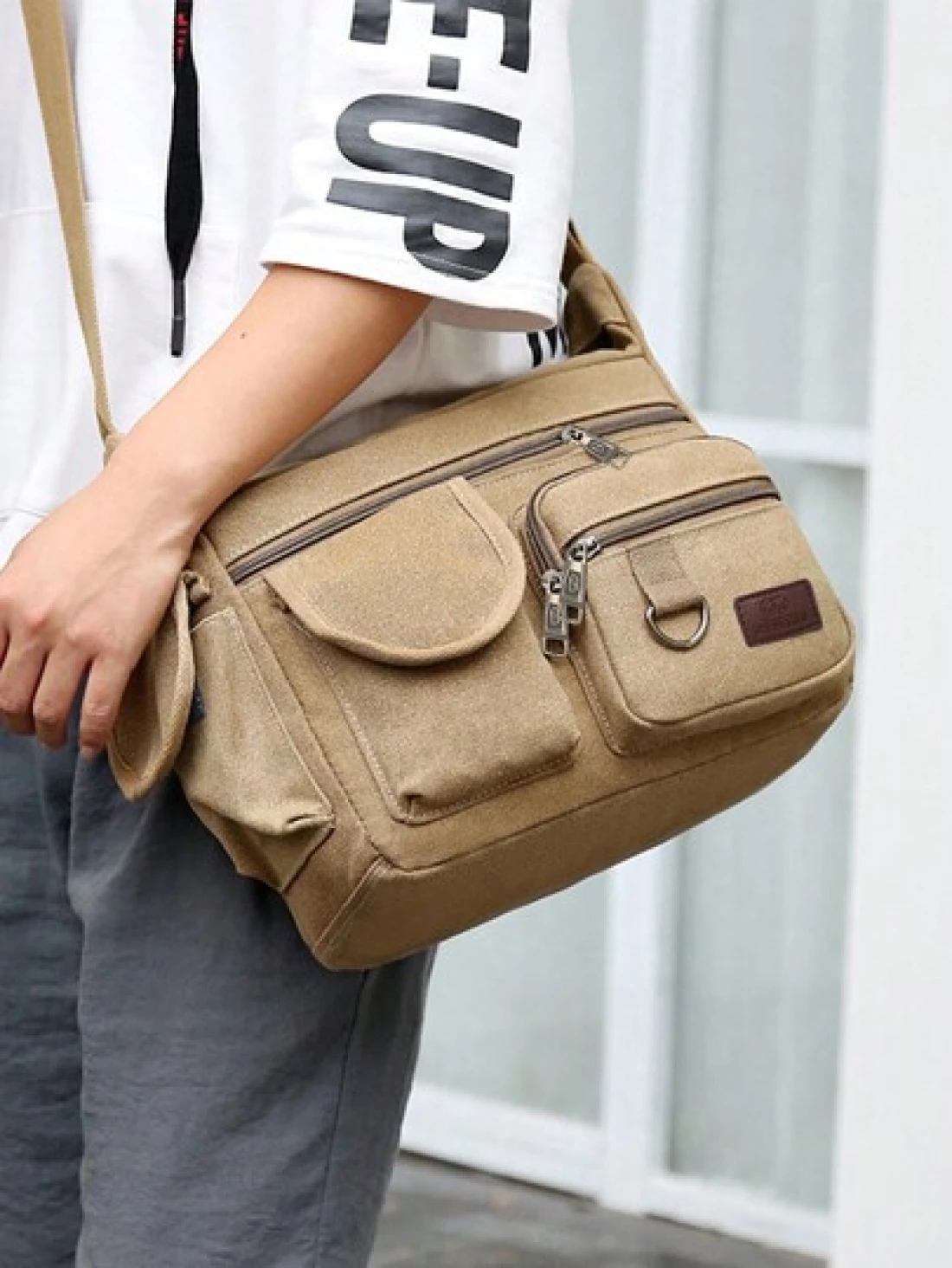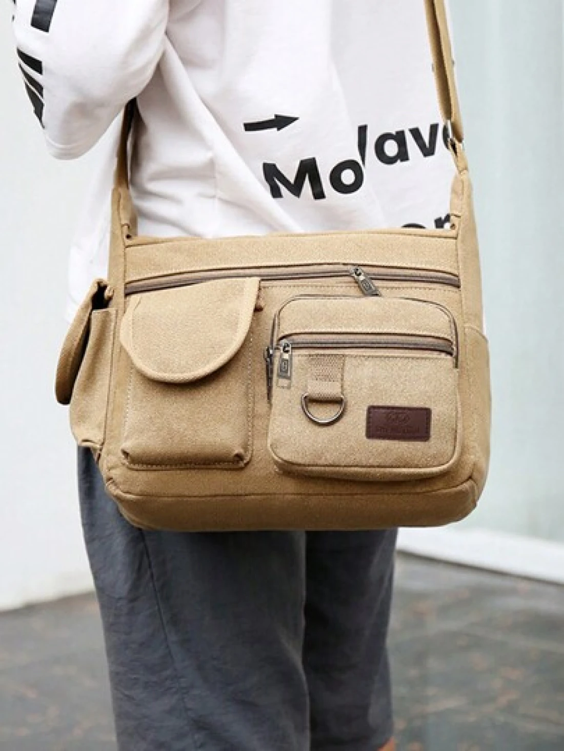 1Pc Khaki Canvas Shoulder Bag Large Capacity Multilayer Messenger Bag Student Travel Shoulder Bag Crossbody Bag Sling Bag For College School Lightweight Multifunctional Dad College Bag Freshman Multi